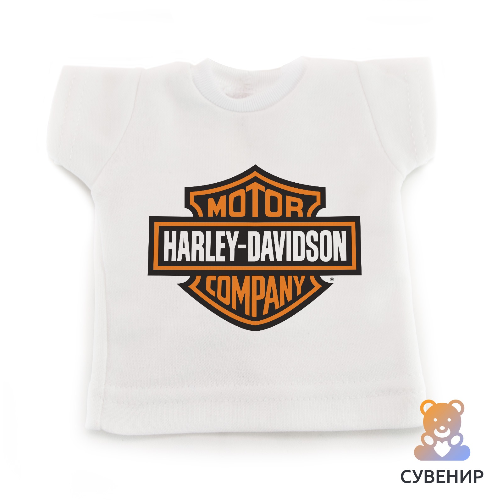 Сувенирная футболка это отличный подарок коллеге, другу или себе в машину ?Сувенирная футболка «Harley Davidson» подходит для подарка, украшает интерьер квартиры, машины и офиса. Благодаря своему маленькому размеру и прикольному дизайну, футболка однозначно привлекает внимание. Необычную мини - футболку можно использовать в разных целях. Кто-то вешает их на лобовом окне автомобиля, кто-то на стену дома или на холодильник, а кто-то надевает на своего любимого плюшевого друга. Удивите своих близких и друзей столь прикольным подарком. Мини - футболка выполнена из полиэстера или хлопка. Средние размеры футболки обычно достигают 17х18 см. Футболку также можно спокойно мыть, как в стиральной машине, так и вручную. Нанесенное изображение никак не пострадает от стирки.