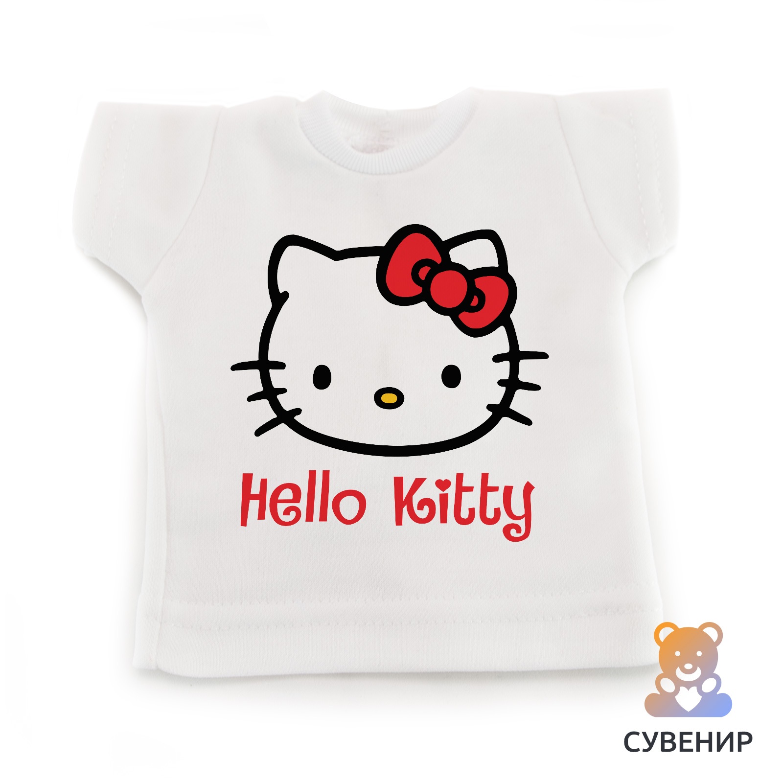 Сувенирная футболка это отличный подарок коллеге, другу или себе в машину ?Сувенирная футболка «Hello Kitty» подходит для подарка, украшает интерьер квартиры, машины и офиса. Благодаря своему маленькому размеру и прикольному дизайну, футболка однозначно привлекает внимание. Необычную мини - футболку можно использовать в разных целях. Кто-то вешает их на лобовом окне автомобиля, кто-то на стену дома или на холодильник, а кто-то надевает на своего любимого плюшевого друга. Удивите своих близких и друзей столь прикольным подарком. Мини - футболка выполнена из полиэстера или хлопка. Средние размеры футболки обычно достигают 17х18 см. Футболку также можно спокойно мыть, как в стиральной машине, так и вручную. Нанесенное изображение никак не пострадает от стирки.