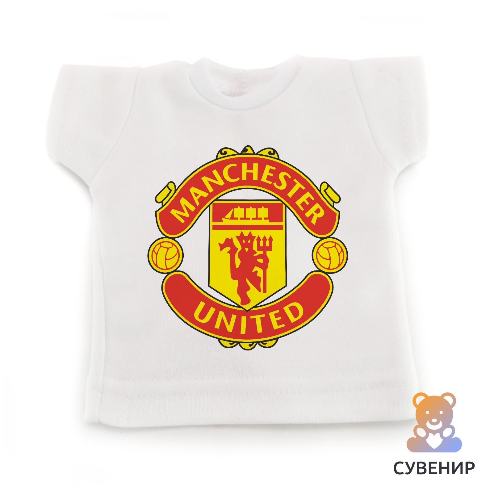 Сувенирная футболка это отличный подарок коллеге, другу или себе в машину ?Сувенирная футболка «Manchester United» подходит для подарка, украшает интерьер квартиры, машины и офиса. Благодаря своему маленькому размеру и прикольному дизайну, футболка однозначно привлекает внимание. Необычную мини - футболку можно использовать в разных целях. Кто-то вешает их на лобовом окне автомобиля, кто-то на стену дома или на холодильник, а кто-то надевает на своего любимого плюшевого друга. Удивите своих близких и друзей столь прикольным подарком. Мини - футболка выполнена из полиэстера или хлопка. Средние размеры футболки обычно достигают 17х18 см. Футболку также можно спокойно мыть, как в стиральной машине, так и вручную. Нанесенное изображение никак не пострадает от стирки.