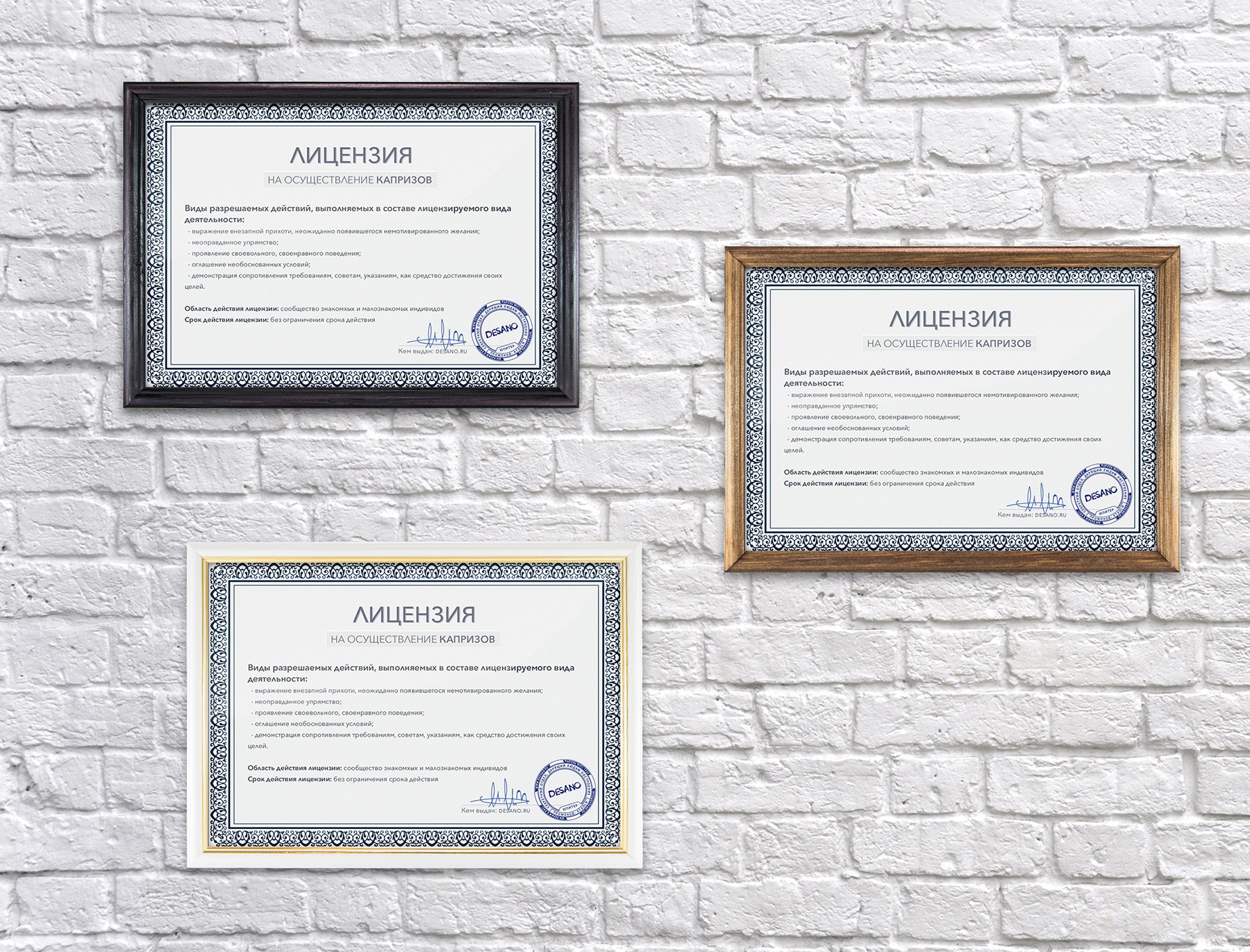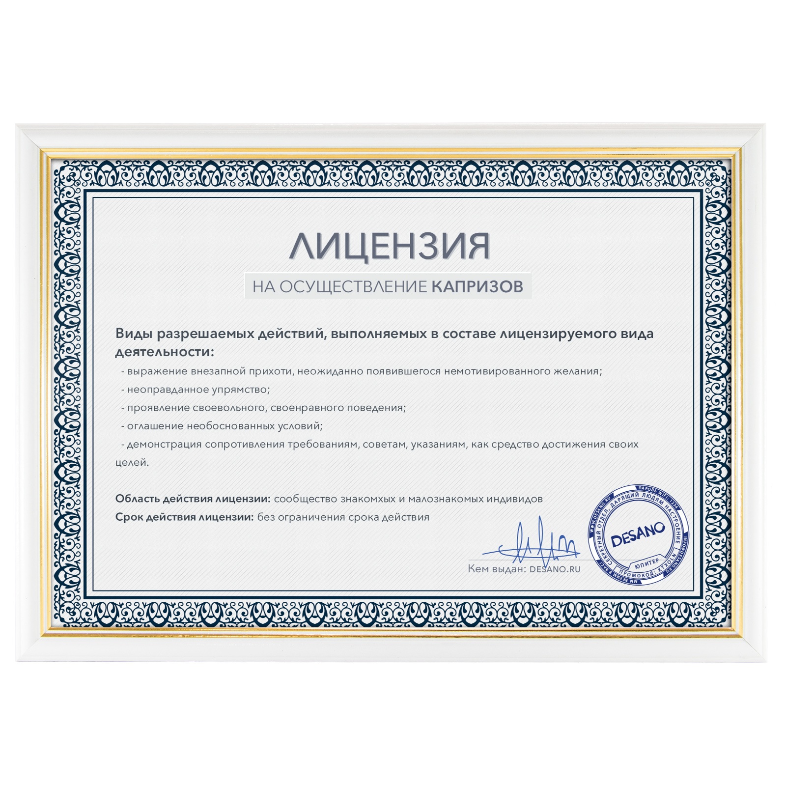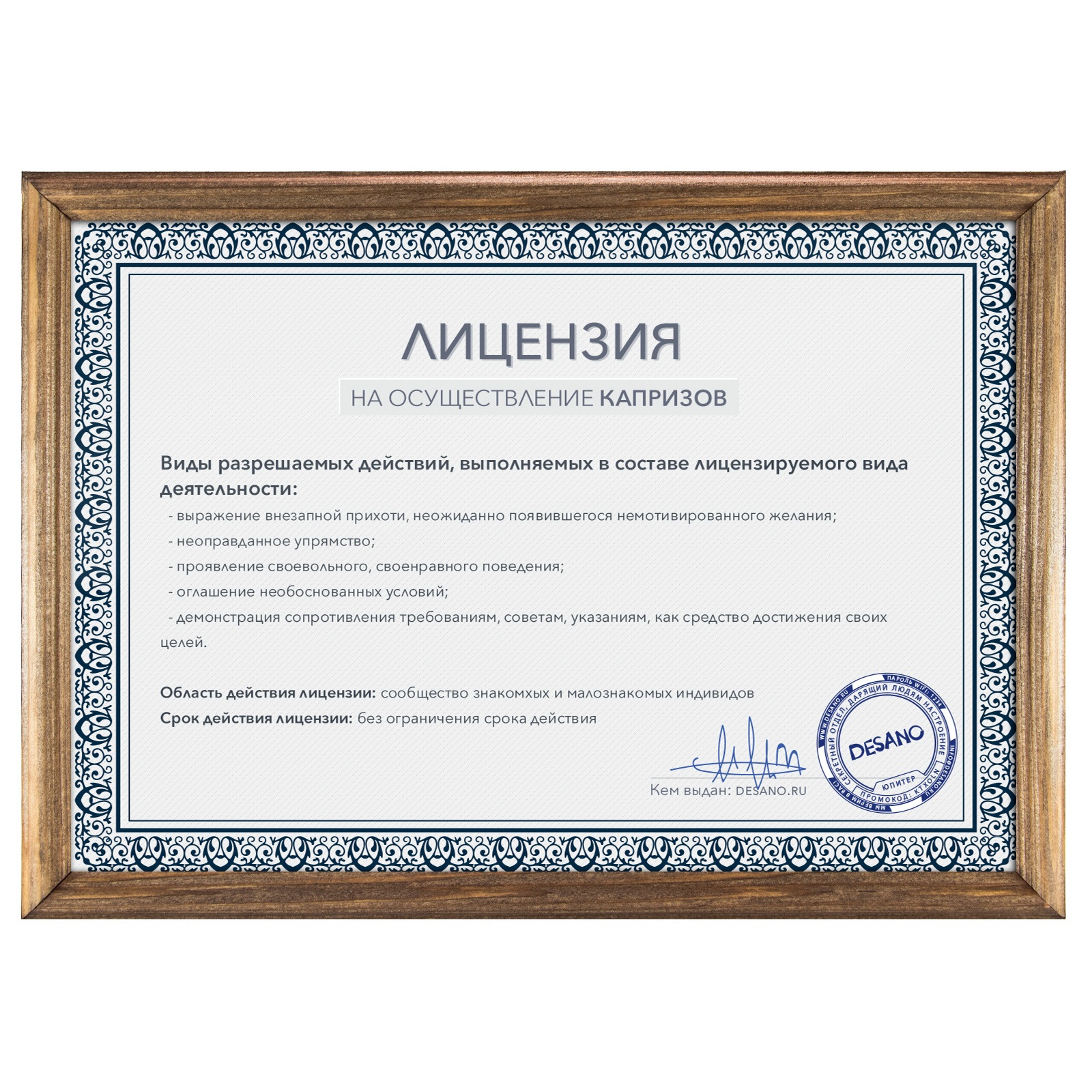 Подарочная лицензия на осуществление капризов в фоторамке А4 будет отличным подарком для вашей леди. Сертификат печатается на матовой или глянцевой фотобумаге с помощью высокоточного принтера, что делает его ярким и насыщенным. Рамка сертификата выполнена из дерева, имеющая матовую поверхность. Вставка реализована из высокопрочного акрила, что гарантирует долговечность и ударопрочность, даже, если вы его случайно уроните. Вы с лёгкостью можете заменить фото на своё. Толщина багета составляет всего 2см, что позволяет картинке отлично вписаться в ваш интерьер.