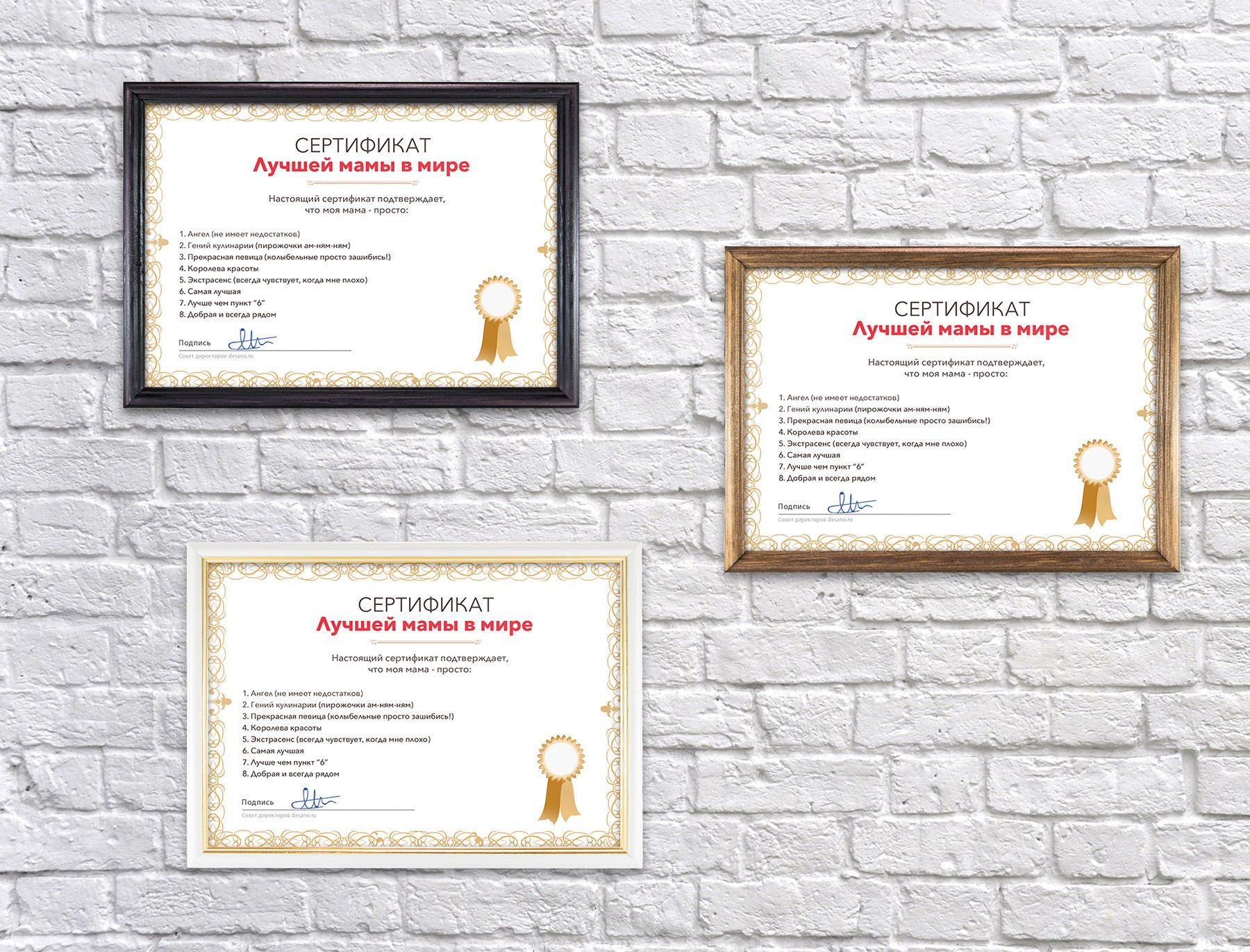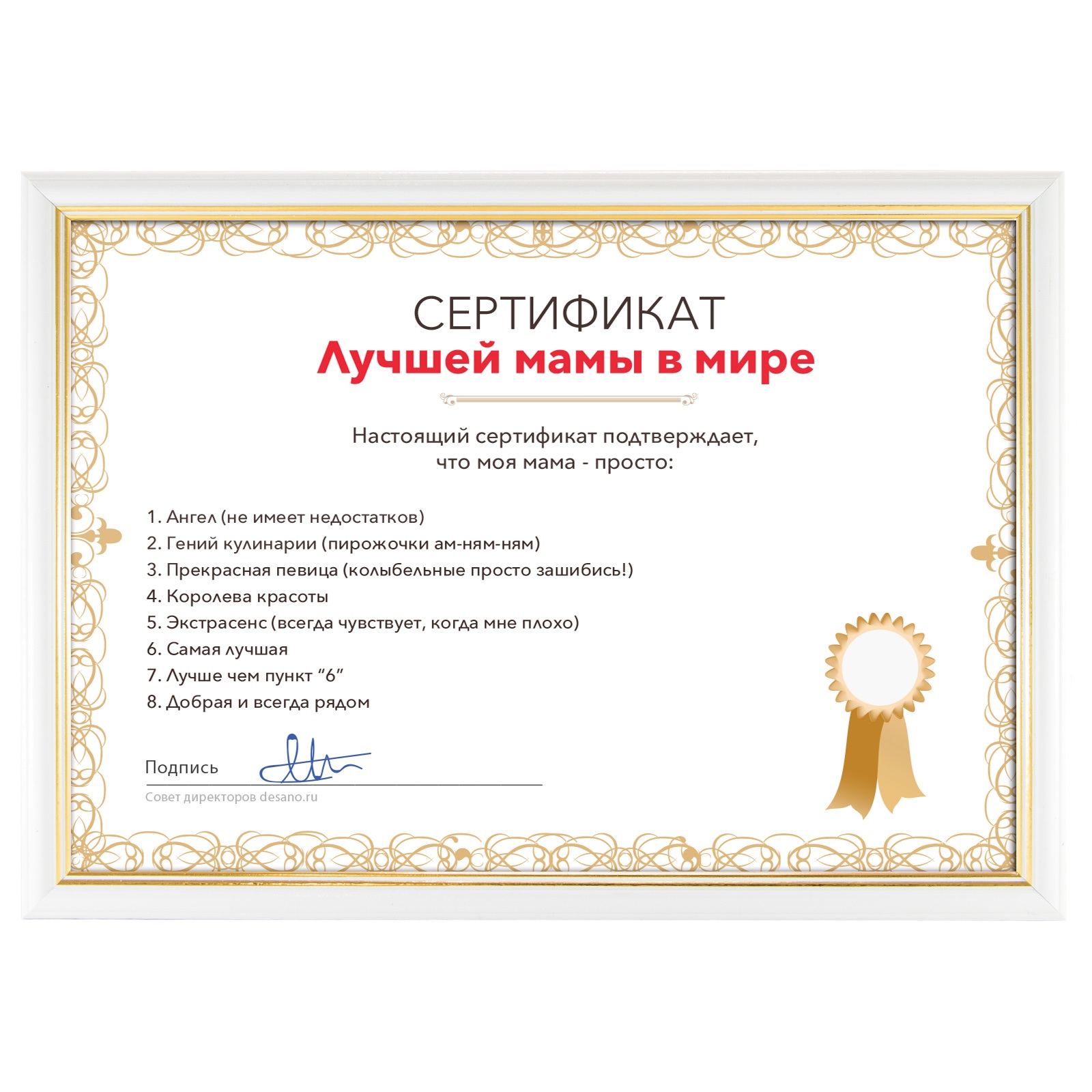 Все люди любят интересные и удивительные подарки, в связи с чем можно купить сертификат лучшей мамы в мире, который будет каждый раз напоминать о вас, ведь он станет частью интерьера именинника.