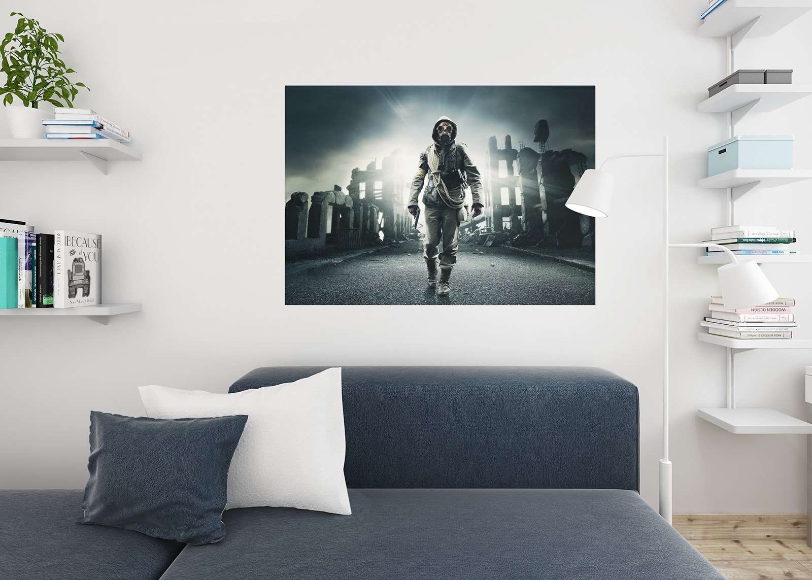 Постер S.T.A.L.K.E.R., формата A1, печатается на специальной постерной бумаге. Современная постерная бумага не имеет ничего общего с той, на которой печатают календари и афиши. Подобные плакаты обычно печатаются на недорогой глянцевой бумаге, которая повреждается при малейшем воздействии. Постерная же бумага, с которой работаем мы, в разы крепче и прочнее. Ее плотность в среднем составляет 190 г/м2, что сопоставимо с фотобумагой. Данная бумага позволяет применять достаточное количество чернил, которые не растекаются, что и обеспечивает хорошее качество печати плакатов. И если даже ваш постер испачкался, можно смело протереть влажной салфеткой – повреждений не будет!