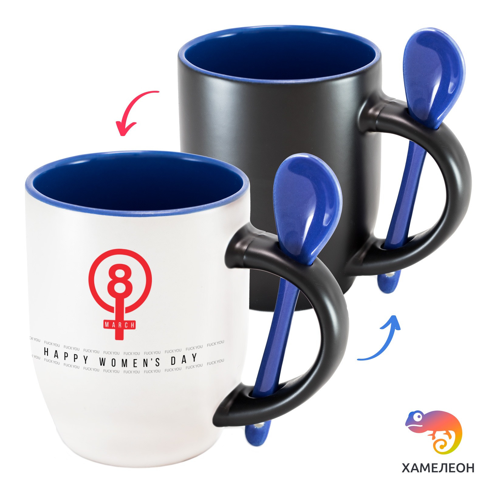 Кружка с принтом является отличным подарком коллеге, другу или самому себе ?Оригинальная кружка хамелеон 8th March - Women's Day (Fuck You) с ложкой приукрасит ваши будни или станет отличным подарком. Кружка изготовлена из высококачественной керамики, а специальный термопегментный слой позволяет ей менять цвет, в зависимости от температуры. Изначально кружка имеет черную заливку, которая становится белой, когда вы наливаете кипяток. Термопегменты становятся прозрачными, начиная с 50°C. Под черным пегментным слоем скрываются необычные рисунки, которые удивят многих.