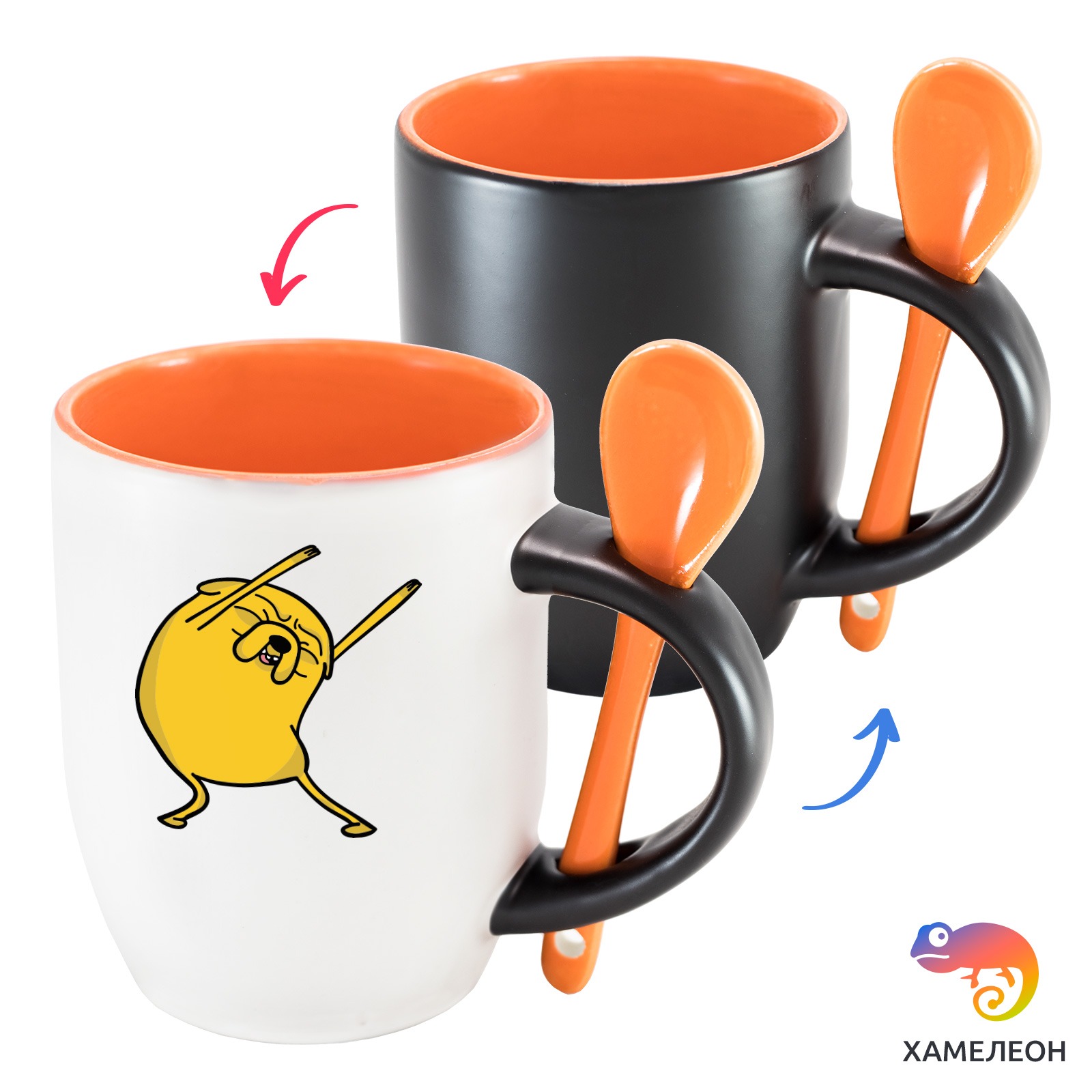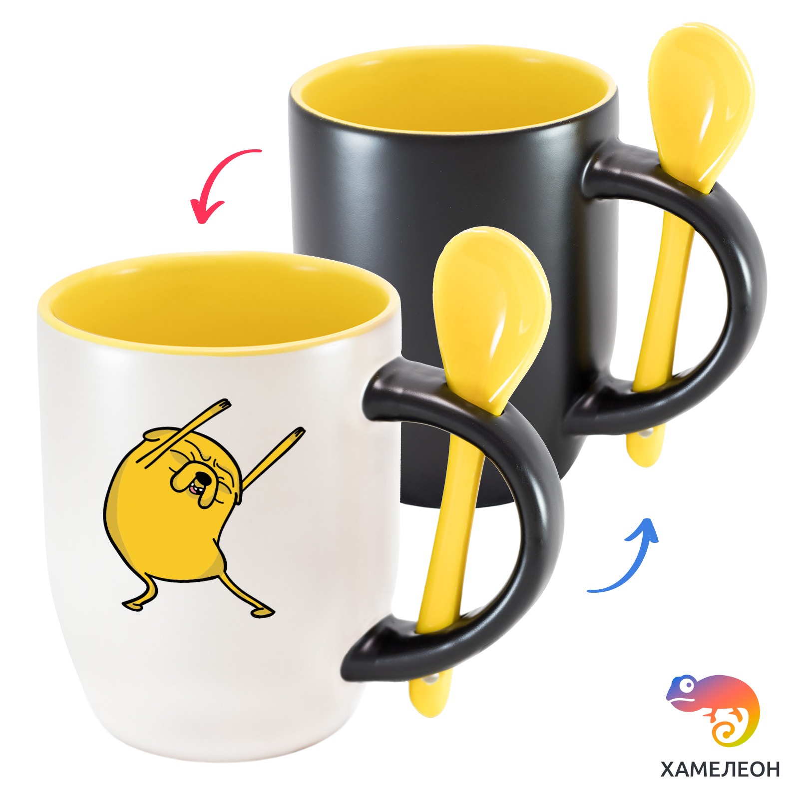 Кружка с принтом является отличным подарком коллеге, другу или самому себе ?Оригинальная кружка хамелеон Adventure Time: Jake the dog с ложкой приукрасит ваши будни или станет отличным подарком. Кружка изготовлена из высококачественной керамики, а специальный термопегментный слой позволяет ей менять цвет, в зависимости от температуры. Изначально кружка имеет черную заливку, которая становится белой, когда вы наливаете кипяток. Термопегменты становятся прозрачными, начиная с 50°C. Под черным пегментным слоем скрываются необычные рисунки, которые удивят многих.