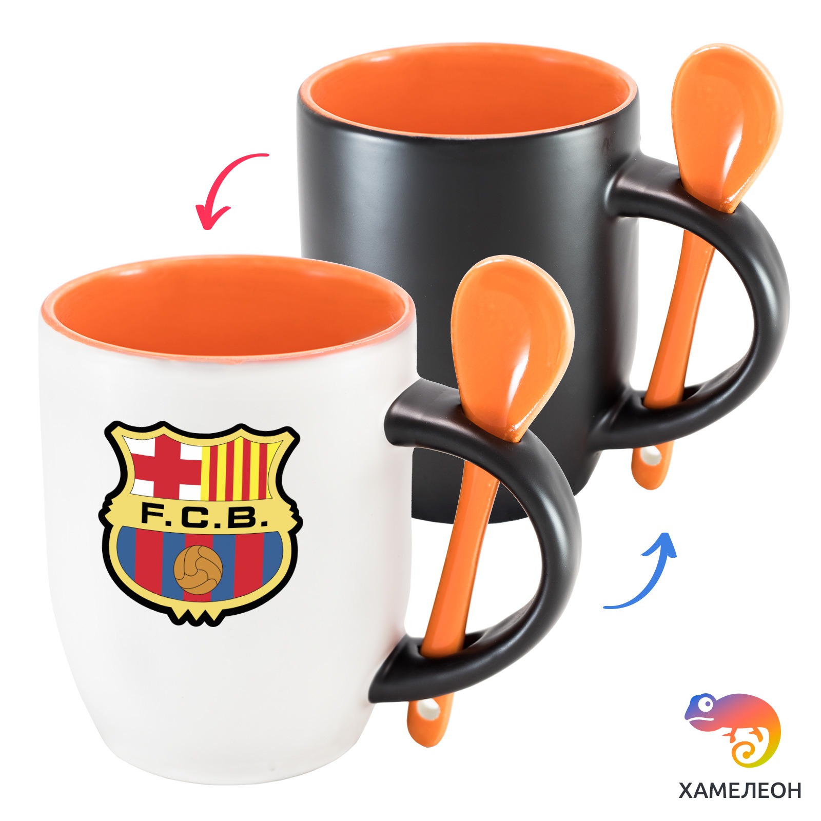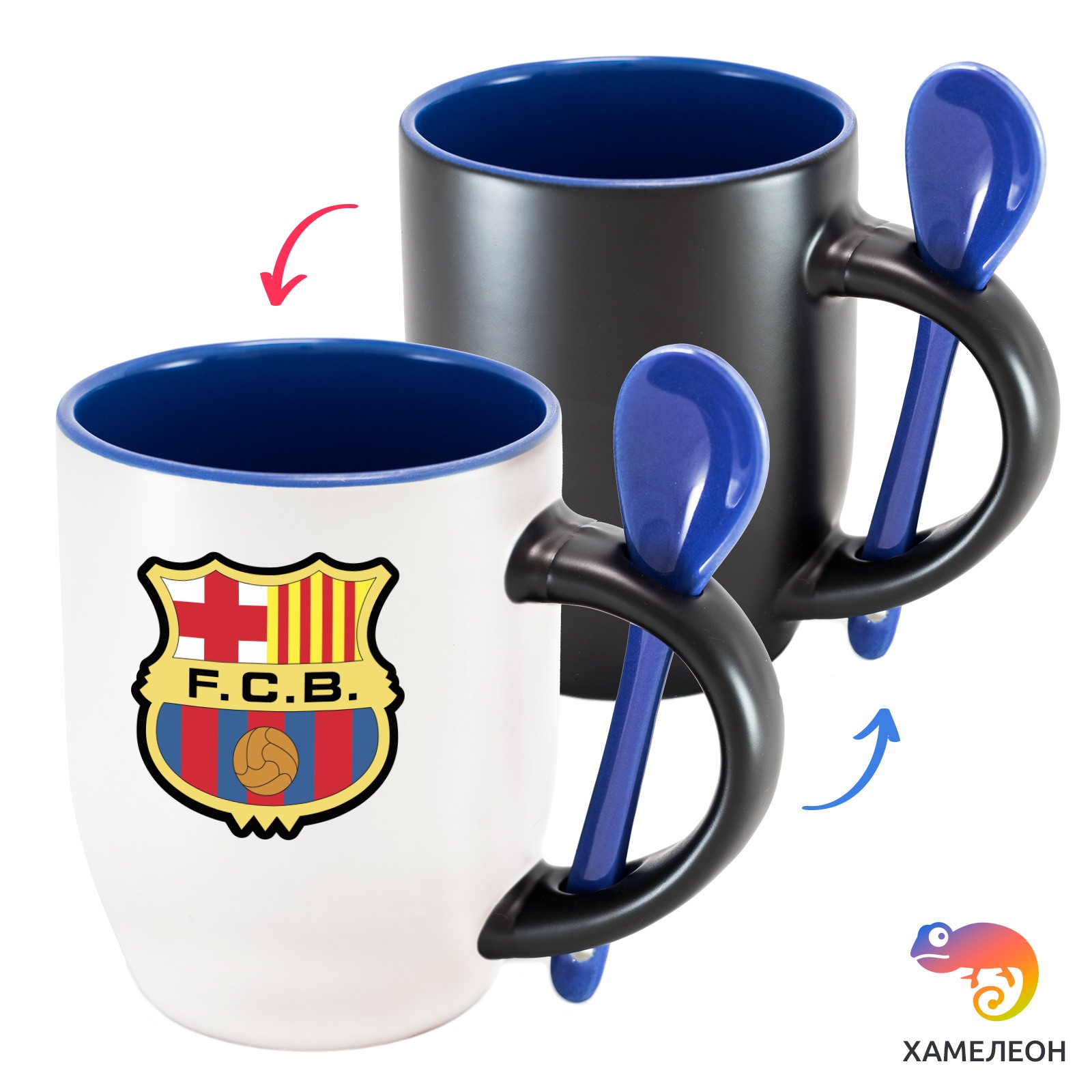 Кружка с принтом является отличным подарком коллеге, другу или самому себе ?Оригинальная кружка хамелеон Barcelona (ФК) с ложкой приукрасит ваши будни или станет отличным подарком. Кружка изготовлена из высококачественной керамики, а специальный термопегментный слой позволяет ей менять цвет, в зависимости от температуры. Изначально кружка имеет черную заливку, которая становится белой, когда вы наливаете кипяток. Термопегменты становятся прозрачными, начиная с 50°C. Под черным пегментным слоем скрываются необычные рисунки, которые удивят многих.