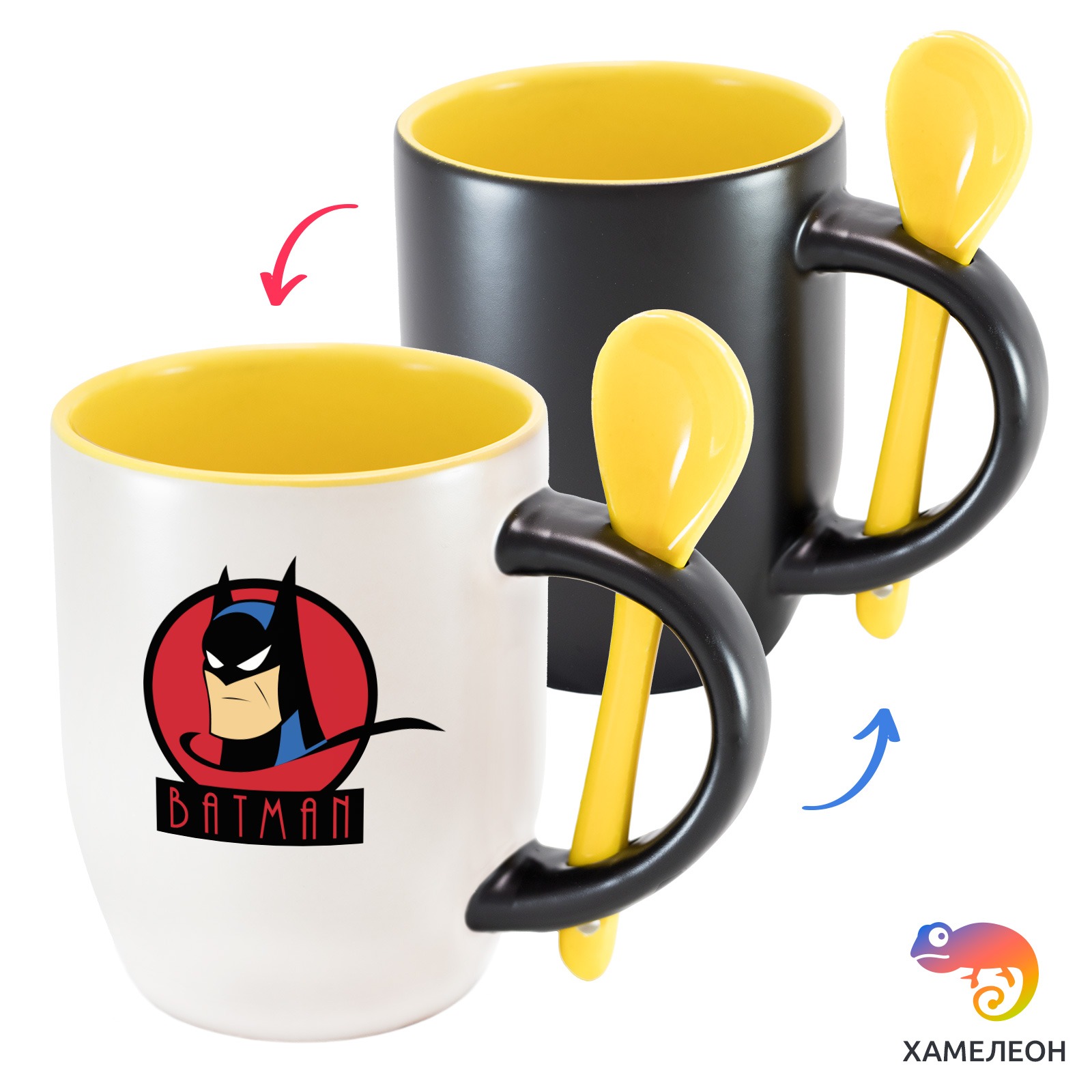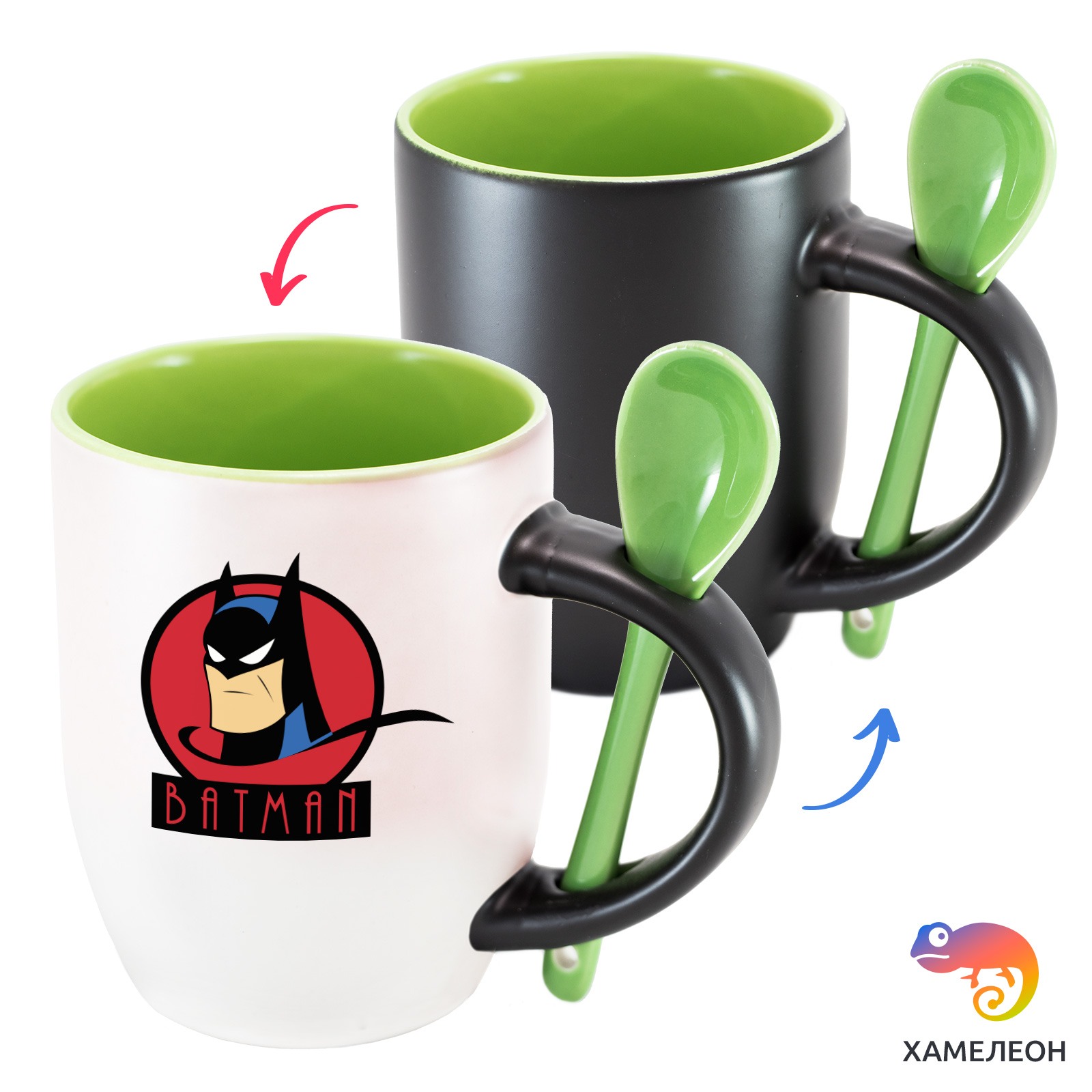 Кружка с принтом является отличным подарком коллеге, другу или самому себе ?Оригинальная кружка хамелеон Batman с ложкой приукрасит ваши будни или станет отличным подарком. Кружка изготовлена из высококачественной керамики, а специальный термопегментный слой позволяет ей менять цвет, в зависимости от температуры. Изначально кружка имеет черную заливку, которая становится белой, когда вы наливаете кипяток. Термопегменты становятся прозрачными, начиная с 50°C. Под черным пегментным слоем скрываются необычные рисунки, которые удивят многих.