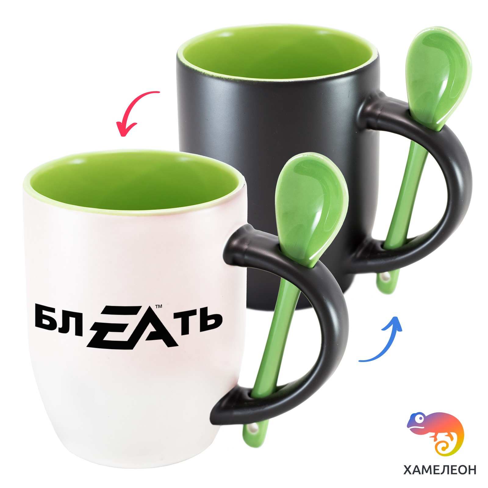 Кружка с принтом является отличным подарком коллеге, другу или самому себе ?Оригинальная кружка хамелеон «блEAть» с ложкой приукрасит ваши будни или станет отличным подарком. Кружка изготовлена из высококачественной керамики, а специальный термопегментный слой позволяет ей менять цвет, в зависимости от температуры. Изначально кружка имеет черную заливку, которая становится белой, когда вы наливаете кипяток. Термопегменты становятся прозрачными, начиная с 50°C. Под черным пегментным слоем скрываются необычные рисунки, которые удивят многих.