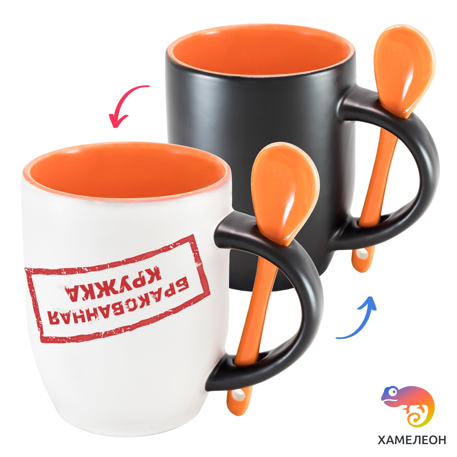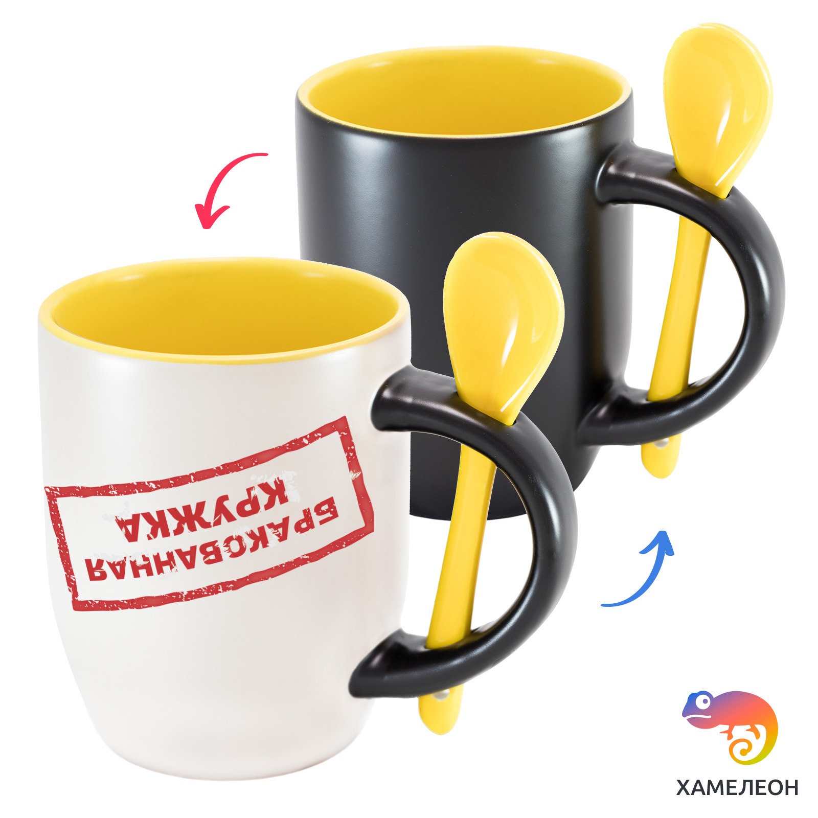 Кружка с принтом является отличным подарком коллеге, другу или самому себе ?Оригинальная кружка хамелеон с надписью «Бракованная кружка» с ложкой приукрасит ваши будни или станет отличным подарком. Кружка изготовлена из высококачественной керамики, а специальный термопегментный слой позволяет ей менять цвет, в зависимости от температуры. Изначально кружка имеет черную заливку, которая становится белой, когда вы наливаете кипяток. Термопегменты становятся прозрачными, начиная с 50°C. Под черным пегментным слоем скрываются необычные рисунки, которые удивят многих.
