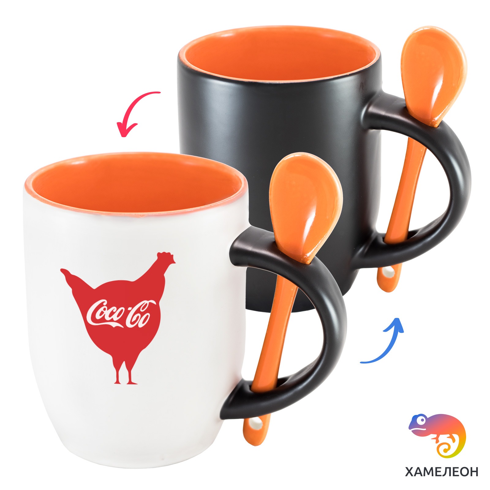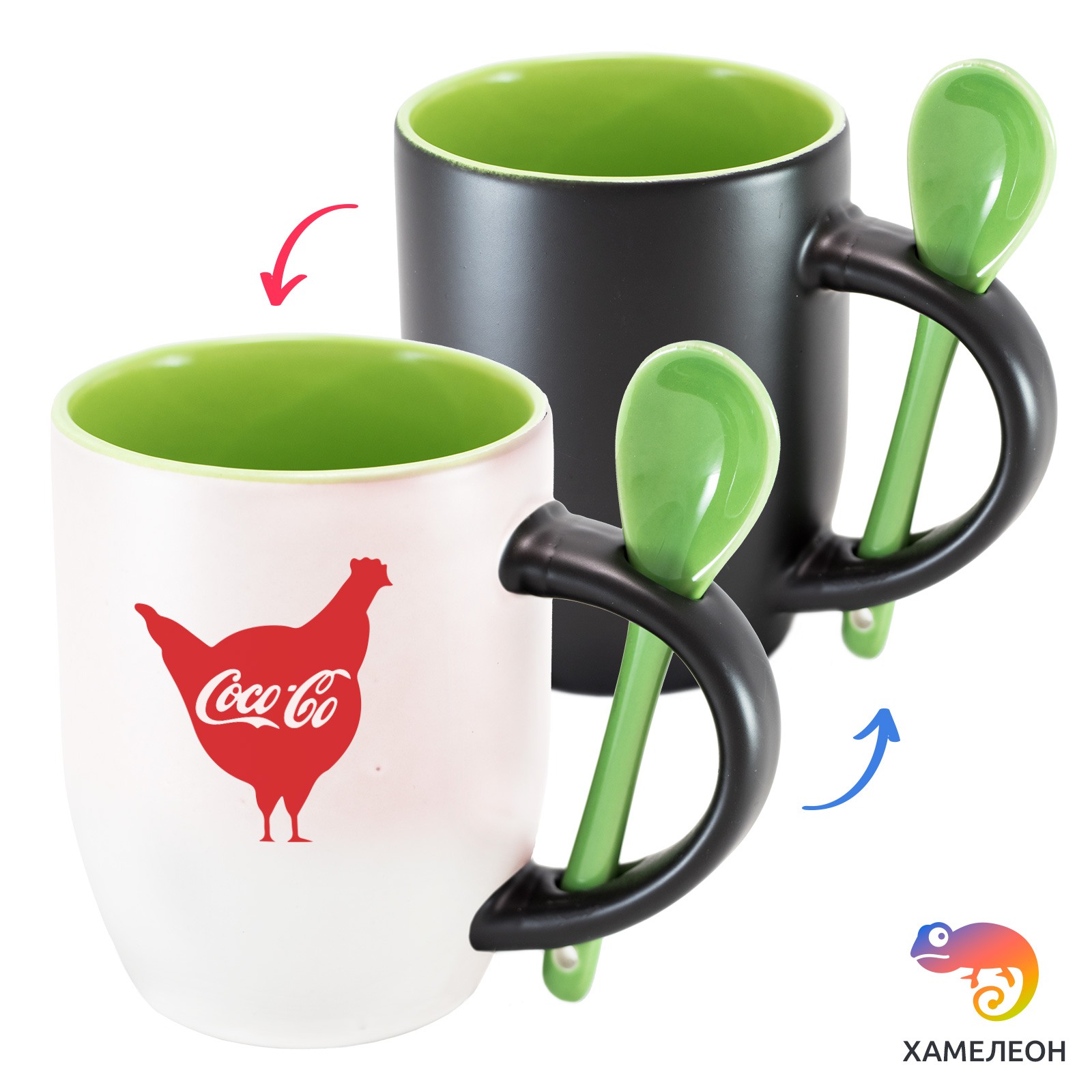 Кружка с принтом является отличным подарком коллеге, другу или самому себе ?Оригинальная кружка хамелеон Coco co с ложкой приукрасит ваши будни или станет отличным подарком. Кружка изготовлена из высококачественной керамики, а специальный термопегментный слой позволяет ей менять цвет, в зависимости от температуры. Изначально кружка имеет черную заливку, которая становится белой, когда вы наливаете кипяток. Термопегменты становятся прозрачными, начиная с 50°C. Под черным пегментным слоем скрываются необычные рисунки, которые удивят многих.