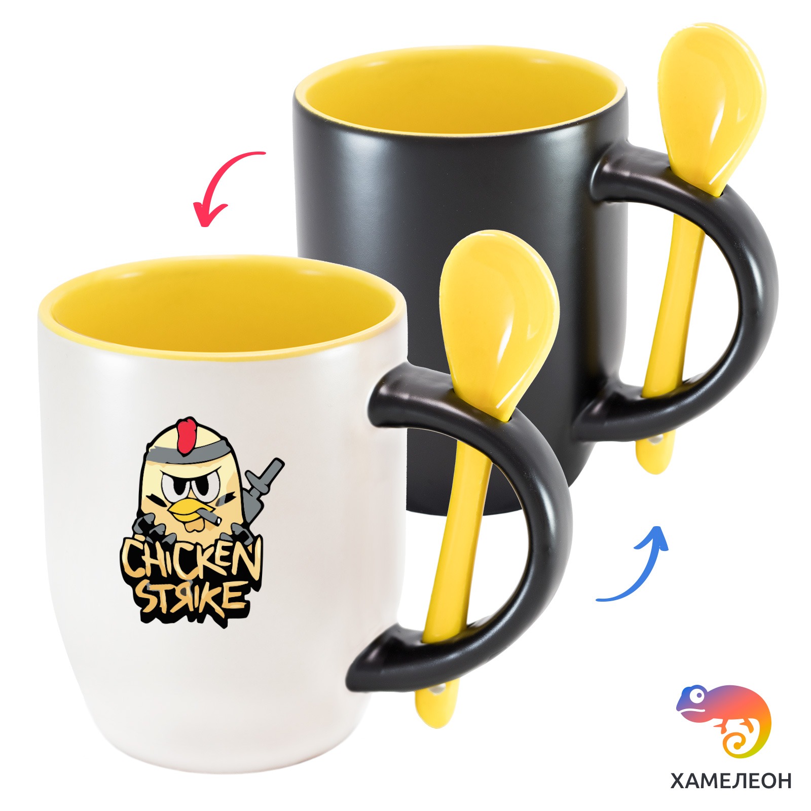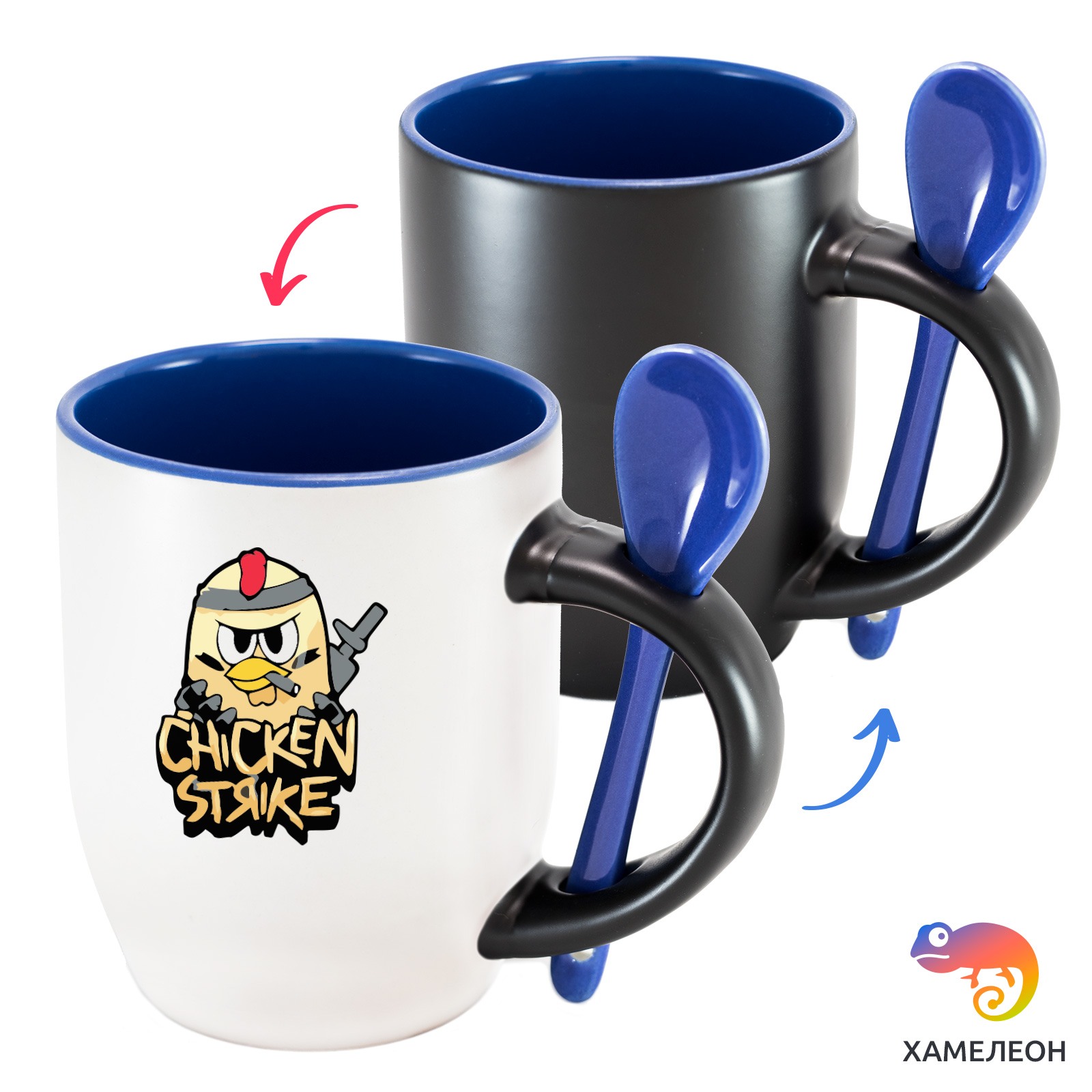 Кружка с принтом является отличным подарком коллеге, другу или самому себе ?Оригинальная кружка хамелеон CS:GO - Chicken Strike с ложкой приукрасит ваши будни или станет отличным подарком. Кружка изготовлена из высококачественной керамики, а специальный термопегментный слой позволяет ей менять цвет, в зависимости от температуры. Изначально кружка имеет черную заливку, которая становится белой, когда вы наливаете кипяток. Термопегменты становятся прозрачными, начиная с 50°C. Под черным пегментным слоем скрываются необычные рисунки, которые удивят многих.
