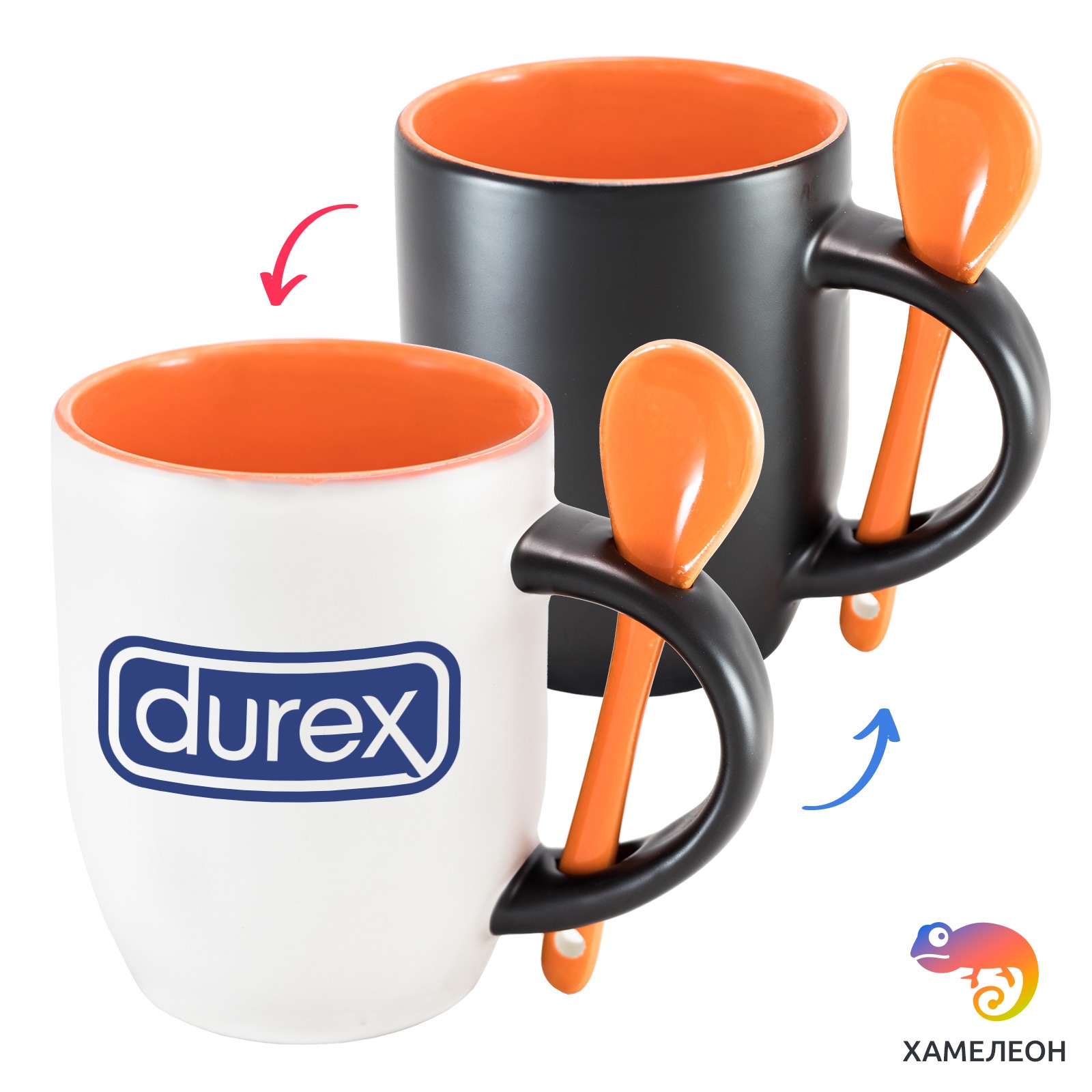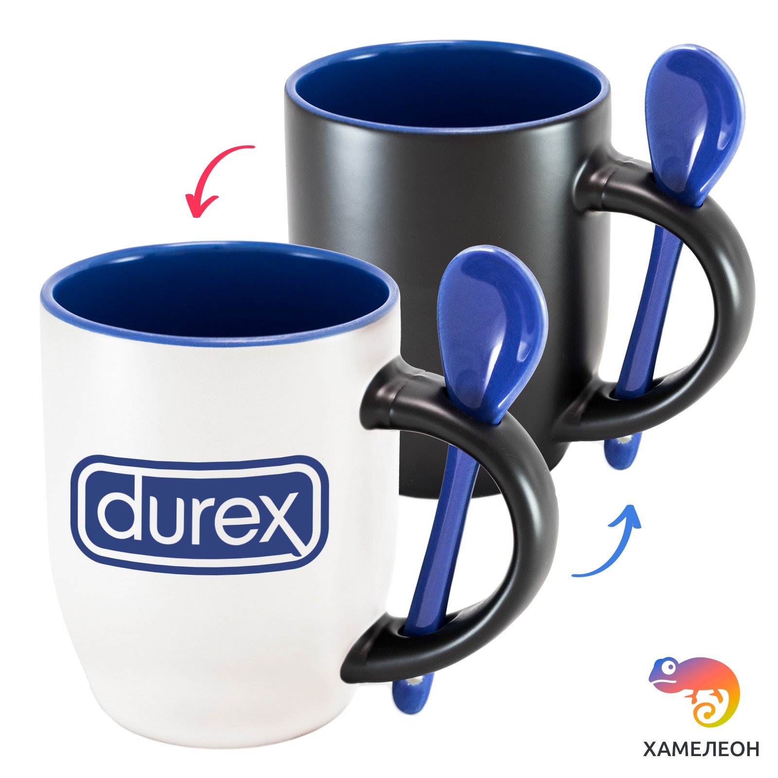 Кружка с принтом является отличным подарком коллеге, другу или самому себе ?Оригинальная кружка хамелеон Durex ложкой приукрасит ваши будни или станет отличным подарком. Кружка изготовлена из высококачественной керамики, а специальный термопегментный слой позволяет ей менять цвет, в зависимости от температуры. Изначально кружка имеет черную заливку, которая становится белой, когда вы наливаете кипяток. Термопегменты становятся прозрачными, начиная с 50°C. Под черным пегментным слоем скрываются необычные рисунки, которые удивят многих.