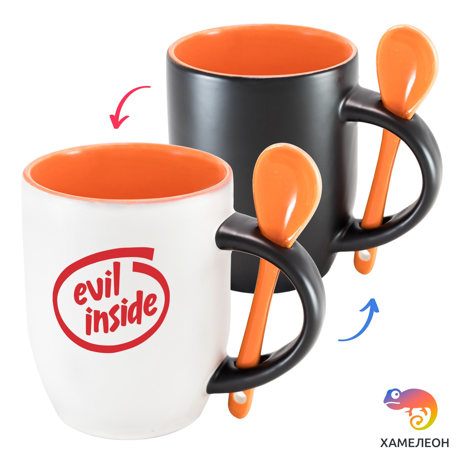 Кружка с принтом является отличным подарком коллеге, другу или самому себе ?Оригинальная кружка хамелеон Evil Inside с ложкой приукрасит ваши будни или станет отличным подарком. Кружка изготовлена из высококачественной керамики, а специальный термопегментный слой позволяет ей менять цвет, в зависимости от температуры. Изначально кружка имеет черную заливку, которая становится белой, когда вы наливаете кипяток. Термопегменты становятся прозрачными, начиная с 50°C. Под черным пегментным слоем скрываются необычные рисунки, которые удивят многих.