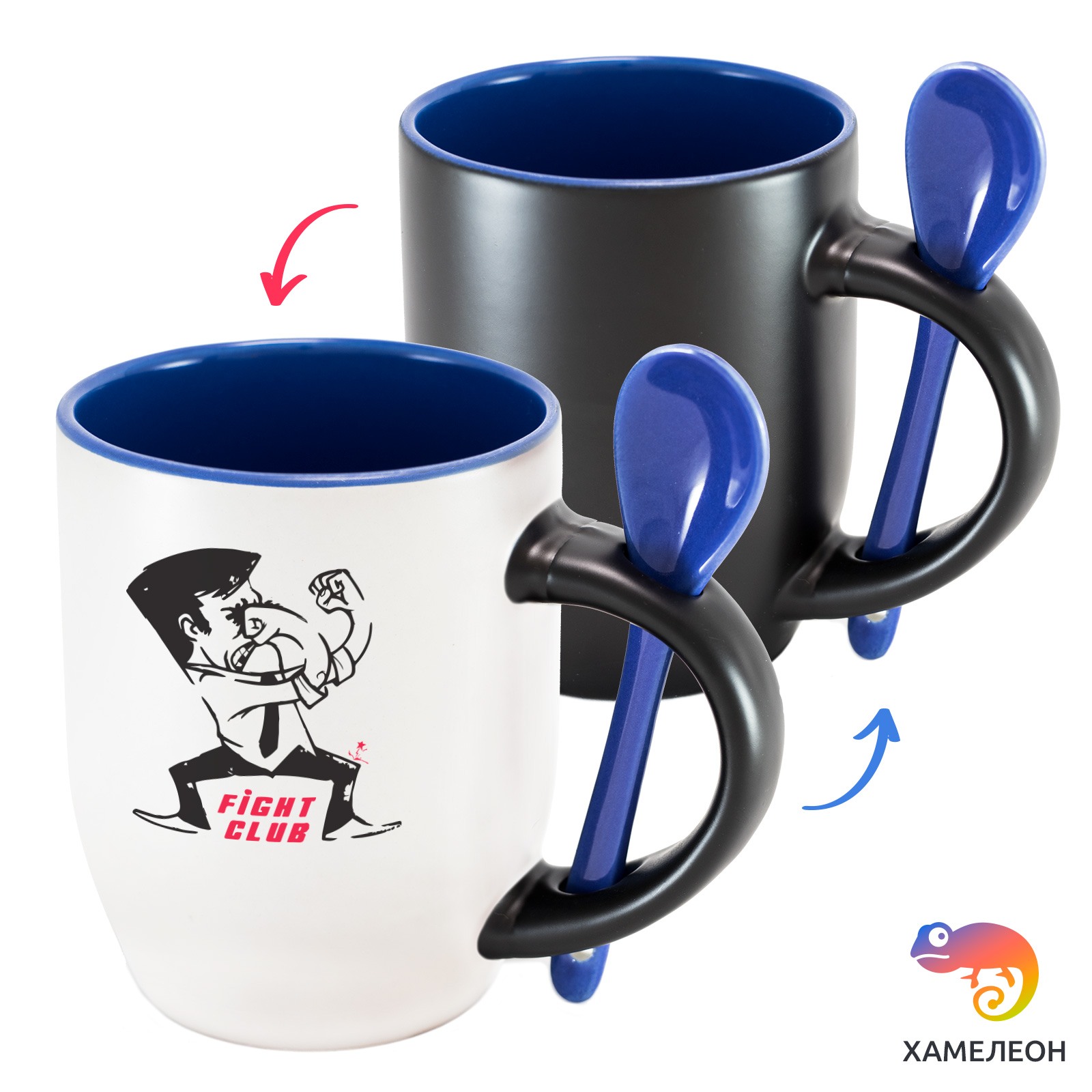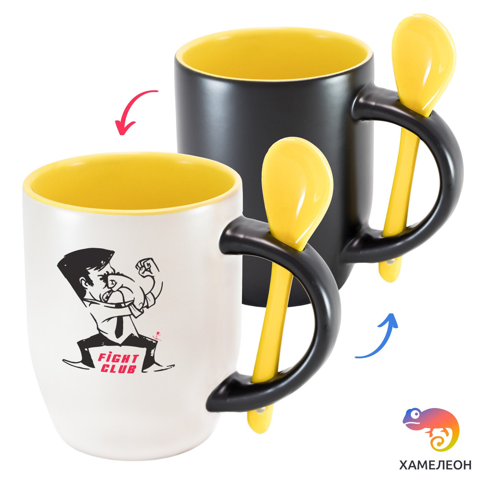 Кружка с принтом является отличным подарком коллеге, другу или самому себе ?Оригинальная кружка хамелеон Fight Club с ложкой приукрасит ваши будни или станет отличным подарком. Кружка изготовлена из высококачественной керамики, а специальный термопегментный слой позволяет ей менять цвет, в зависимости от температуры. Изначально кружка имеет черную заливку, которая становится белой, когда вы наливаете кипяток. Термопегменты становятся прозрачными, начиная с 50°C. Под черным пегментным слоем скрываются необычные рисунки, которые удивят многих.