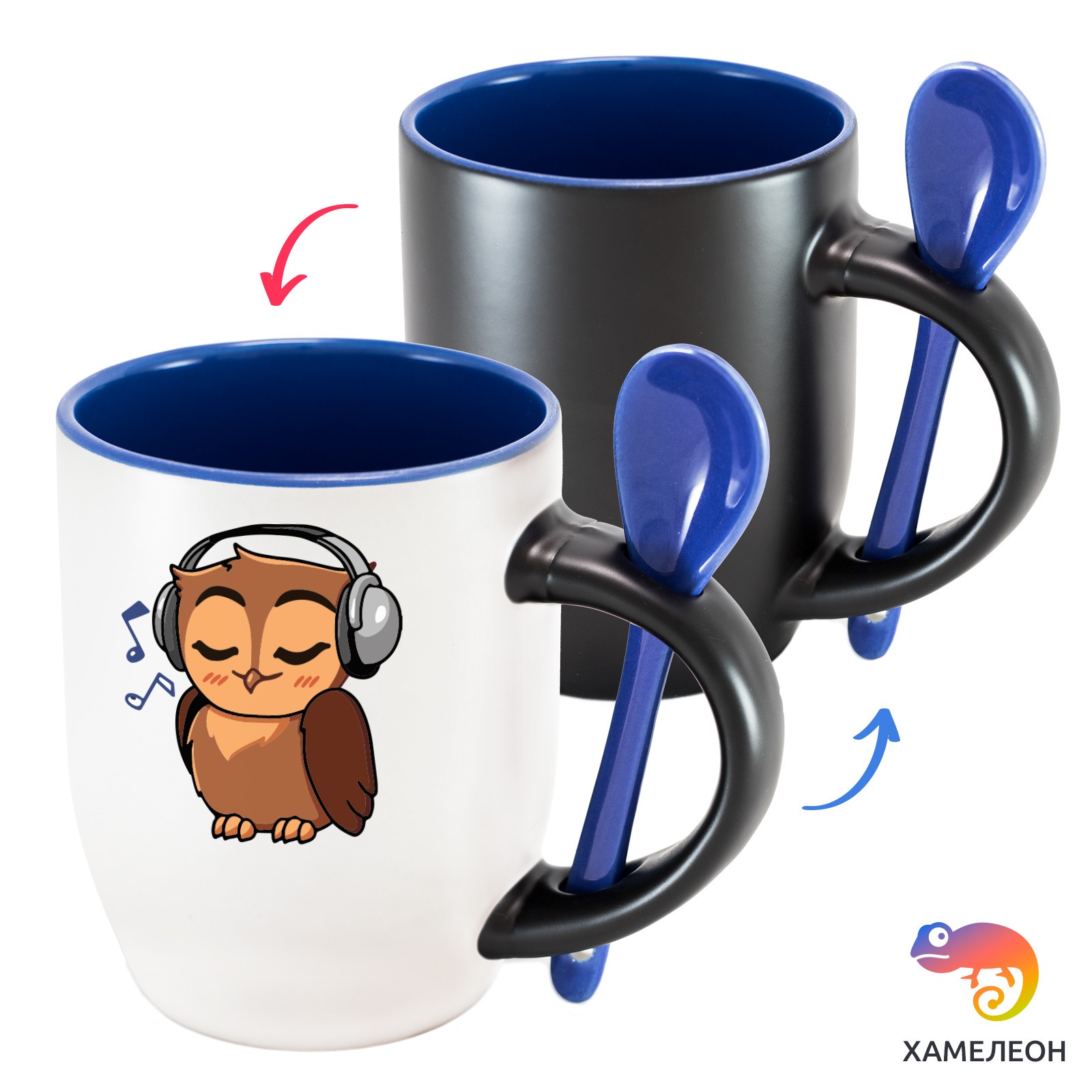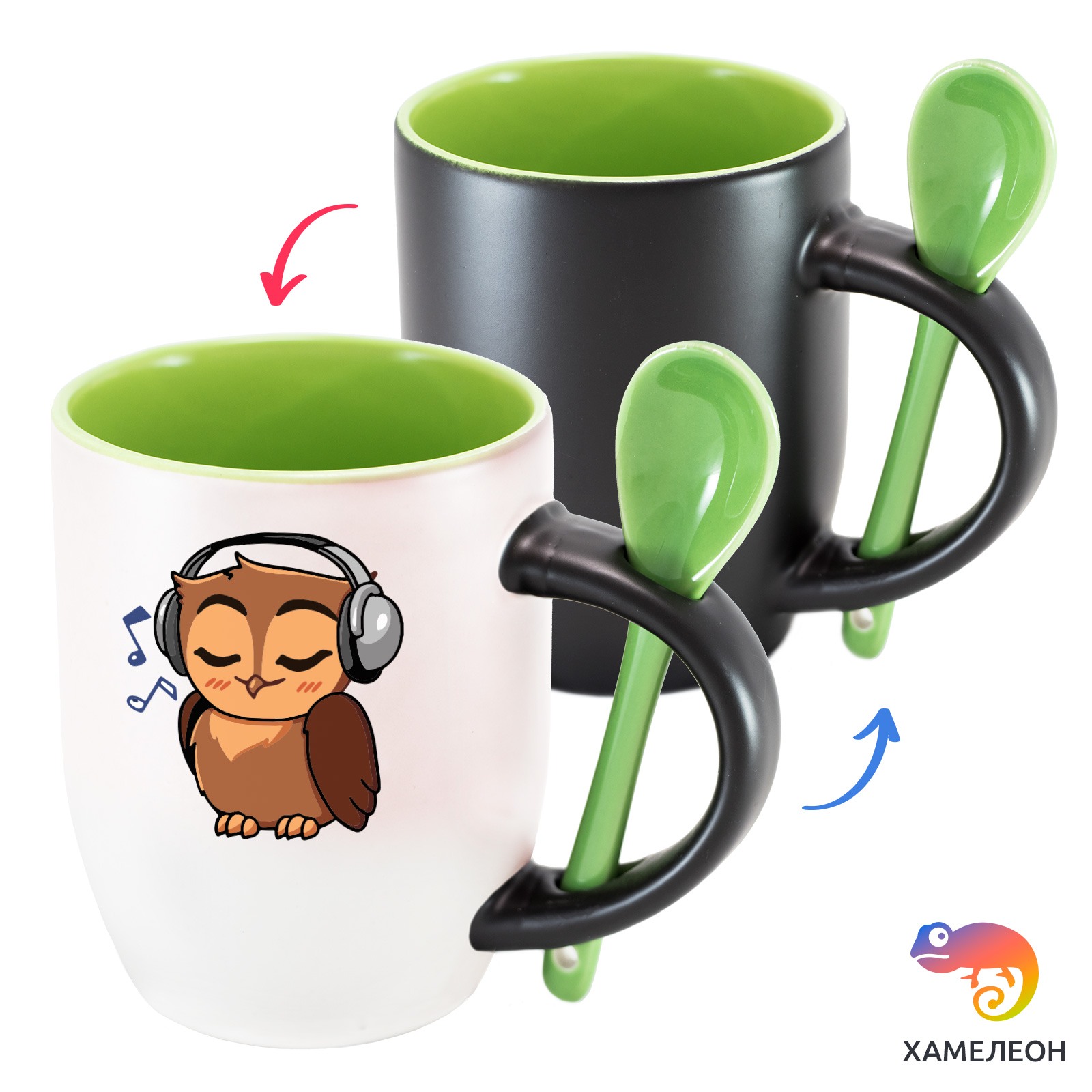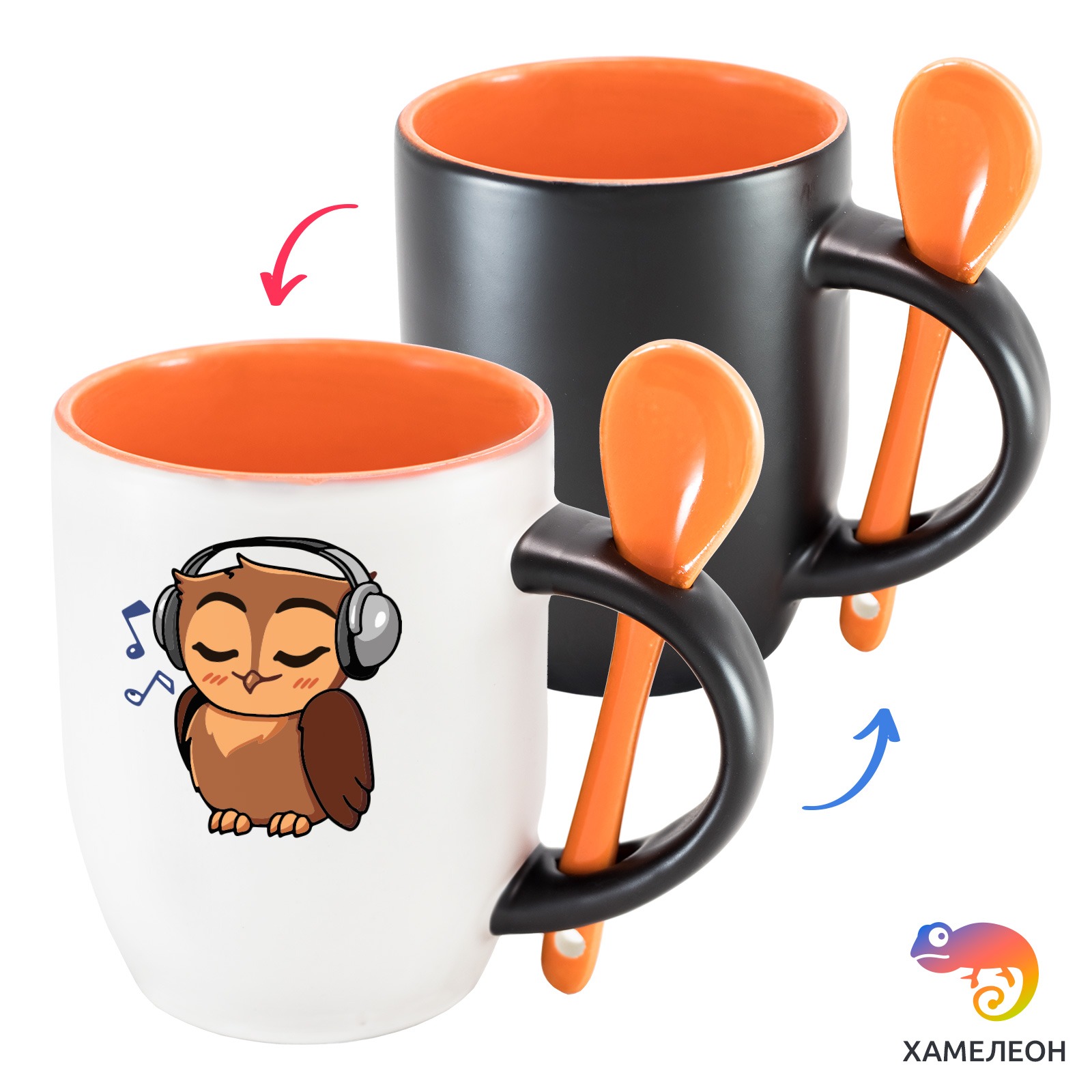 Кружка с принтом является отличным подарком коллеге, другу или самому себе ?Оригинальная кружка хамелеон Филин Music с ложкой приукрасит ваши будни или станет отличным подарком. Кружка изготовлена из высококачественной керамики, а специальный термопегментный слой позволяет ей менять цвет, в зависимости от температуры. Изначально кружка имеет черную заливку, которая становится белой, когда вы наливаете кипяток. Термопегменты становятся прозрачными, начиная с 50°C. Под черным пегментным слоем скрываются необычные рисунки, которые удивят многих.