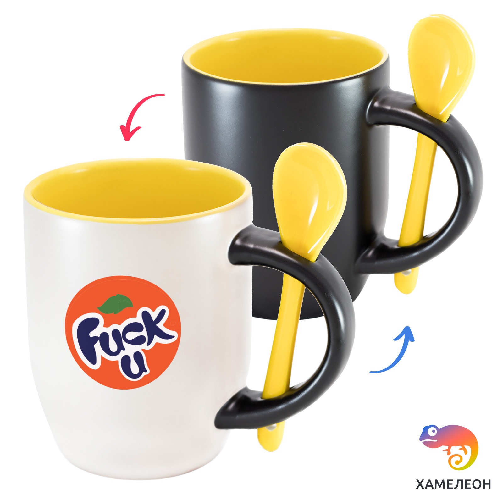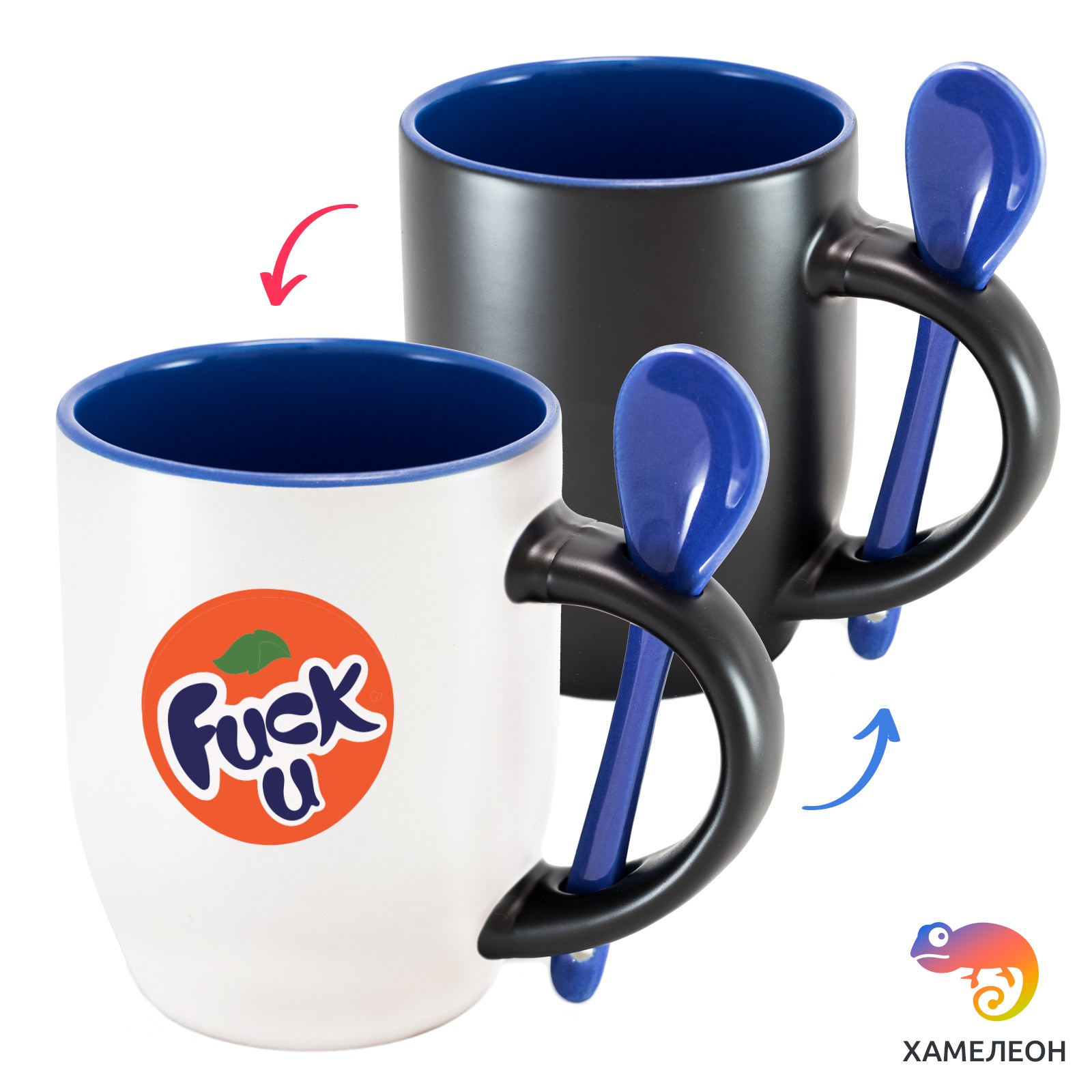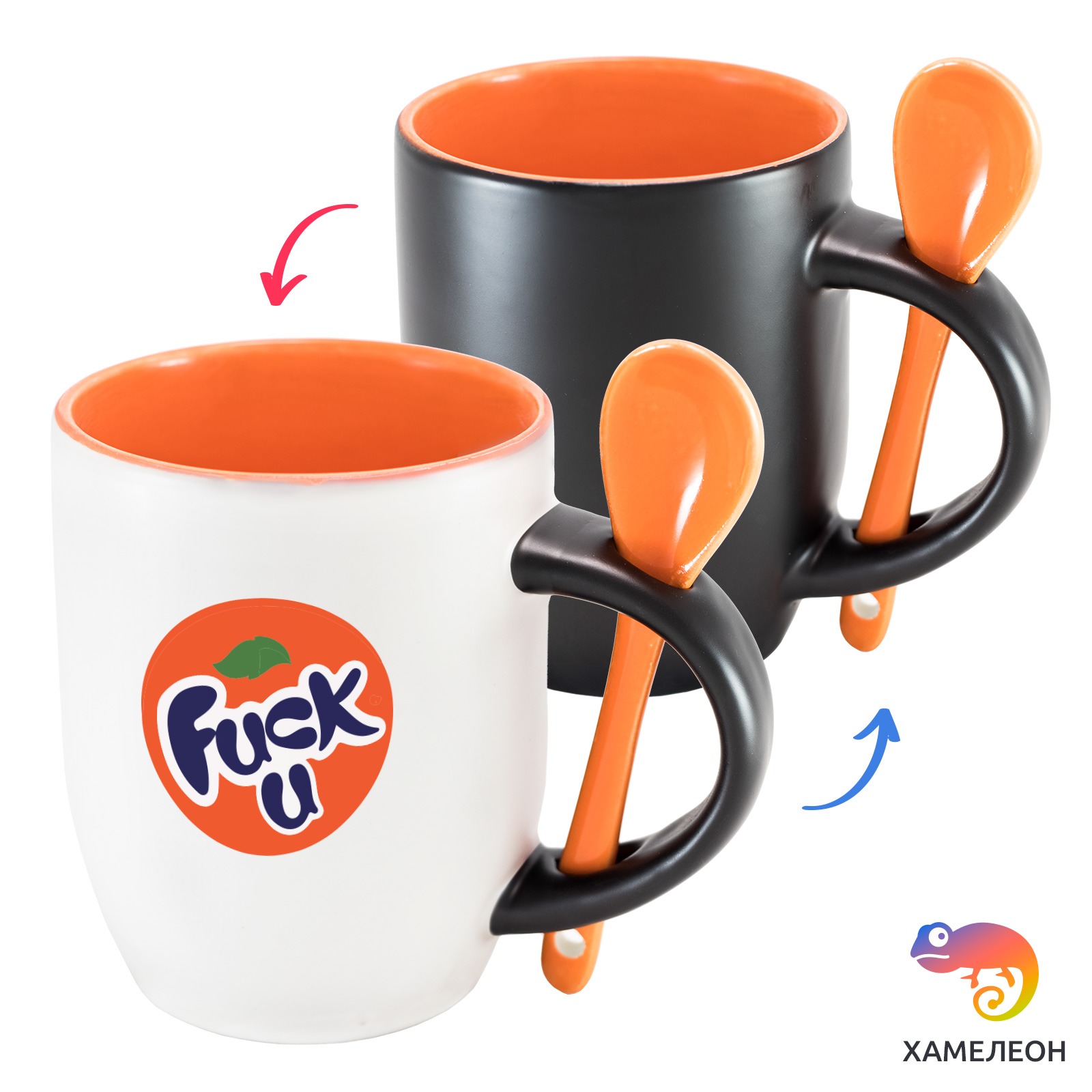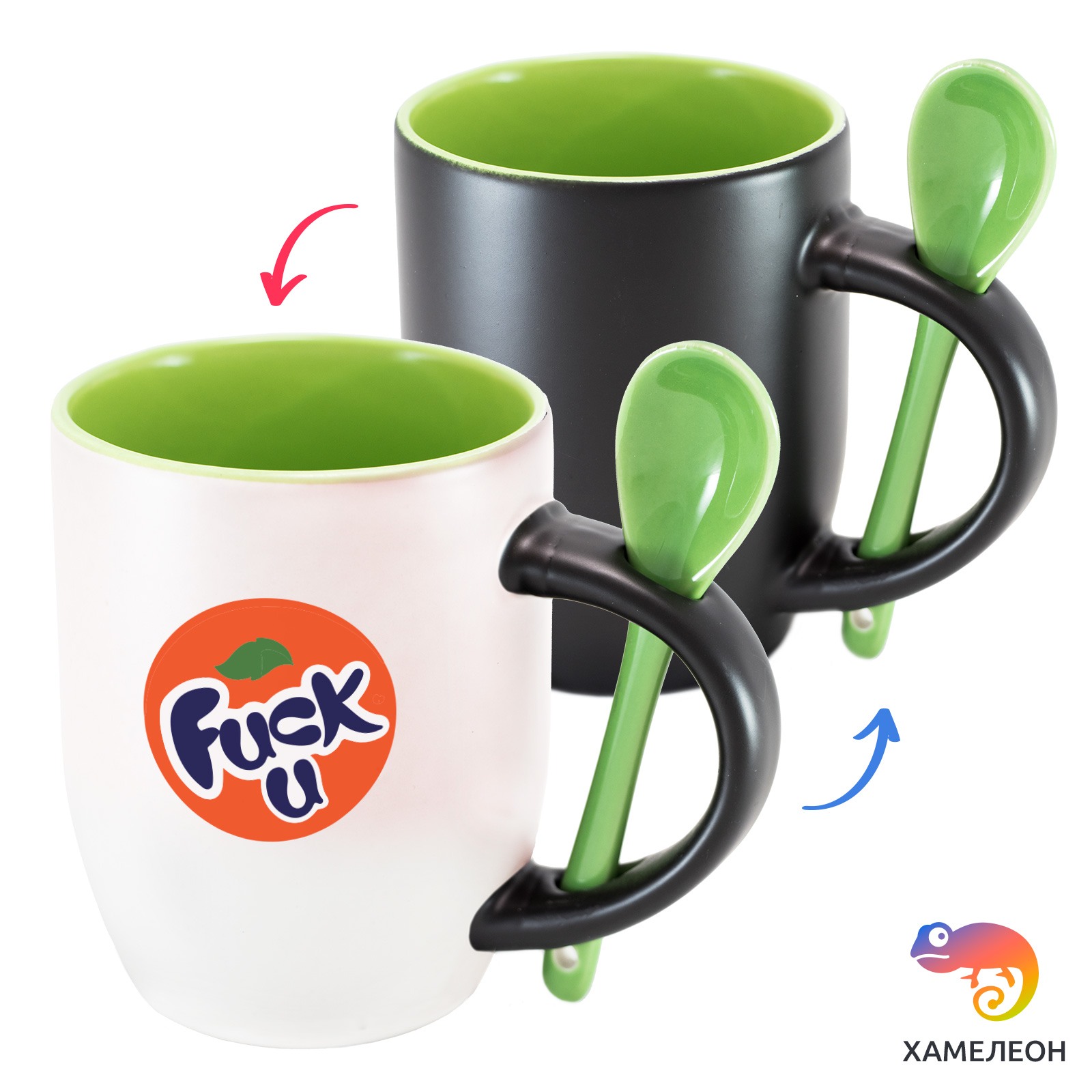 Кружка с принтом является отличным подарком коллеге, другу или самому себе ?Оригинальная кружка хамелеон Fuck U с ложкой приукрасит ваши будни или станет отличным подарком. Кружка изготовлена из высококачественной керамики, а специальный термопегментный слой позволяет ей менять цвет, в зависимости от температуры. Изначально кружка имеет черную заливку, которая становится белой, когда вы наливаете кипяток. Термопегменты становятся прозрачными, начиная с 50°C. Под черным пегментным слоем скрываются необычные рисунки, которые удивят многих.