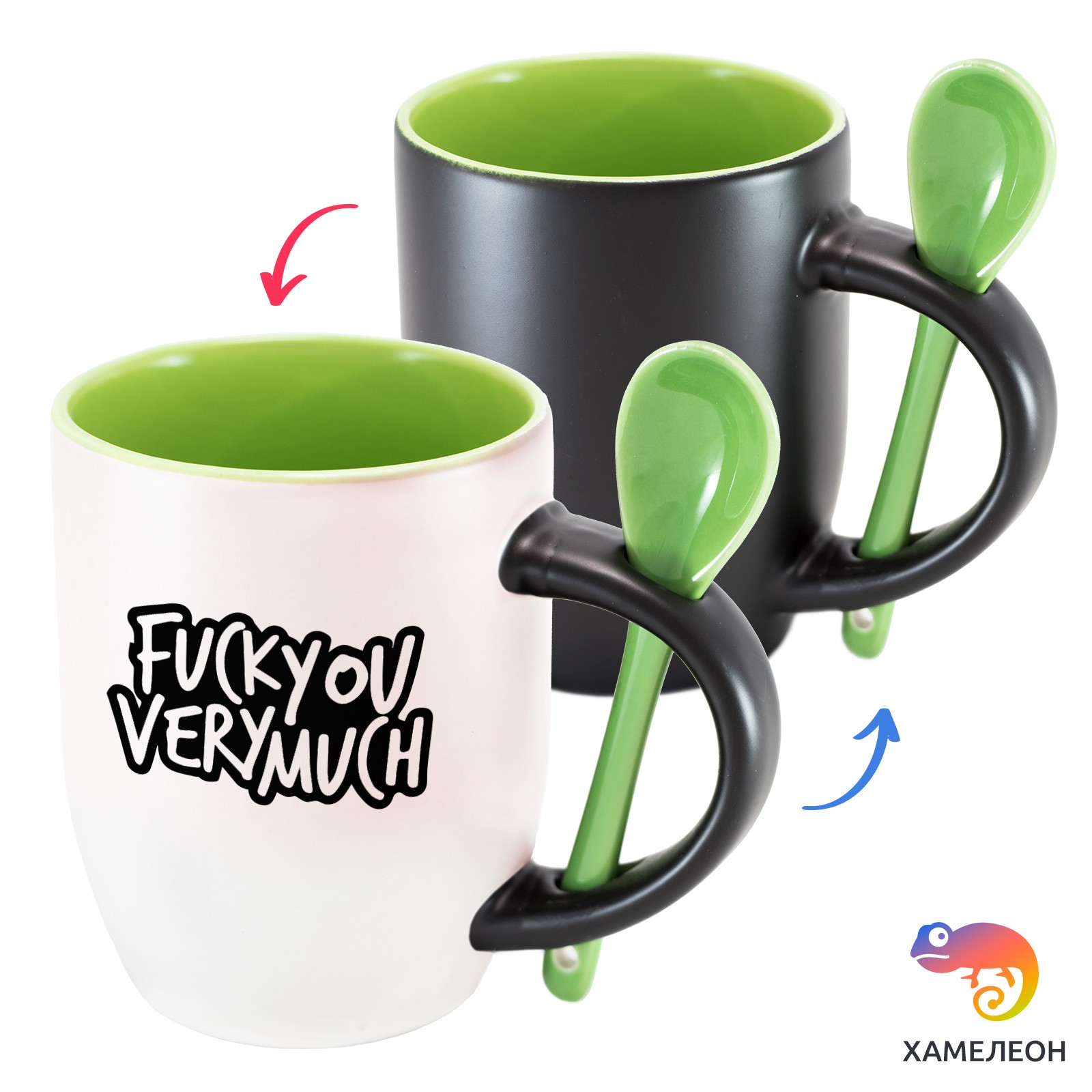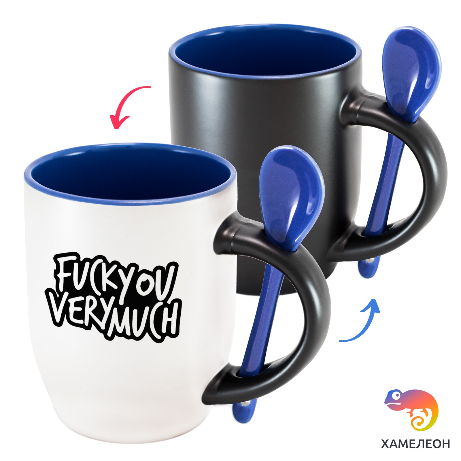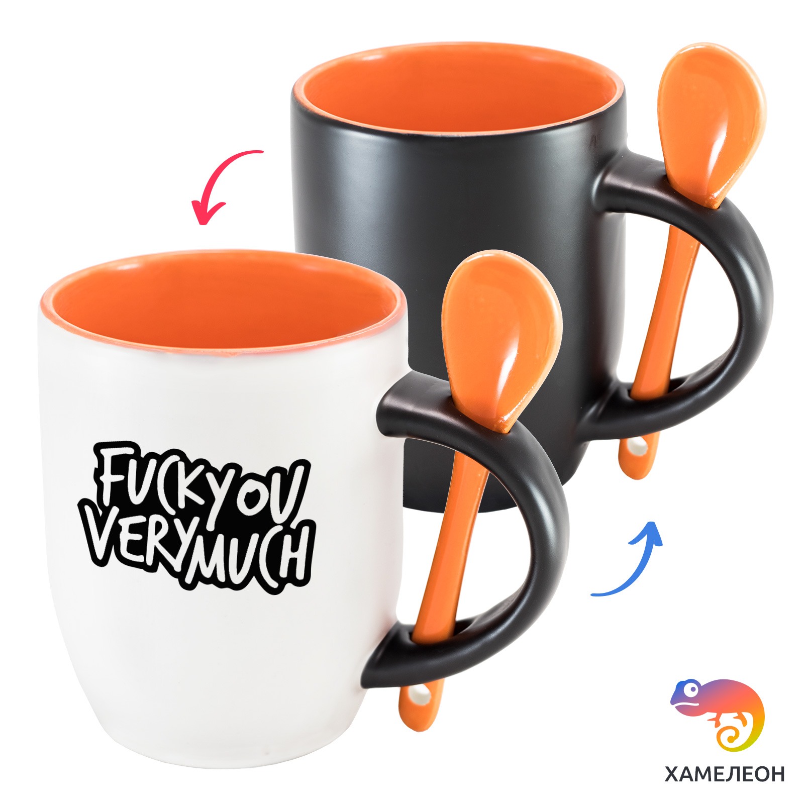 Кружка с принтом является отличным подарком коллеге, другу или самому себе ?Оригинальная кружка хамелеон Fuck you very much с ложкой приукрасит ваши будни или станет отличным подарком. Кружка изготовлена из высококачественной керамики, а специальный термопегментный слой позволяет ей менять цвет, в зависимости от температуры. Изначально кружка имеет черную заливку, которая становится белой, когда вы наливаете кипяток. Термопегменты становятся прозрачными, начиная с 50°C. Под черным пегментным слоем скрываются необычные рисунки, которые удивят многих.