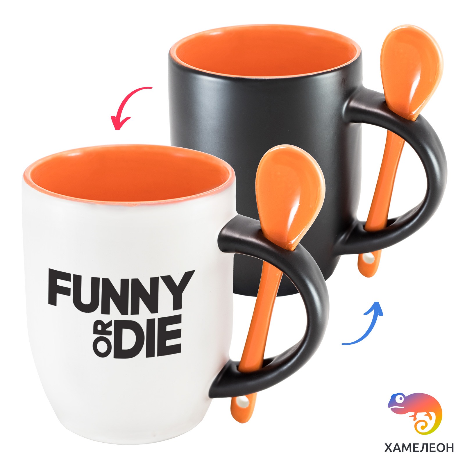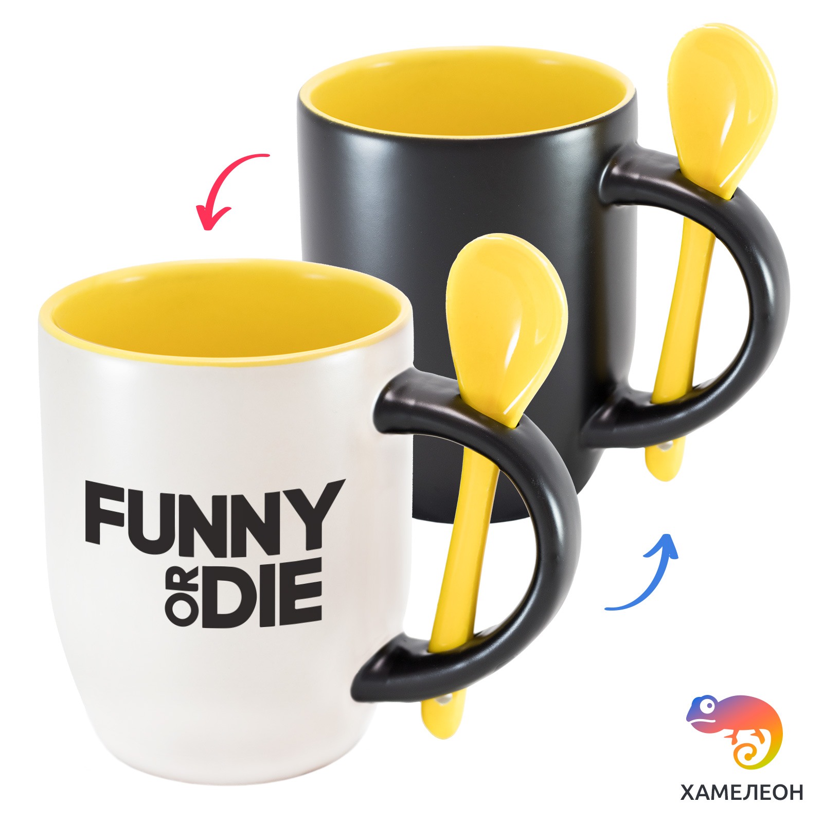 Кружка с принтом является отличным подарком коллеге, другу или самому себе ?Оригинальная кружка хамелеон Funny or die с ложкой приукрасит ваши будни или станет отличным подарком. Кружка изготовлена из высококачественной керамики, а специальный термопегментный слой позволяет ей менять цвет, в зависимости от температуры. Изначально кружка имеет черную заливку, которая становится белой, когда вы наливаете кипяток. Термопегменты становятся прозрачными, начиная с 50°C. Под черным пегментным слоем скрываются необычные рисунки, которые удивят многих.
