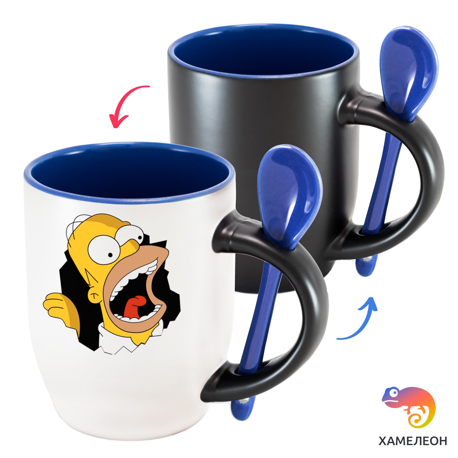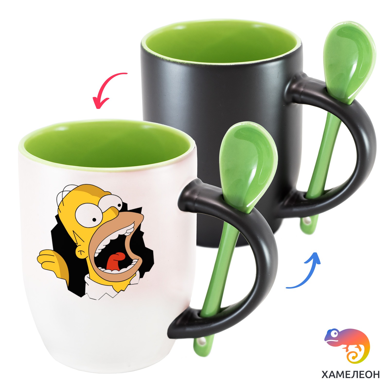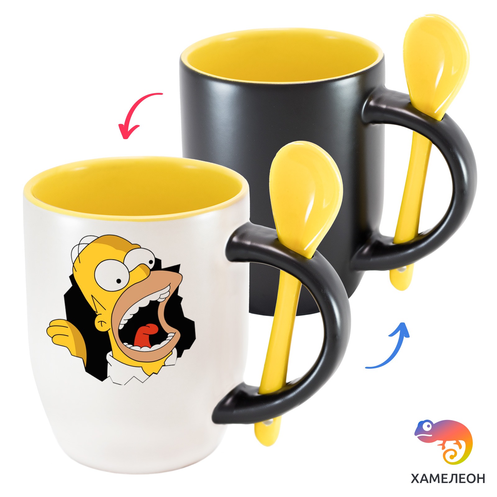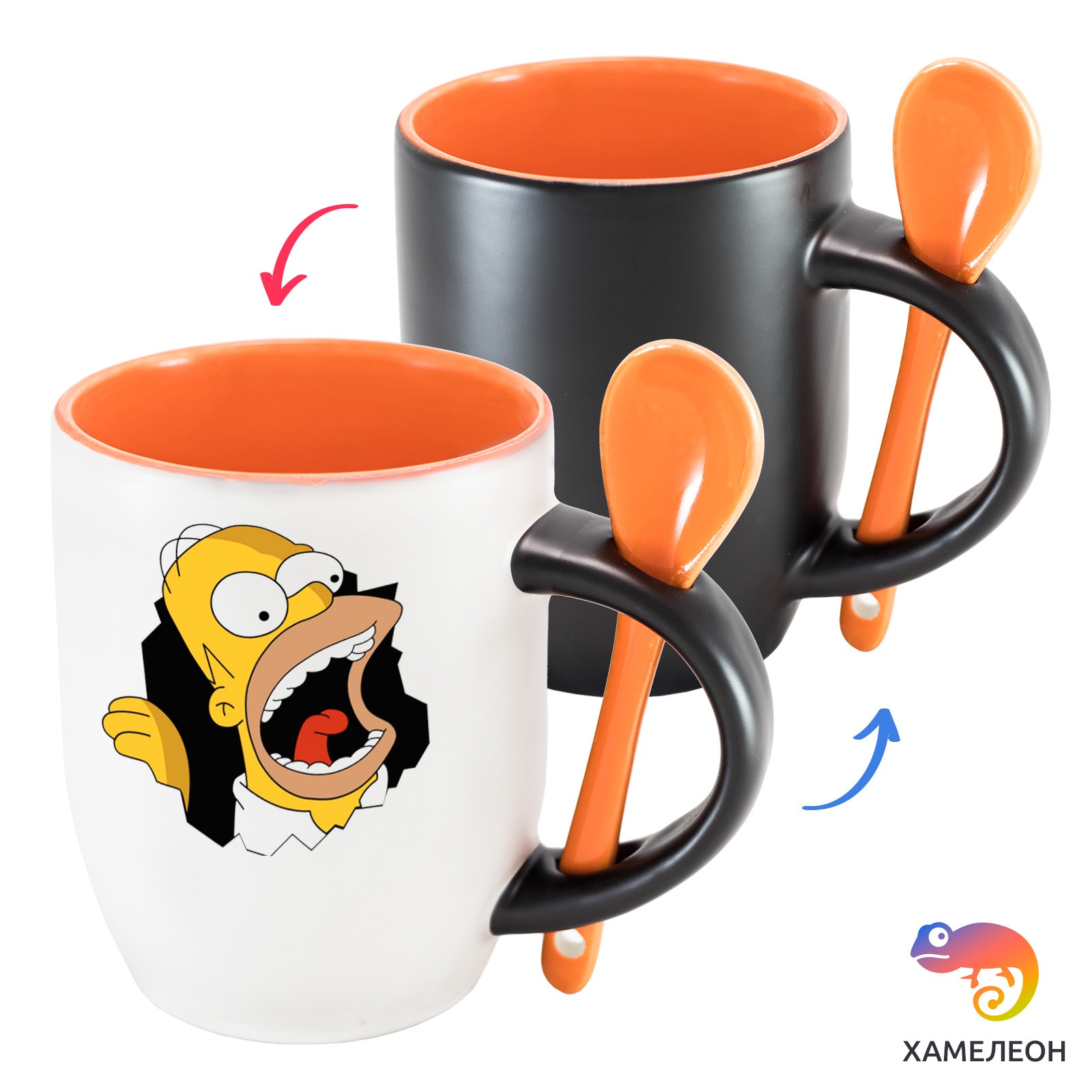 Кружка с принтом является отличным подарком коллеге, другу или самому себе ?Оригинальная кружка хамелеон «Гомер Симпсон псих» с ложкой приукрасит ваши будни или станет отличным подарком. Кружка изготовлена из высококачественной керамики, а специальный термопегментный слой позволяет ей менять цвет, в зависимости от температуры. Изначально кружка имеет черную заливку, которая становится белой, когда вы наливаете кипяток. Термопегменты становятся прозрачными, начиная с 50°C. Под черным пегментным слоем скрываются необычные рисунки, которые удивят многих.