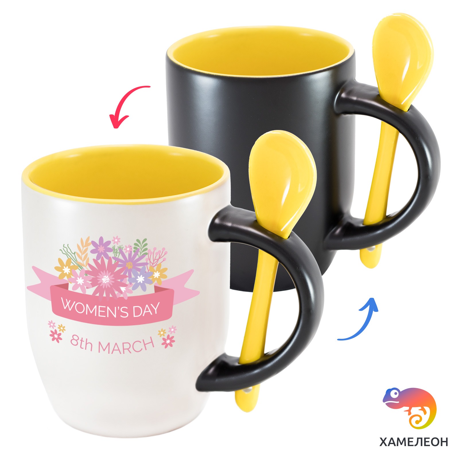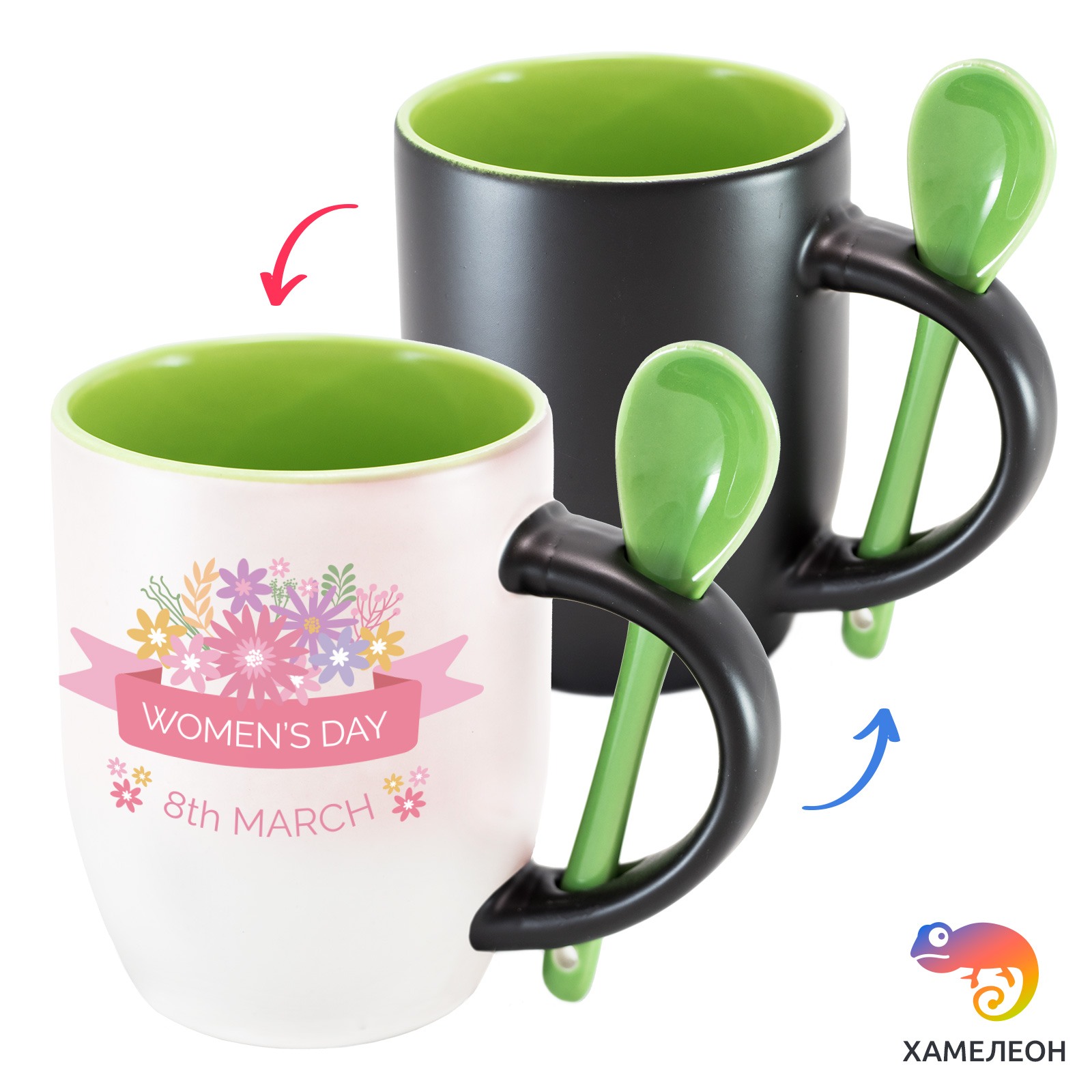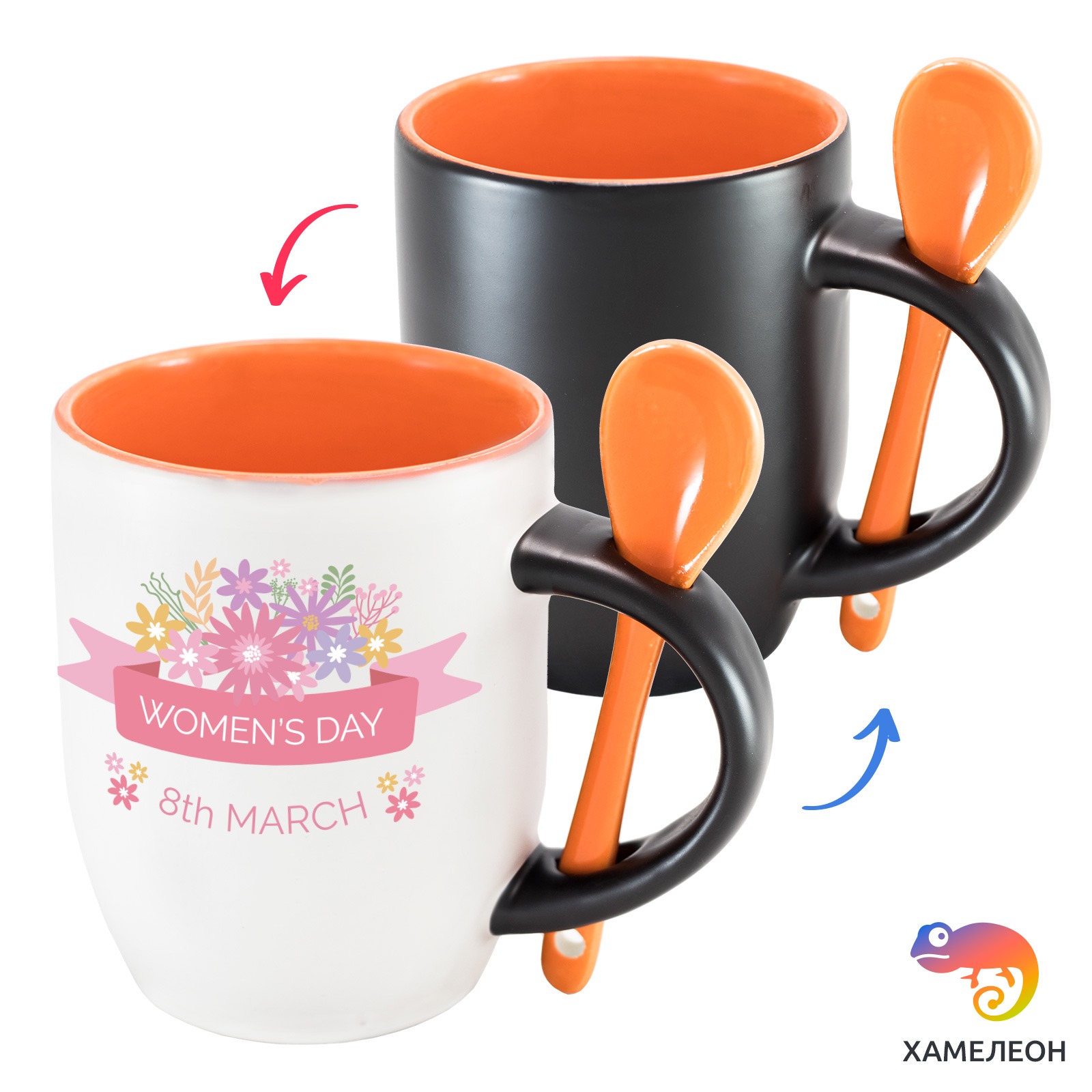 Кружка с принтом является отличным подарком коллеге, другу или самому себе ?Оригинальная кружка хамелеон Happy Women's Day 8 March с ложкой приукрасит ваши будни или станет отличным подарком. Кружка изготовлена из высококачественной керамики, а специальный термопегментный слой позволяет ей менять цвет, в зависимости от температуры. Изначально кружка имеет черную заливку, которая становится белой, когда вы наливаете кипяток. Термопегменты становятся прозрачными, начиная с 50°C. Под черным пегментным слоем скрываются необычные рисунки, которые удивят многих.