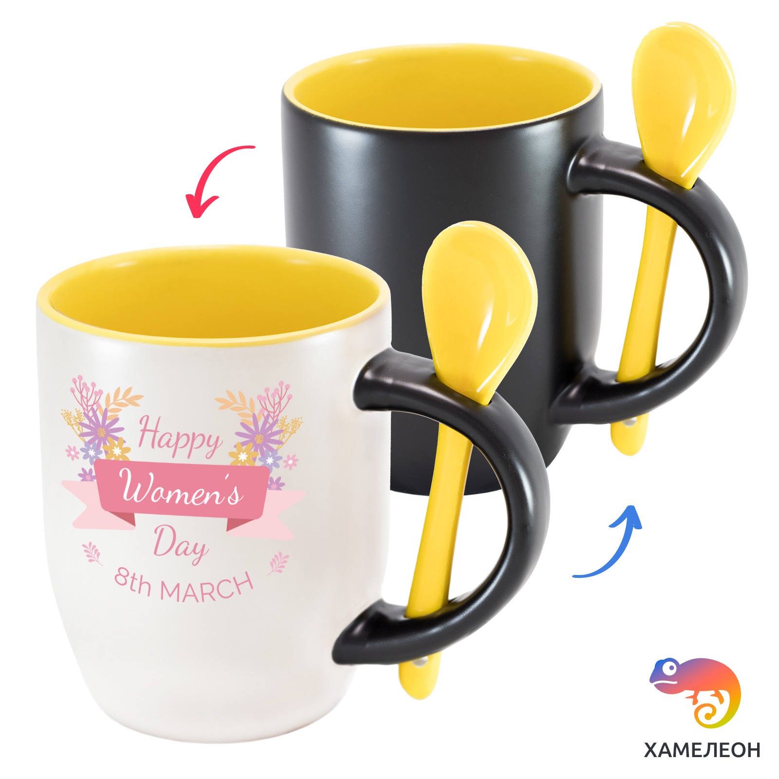 Кружка с принтом является отличным подарком коллеге, другу или самому себе ?Оригинальная кружка хамелеон Happy Women's Day 8th March с ложкой приукрасит ваши будни или станет отличным подарком. Кружка изготовлена из высококачественной керамики, а специальный термопегментный слой позволяет ей менять цвет, в зависимости от температуры. Изначально кружка имеет черную заливку, которая становится белой, когда вы наливаете кипяток. Термопегменты становятся прозрачными, начиная с 50°C. Под черным пегментным слоем скрываются необычные рисунки, которые удивят многих.