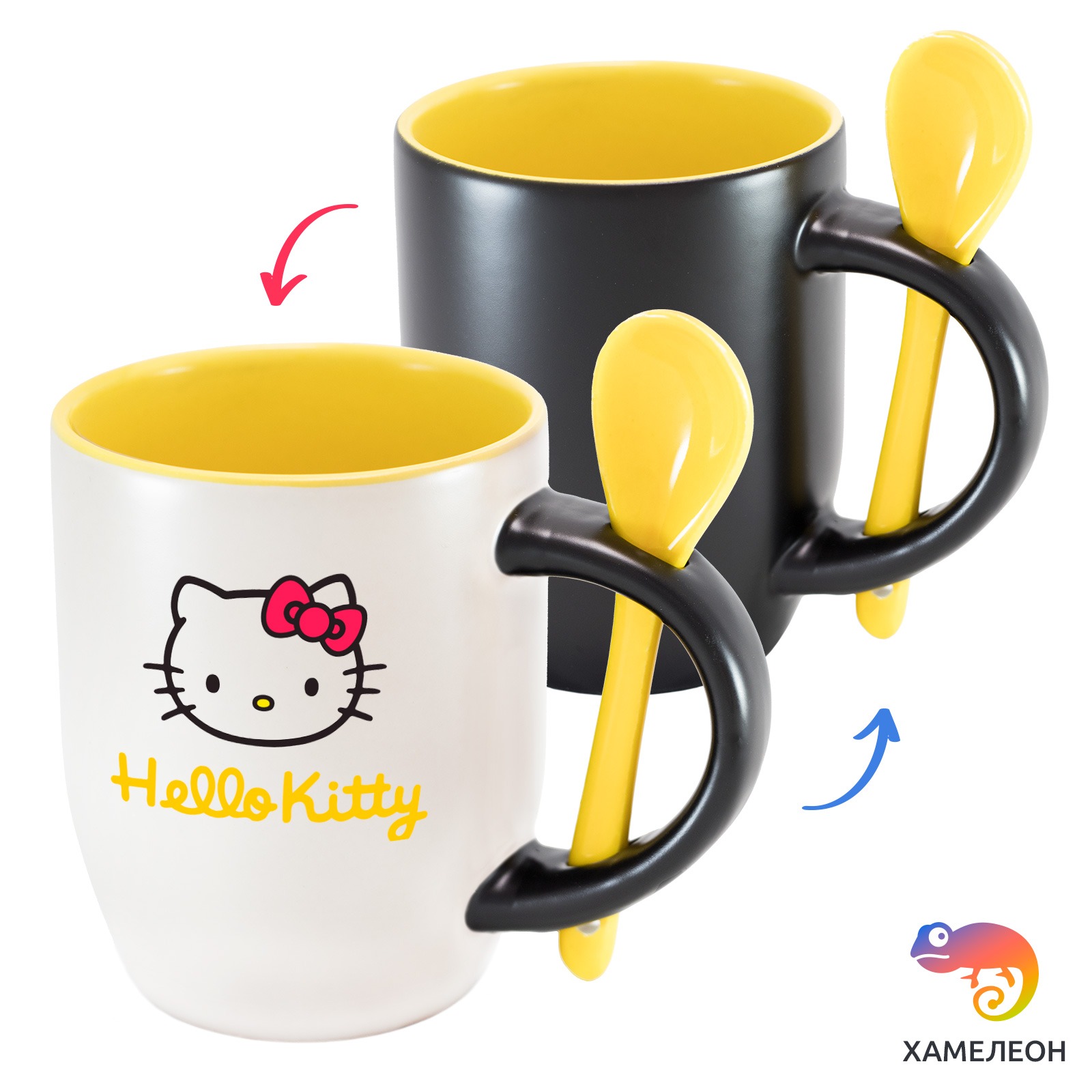 Кружка с принтом является отличным подарком коллеге, другу или самому себе ?Оригинальная кружка хамелеон Hello Kitty с ложкой приукрасит ваши будни или станет отличным подарком. Кружка изготовлена из высококачественной керамики, а специальный термопегментный слой позволяет ей менять цвет, в зависимости от температуры. Изначально кружка имеет черную заливку, которая становится белой, когда вы наливаете кипяток. Термопегменты становятся прозрачными, начиная с 50°C. Под черным пегментным слоем скрываются необычные рисунки, которые удивят многих.