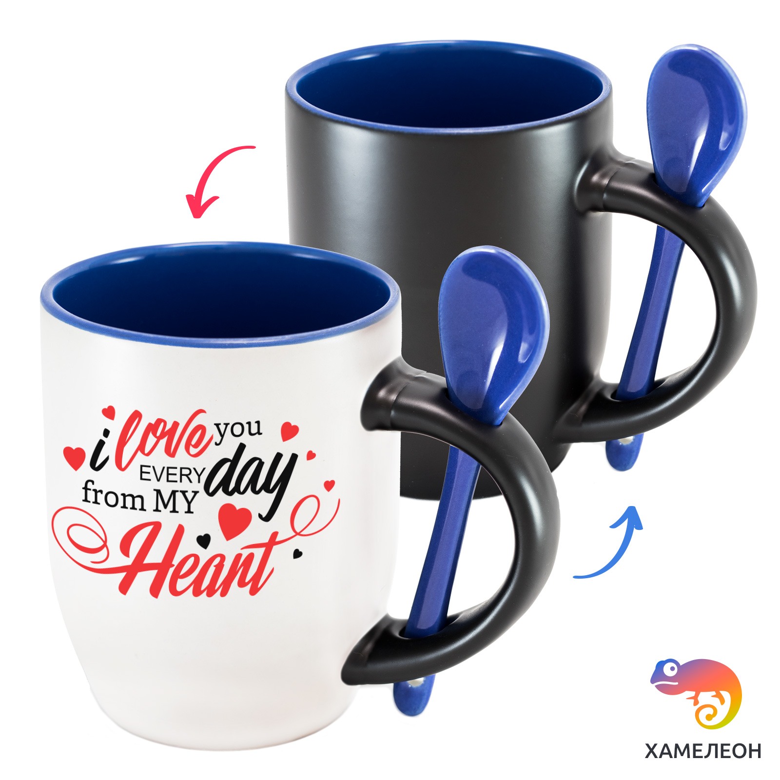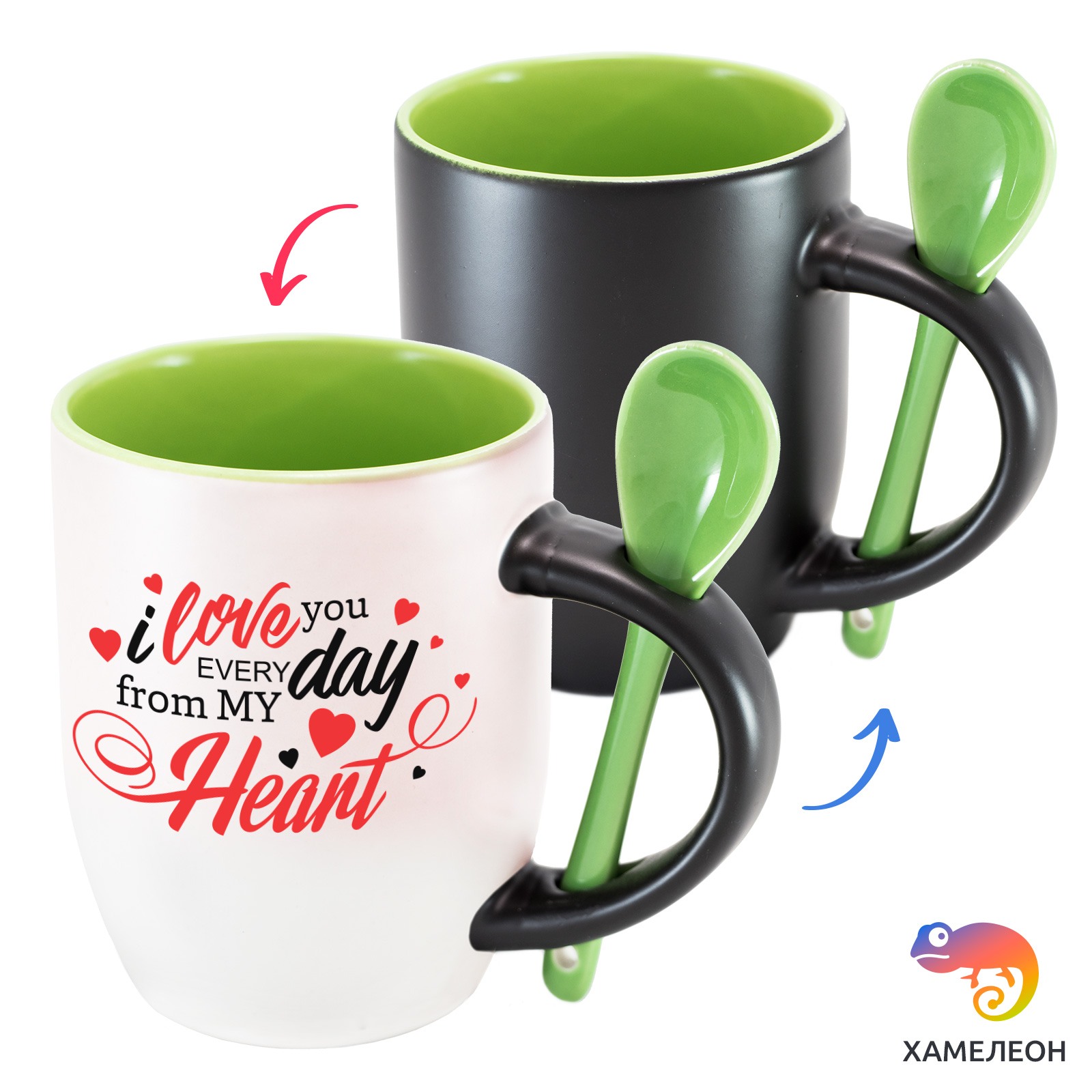 Кружка с принтом является отличным подарком коллеге, другу или самому себе ?Оригинальная кружка хамелеон I Love You every day from my Heart с ложкой приукрасит ваши будни или станет отличным подарком. Кружка изготовлена из высококачественной керамики, а специальный термопегментный слой позволяет ей менять цвет, в зависимости от температуры. Изначально кружка имеет черную заливку, которая становится белой, когда вы наливаете кипяток. Термопегменты становятся прозрачными, начиная с 50°C. Под черным пегментным слоем скрываются необычные рисунки, которые удивят многих.