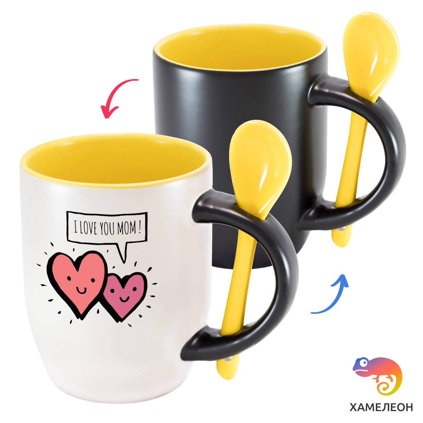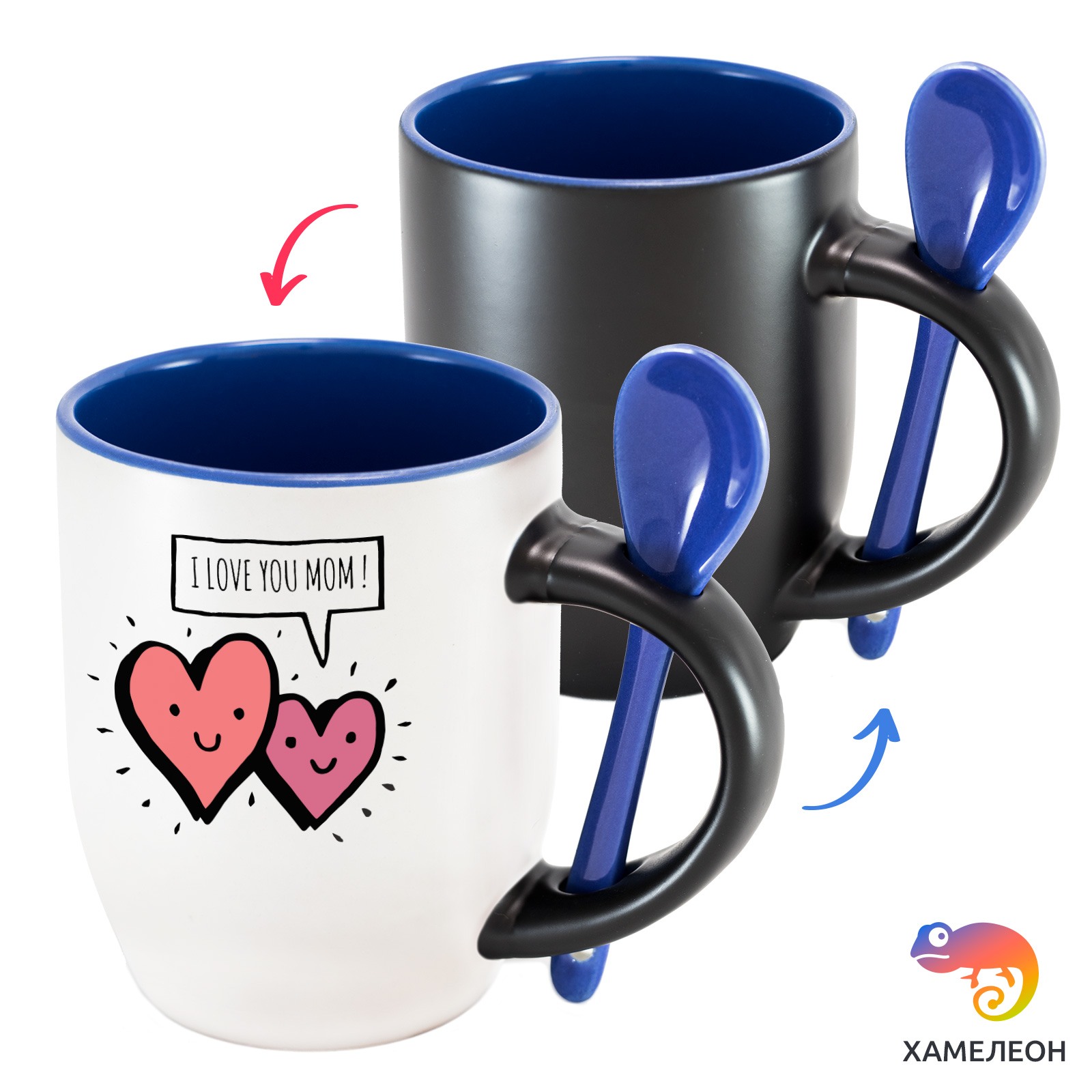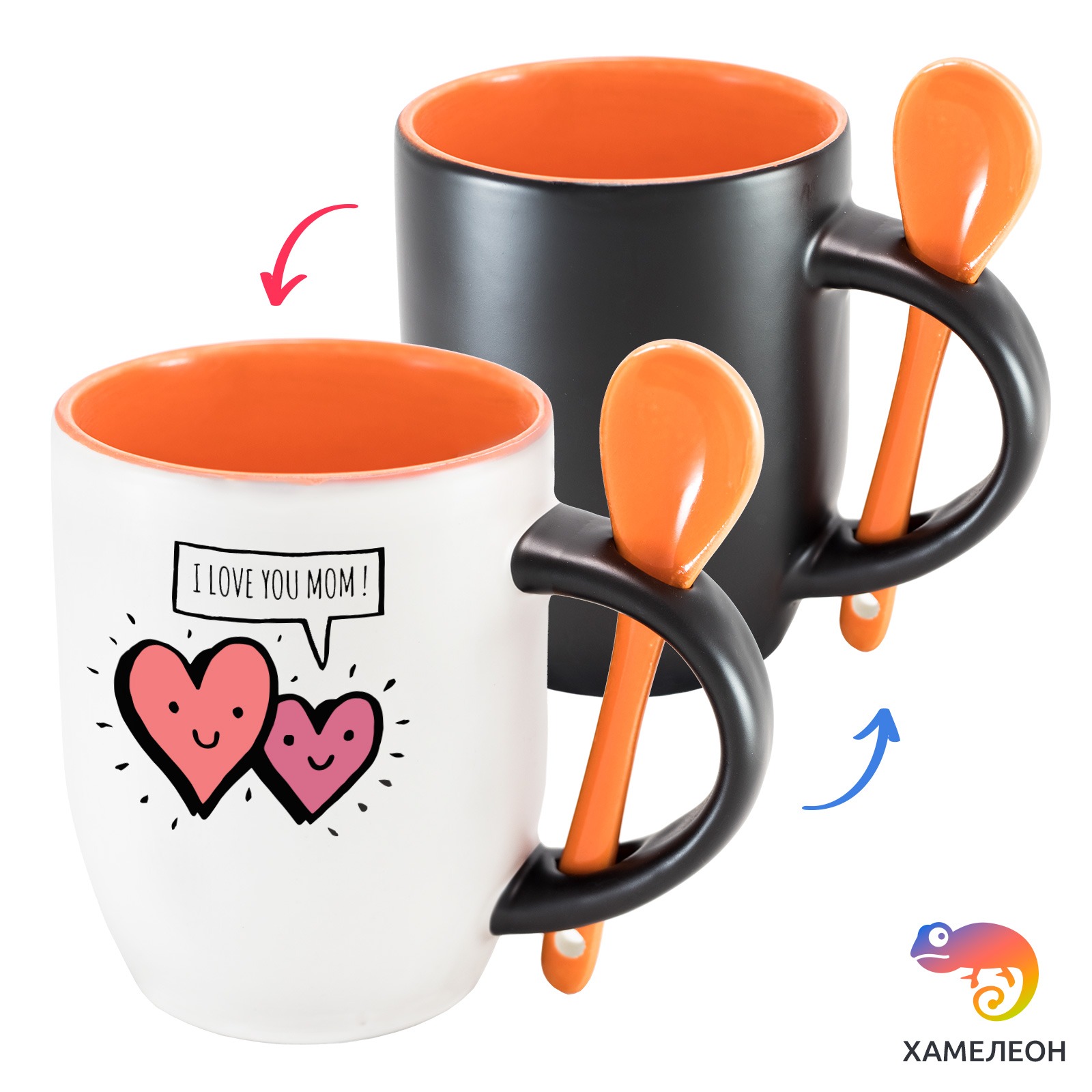 Кружка с принтом является отличным подарком коллеге, другу или самому себе ?Оригинальная кружка хамелеон I Love You Mom с ложкой приукрасит ваши будни или станет отличным подарком. Кружка изготовлена из высококачественной керамики, а специальный термопегментный слой позволяет ей менять цвет, в зависимости от температуры. Изначально кружка имеет черную заливку, которая становится белой, когда вы наливаете кипяток. Термопегменты становятся прозрачными, начиная с 50°C. Под черным пегментным слоем скрываются необычные рисунки, которые удивят многих.