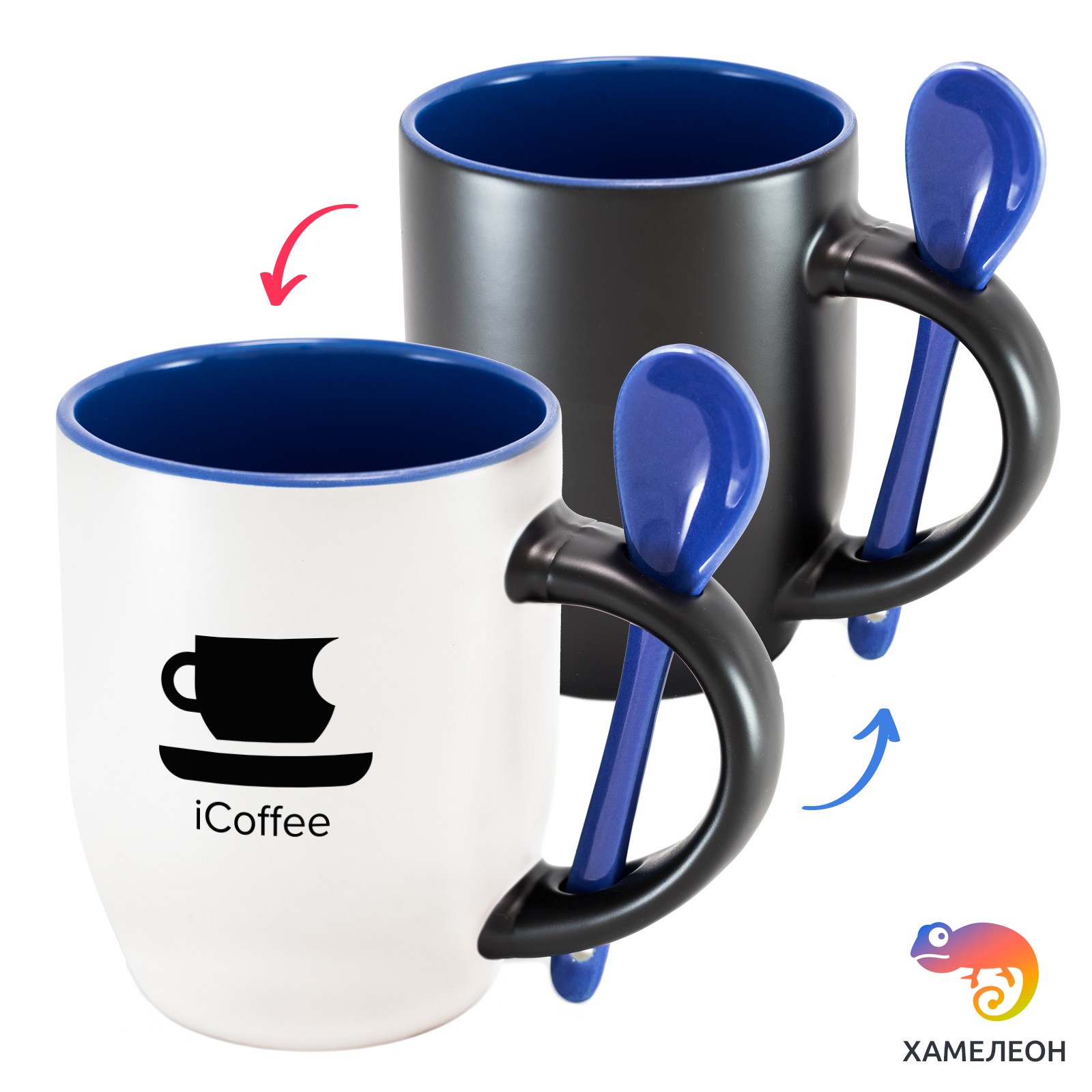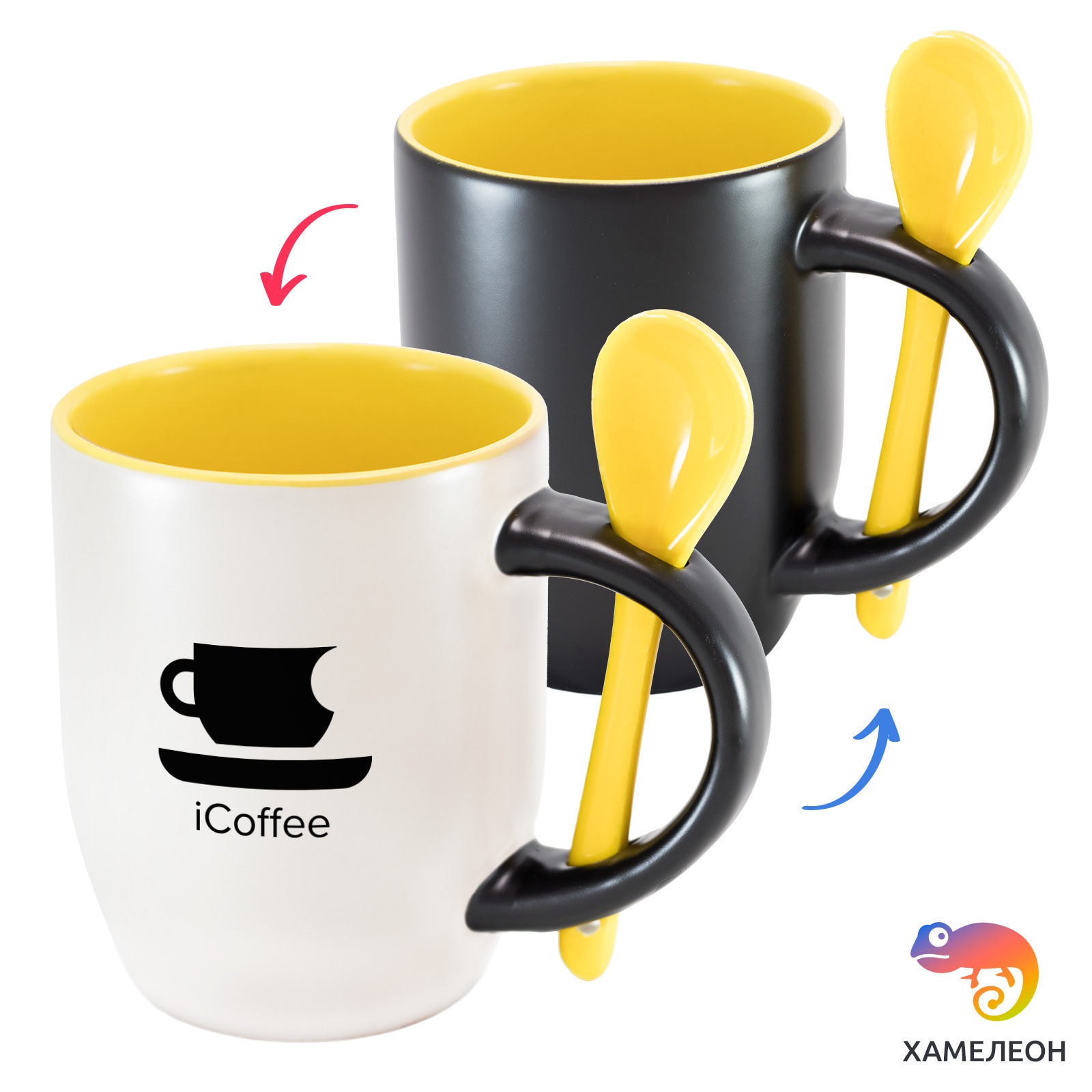 Кружка с принтом является отличным подарком коллеге, другу или самому себе ?Оригинальная кружка хамелеон iCoffee с ложкой приукрасит ваши будни или станет отличным подарком. Кружка изготовлена из высококачественной керамики, а специальный термопегментный слой позволяет ей менять цвет, в зависимости от температуры. Изначально кружка имеет черную заливку, которая становится белой, когда вы наливаете кипяток. Термопегменты становятся прозрачными, начиная с 50°C. Под черным пегментным слоем скрываются необычные рисунки, которые удивят многих.