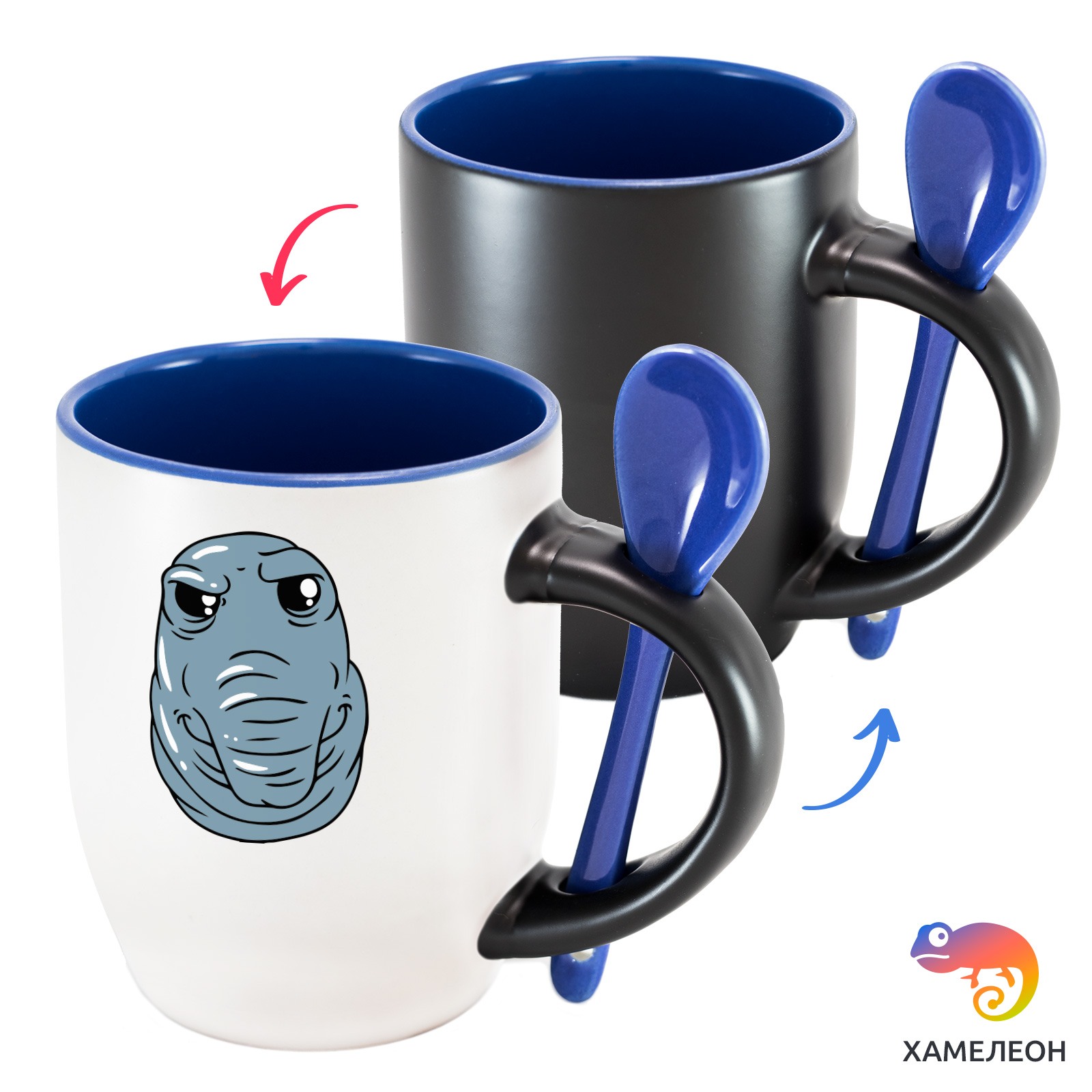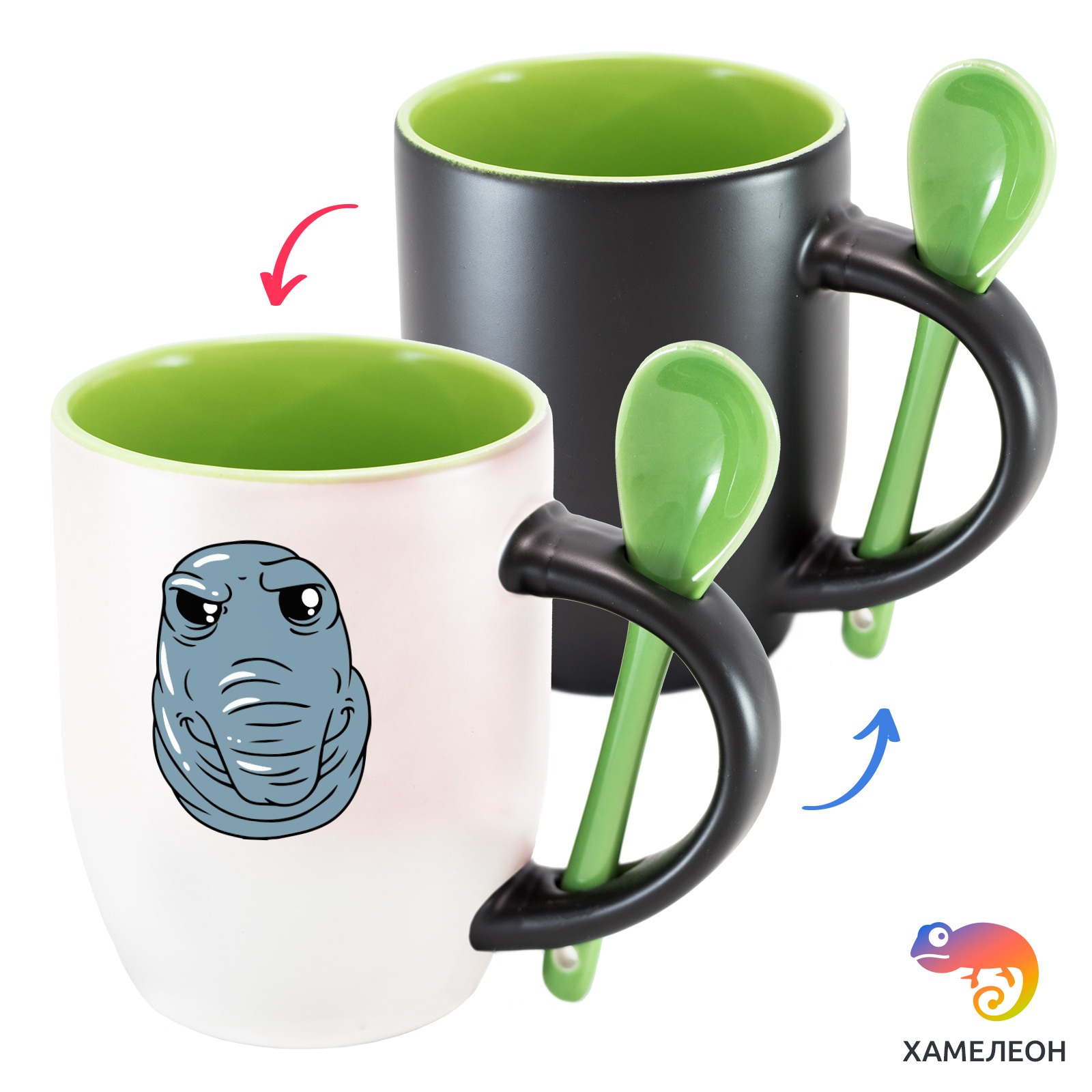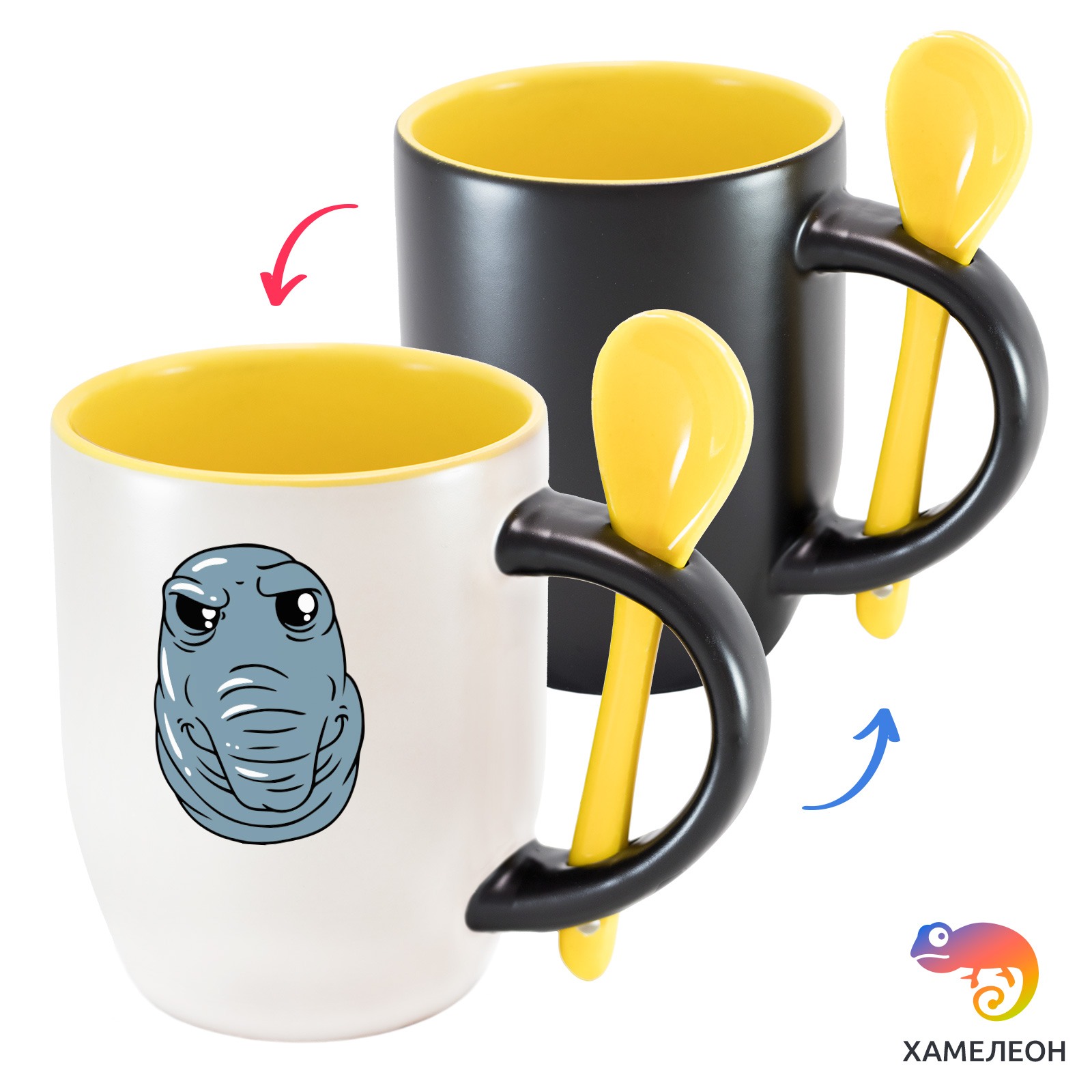 Кружка с принтом является отличным подарком коллеге, другу или самому себе ?Оригинальная кружка хамелеон Ждун с ложкой приукрасит ваши будни или станет отличным подарком. Кружка изготовлена из высококачественной керамики, а специальный термопегментный слой позволяет ей менять цвет, в зависимости от температуры. Изначально кружка имеет черную заливку, которая становится белой, когда вы наливаете кипяток. Термопегменты становятся прозрачными, начиная с 50°C. Под черным пегментным слоем скрываются необычные рисунки, которые удивят многих.