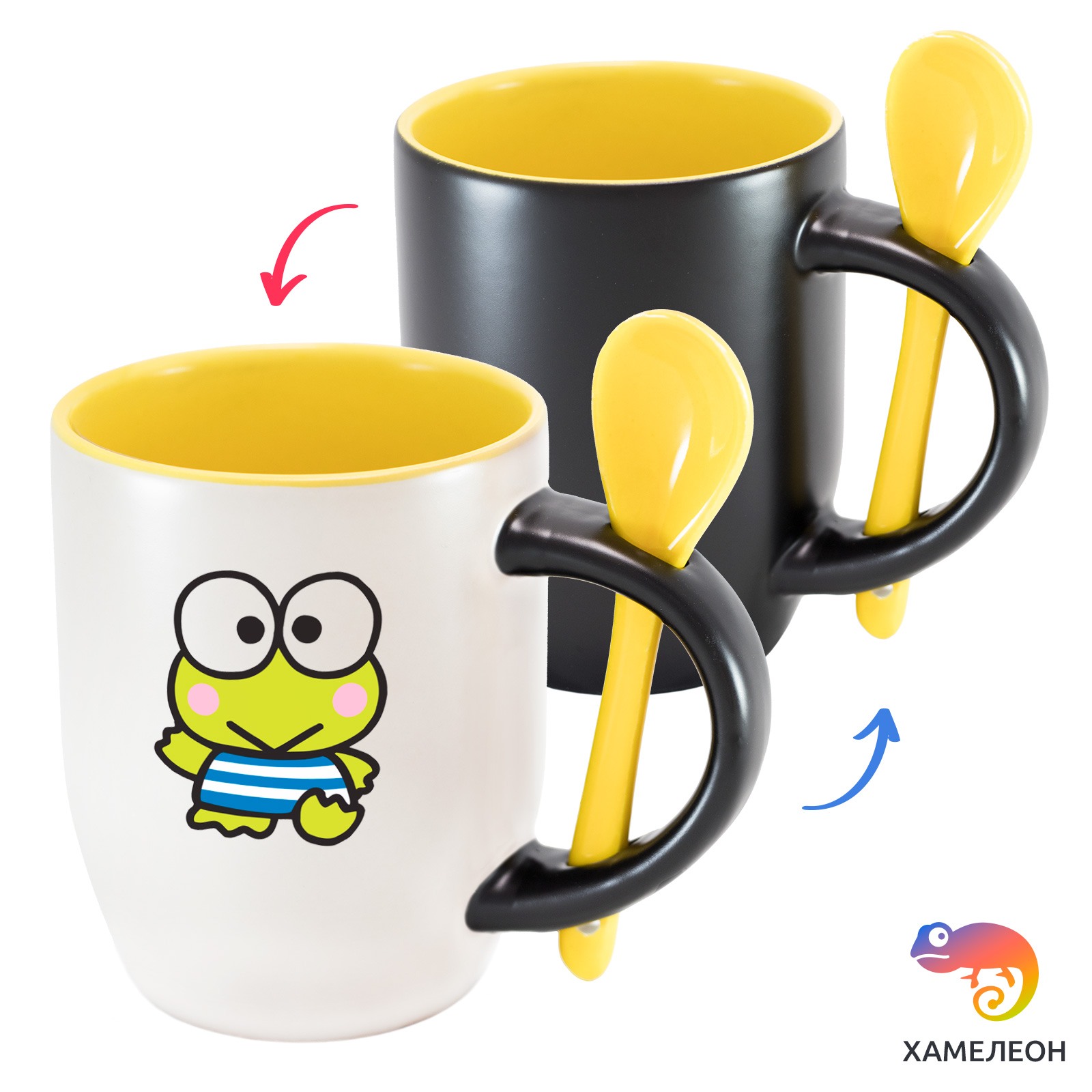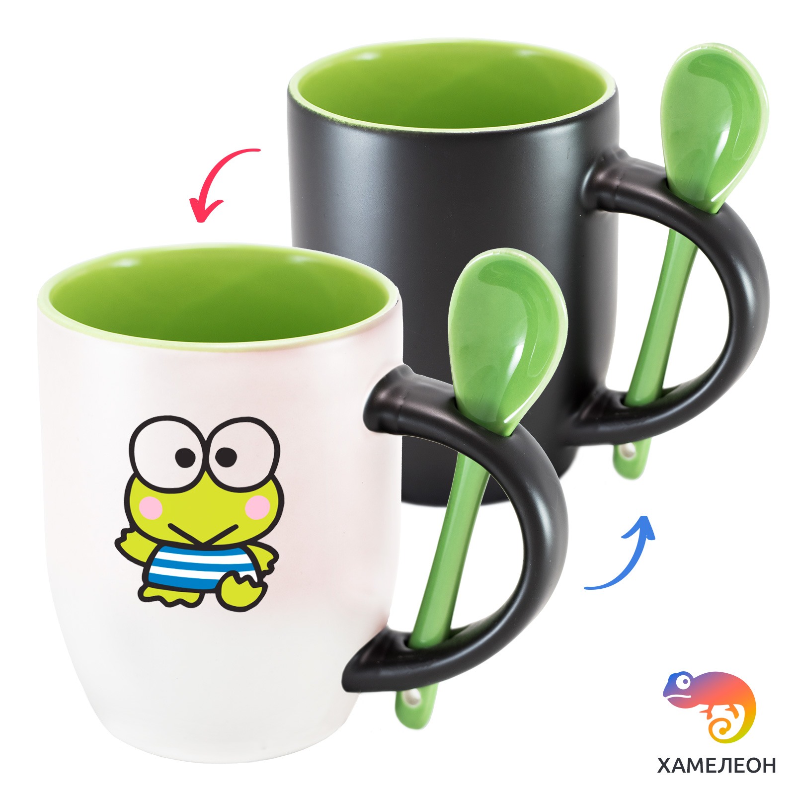 Кружка с принтом является отличным подарком коллеге, другу или самому себе ?Оригинальная кружка хамелеон Keroppi с ложкой приукрасит ваши будни или станет отличным подарком. Кружка изготовлена из высококачественной керамики, а специальный термопегментный слой позволяет ей менять цвет, в зависимости от температуры. Изначально кружка имеет черную заливку, которая становится белой, когда вы наливаете кипяток. Термопегменты становятся прозрачными, начиная с 50°C. Под черным пегментным слоем скрываются необычные рисунки, которые удивят многих.