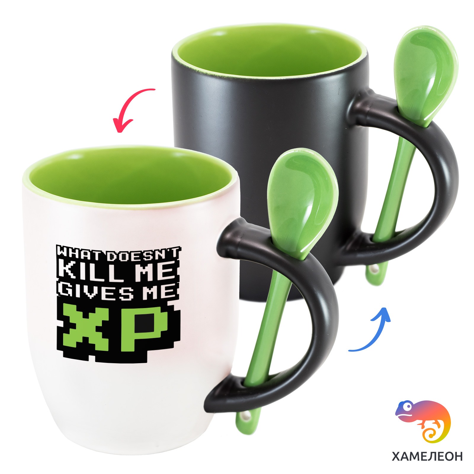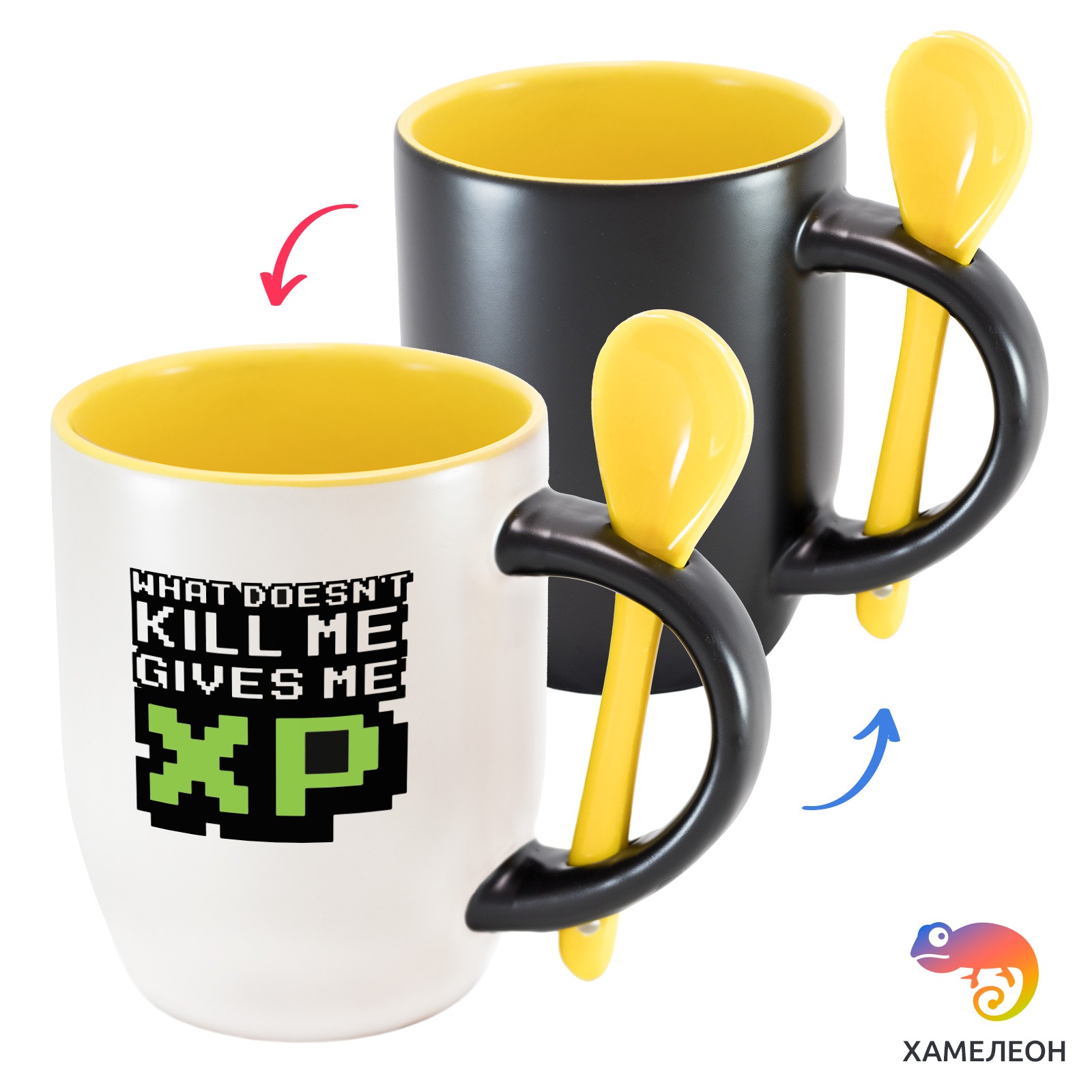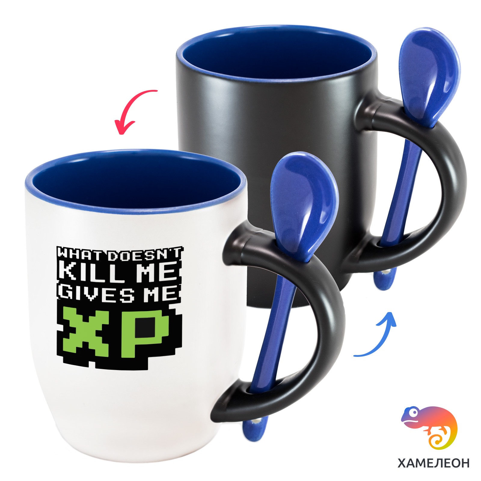 Кружка с принтом является отличным подарком коллеге, другу или самому себе ?Оригинальная кружка хамелеон Kill Me Gives Me XP с ложкой приукрасит ваши будни или станет отличным подарком. Кружка изготовлена из высококачественной керамики, а специальный термопегментный слой позволяет ей менять цвет, в зависимости от температуры. Изначально кружка имеет черную заливку, которая становится белой, когда вы наливаете кипяток. Термопегменты становятся прозрачными, начиная с 50°C. Под черным пегментным слоем скрываются необычные рисунки, которые удивят многих.
