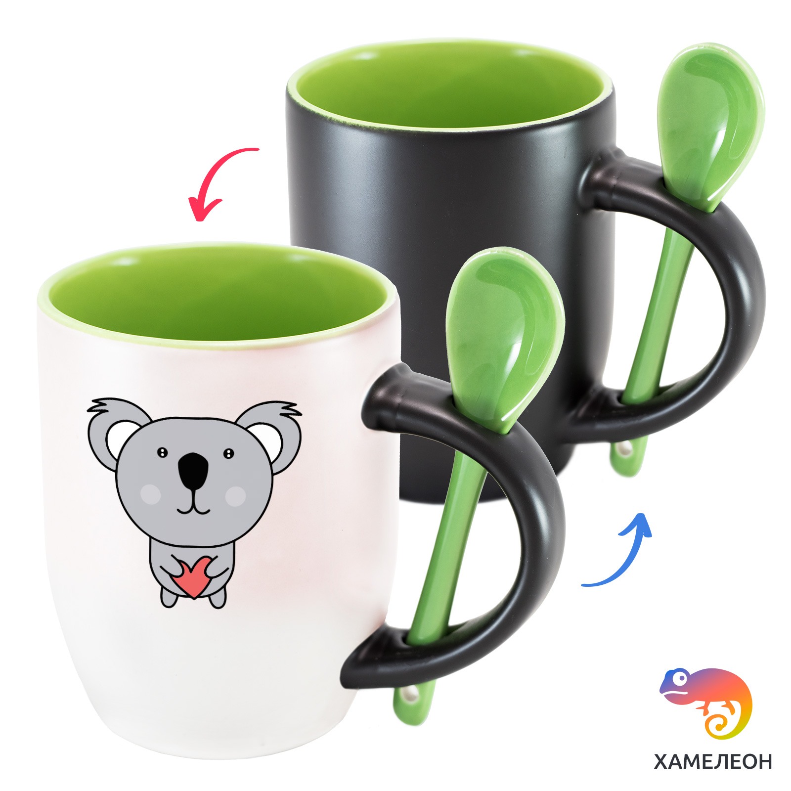 Кружка с принтом является отличным подарком коллеге, другу или самому себе ?Оригинальная кружка хамелеон «Коала с сердечком» с ложкой приукрасит ваши будни или станет отличным подарком. Кружка изготовлена из высококачественной керамики, а специальный термопегментный слой позволяет ей менять цвет, в зависимости от температуры. Изначально кружка имеет черную заливку, которая становится белой, когда вы наливаете кипяток. Термопегменты становятся прозрачными, начиная с 50°C. Под черным пегментным слоем скрываются необычные рисунки, которые удивят многих.