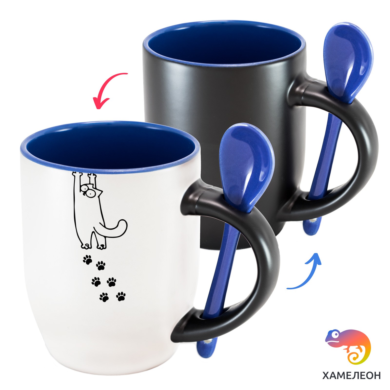Кружка с принтом является отличным подарком коллеге, другу или самому себе ?Оригинальная кружка хамелеон «Кошачий побег» с ложкой приукрасит ваши будни или станет отличным подарком. Кружка изготовлена из высококачественной керамики, а специальный термопегментный слой позволяет ей менять цвет, в зависимости от температуры. Изначально кружка имеет черную заливку, которая становится белой, когда вы наливаете кипяток. Термопегменты становятся прозрачными, начиная с 50°C. Под черным пегментным слоем скрываются необычные рисунки, которые удивят многих.