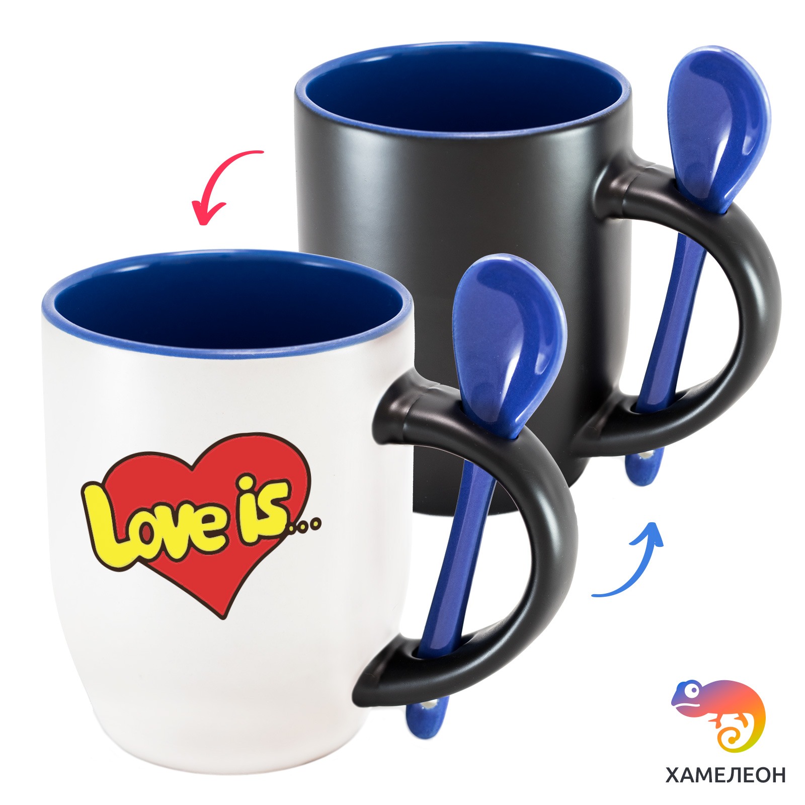 Кружка с принтом является отличным подарком коллеге, другу или самому себе ?Оригинальная кружка хамелеон Love is с ложкой приукрасит ваши будни или станет отличным подарком. Кружка изготовлена из высококачественной керамики, а специальный термопегментный слой позволяет ей менять цвет, в зависимости от температуры. Изначально кружка имеет черную заливку, которая становится белой, когда вы наливаете кипяток. Термопегменты становятся прозрачными, начиная с 50°C. Под черным пегментным слоем скрываются необычные рисунки, которые удивят многих.