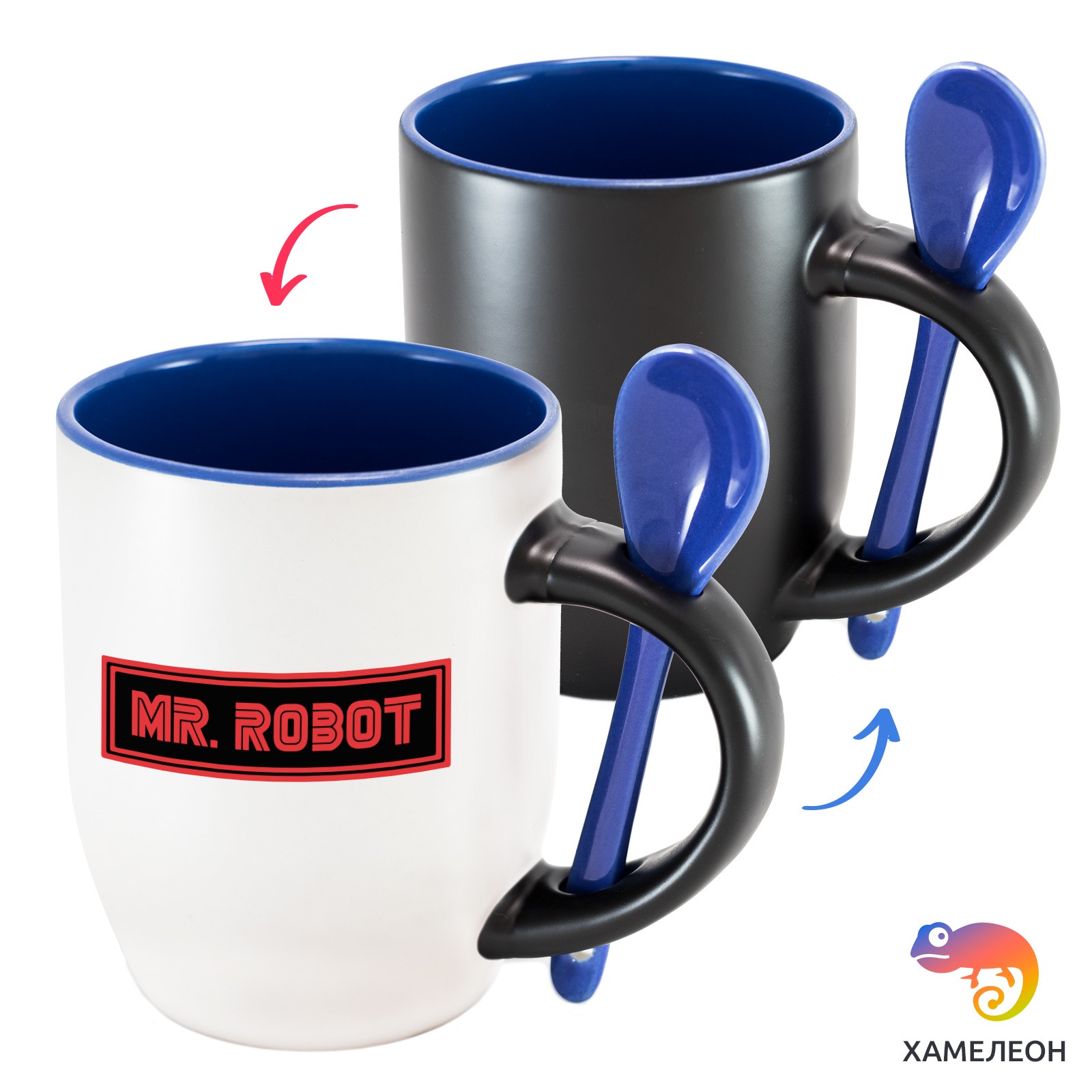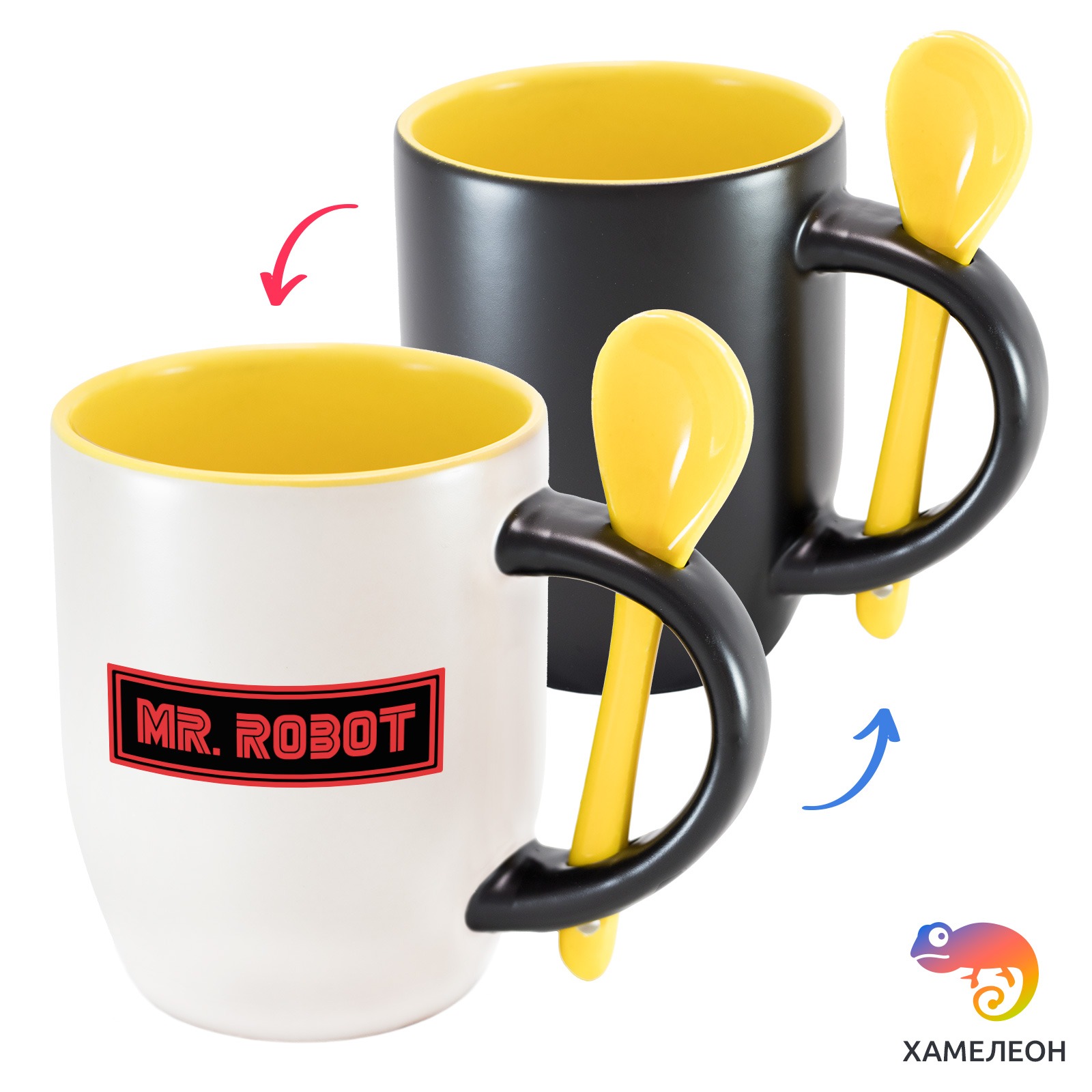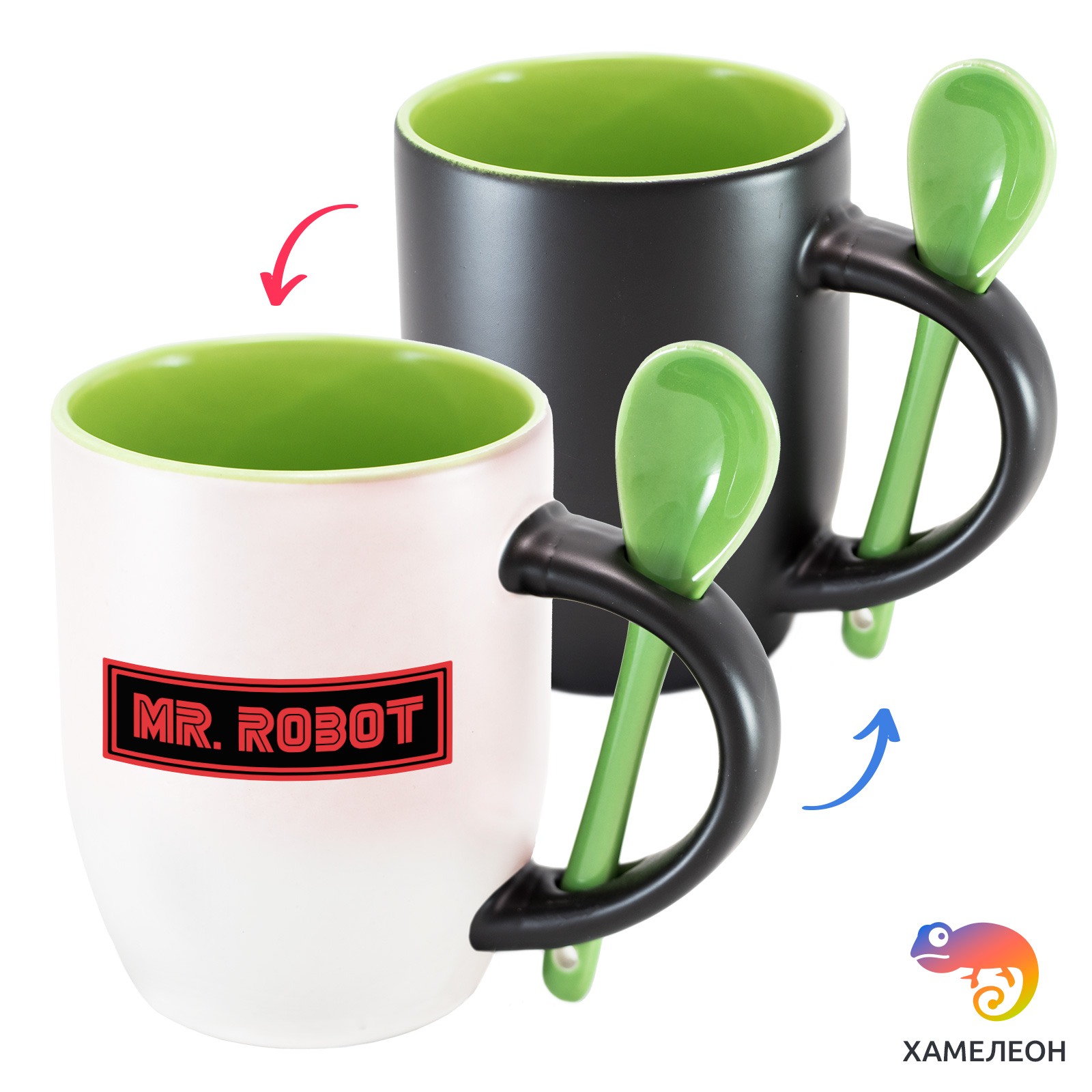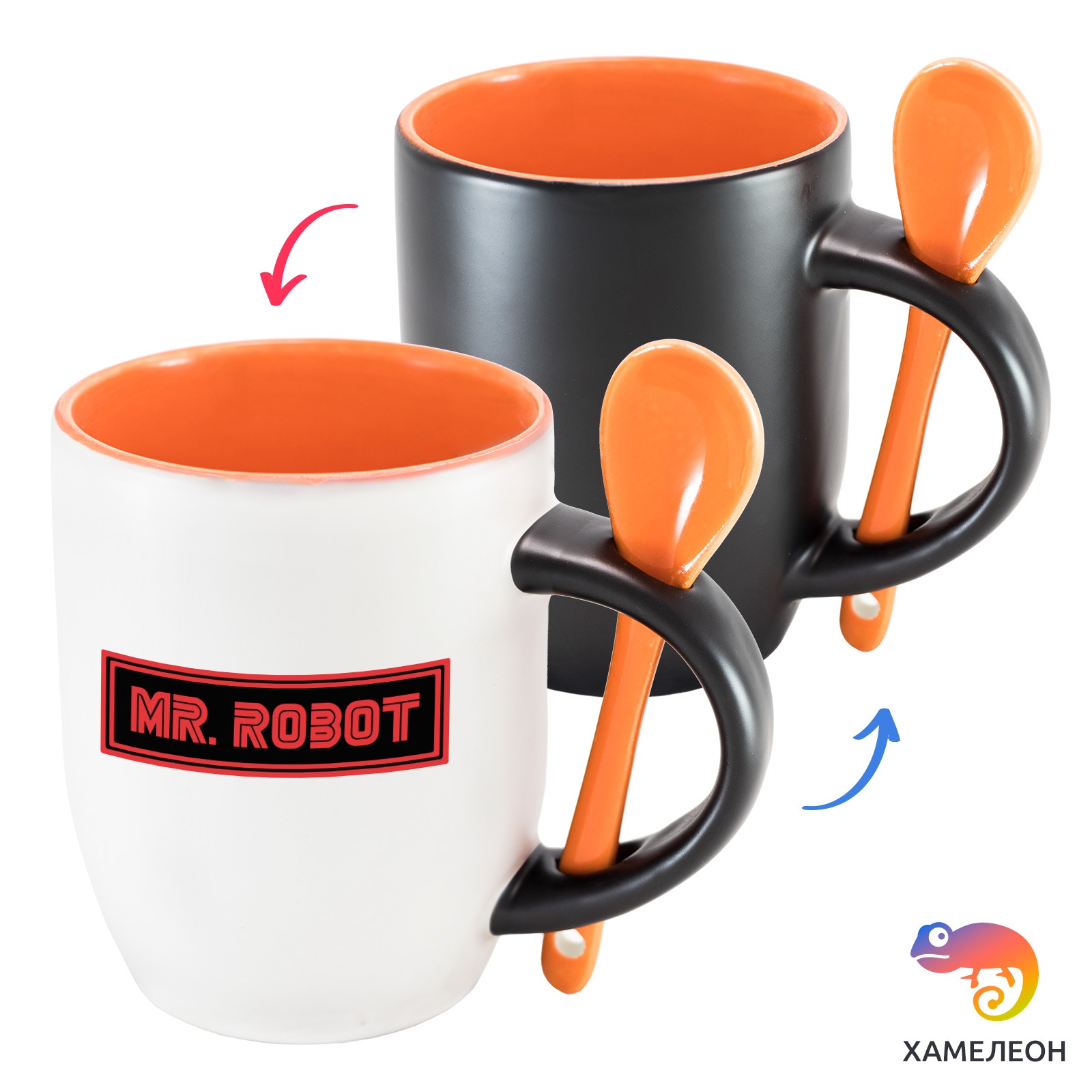 Кружка с принтом является отличным подарком коллеге, другу или самому себе ?Оригинальная кружка хамелеон Mr. Robot с ложкой приукрасит ваши будни или станет отличным подарком. Кружка изготовлена из высококачественной керамики, а специальный термопегментный слой позволяет ей менять цвет, в зависимости от температуры. Изначально кружка имеет черную заливку, которая становится белой, когда вы наливаете кипяток. Термопегменты становятся прозрачными, начиная с 50°C. Под черным пегментным слоем скрываются необычные рисунки, которые удивят многих.