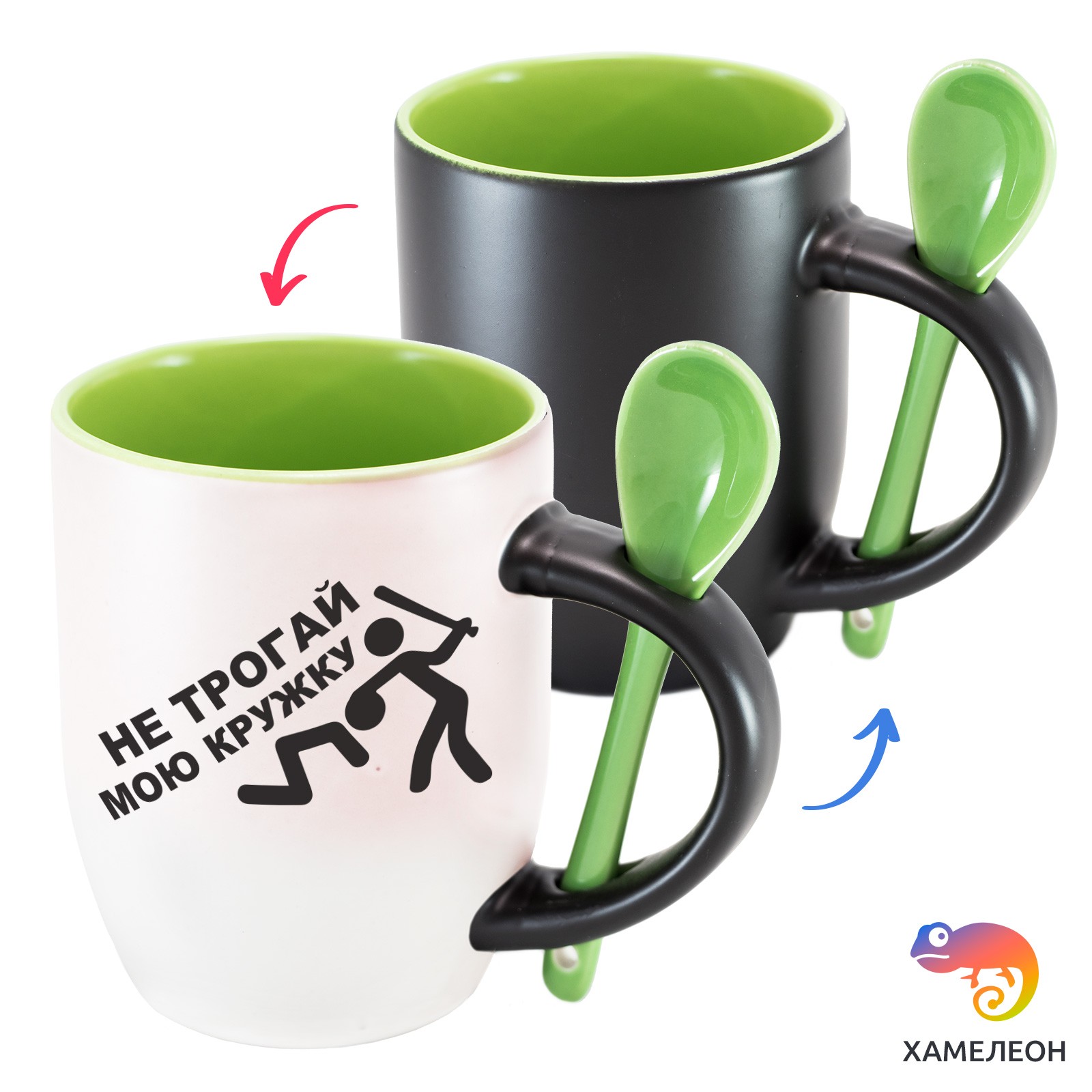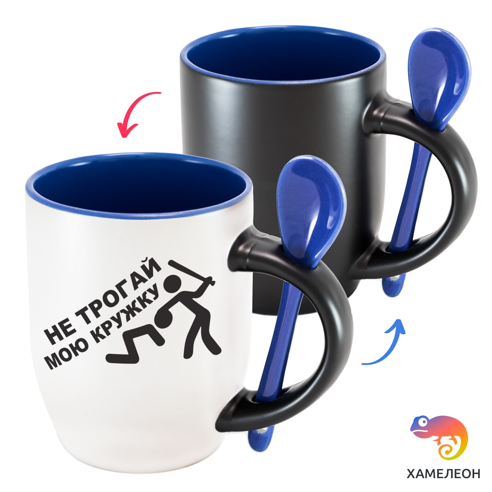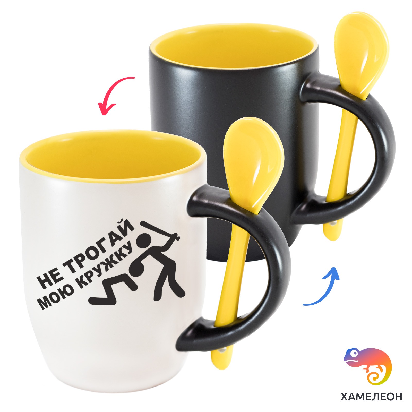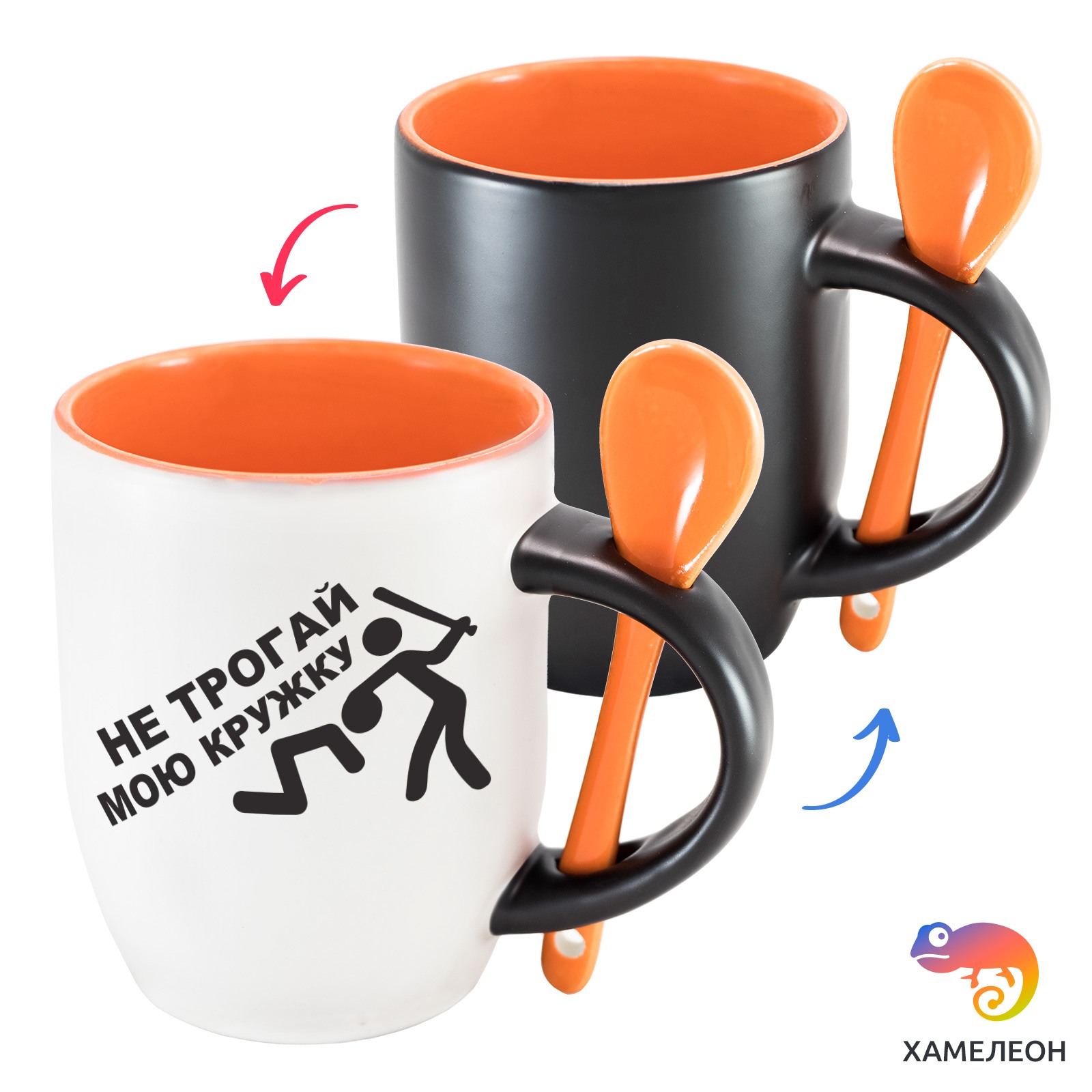 Кружка с принтом является отличным подарком коллеге, другу или самому себе ?Оригинальная кружка хамелеон «Не трогай мою кружку!» с ложкой приукрасит ваши будни или станет отличным подарком. Кружка изготовлена из высококачественной керамики, а специальный термопегментный слой позволяет ей менять цвет, в зависимости от температуры. Изначально кружка имеет черную заливку, которая становится белой, когда вы наливаете кипяток. Термопегменты становятся прозрачными, начиная с 50°C. Под черным пегментным слоем скрываются необычные рисунки, которые удивят многих.