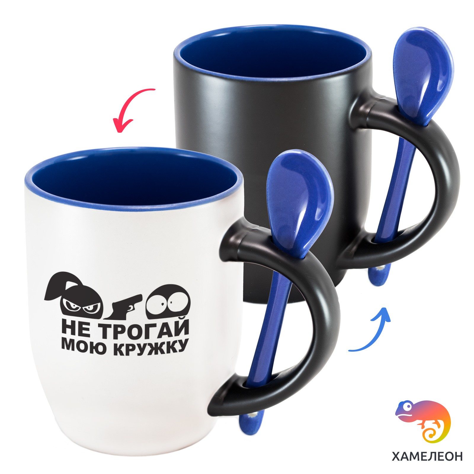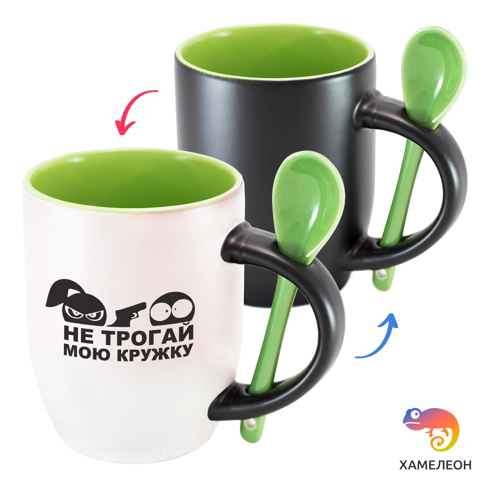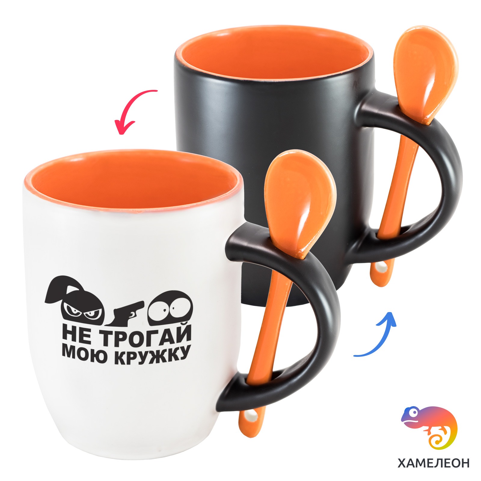 Кружка с принтом является отличным подарком коллеге, другу или самому себе ?Оригинальная кружка хамелеон «Не трогай мою кружку» с ложкой приукрасит ваши будни или станет отличным подарком. Кружка изготовлена из высококачественной керамики, а специальный термопегментный слой позволяет ей менять цвет, в зависимости от температуры. Изначально кружка имеет черную заливку, которая становится белой, когда вы наливаете кипяток. Термопегменты становятся прозрачными, начиная с 50°C. Под черным пегментным слоем скрываются необычные рисунки, которые удивят многих.