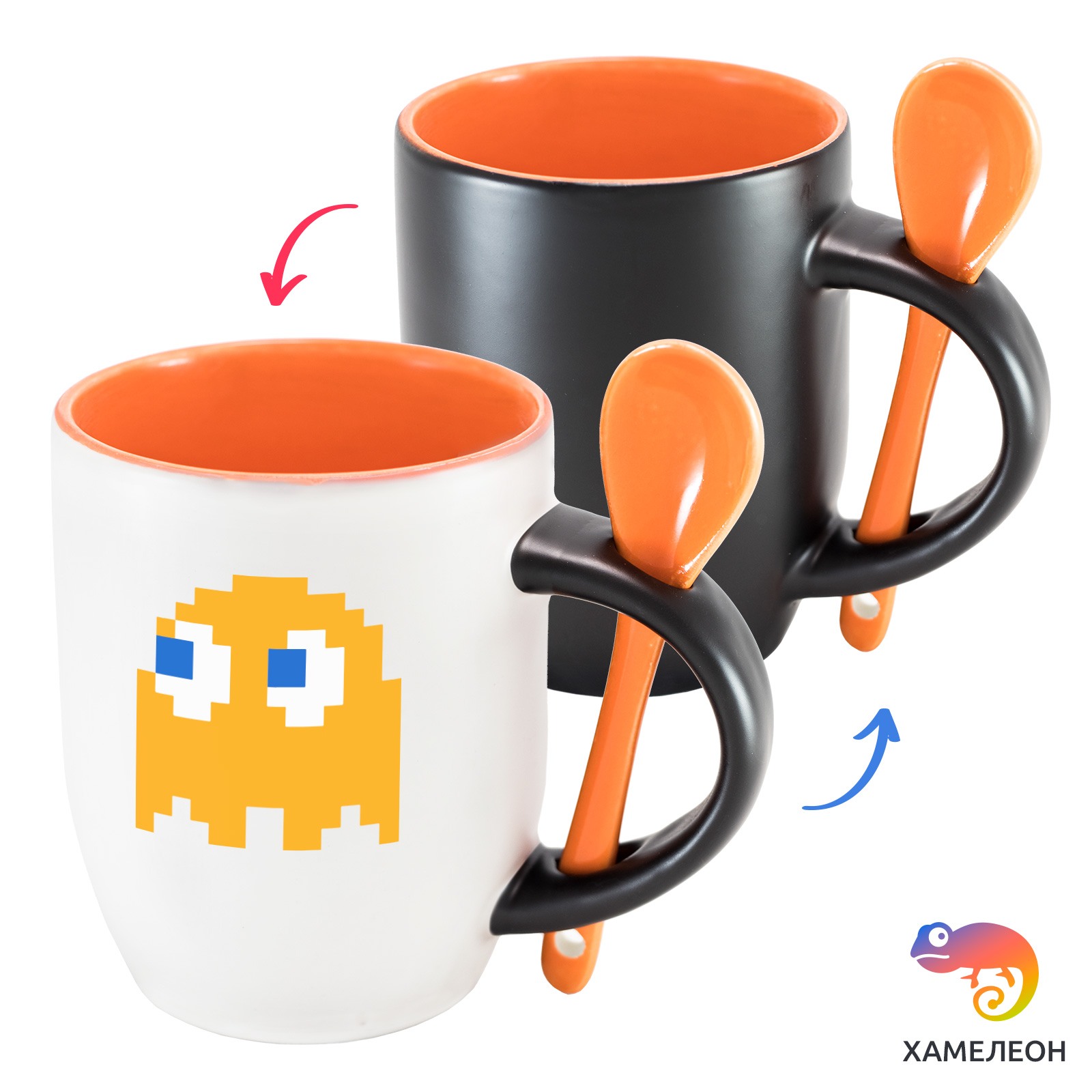 Кружка с принтом является отличным подарком коллеге, другу или самому себе ?Оригинальная кружка хамелеон Pacman с ложкой приукрасит ваши будни или станет отличным подарком. Кружка изготовлена из высококачественной керамики, а специальный термопегментный слой позволяет ей менять цвет, в зависимости от температуры. Изначально кружка имеет черную заливку, которая становится белой, когда вы наливаете кипяток. Термопегменты становятся прозрачными, начиная с 50°C. Под черным пегментным слоем скрываются необычные рисунки, которые удивят многих.