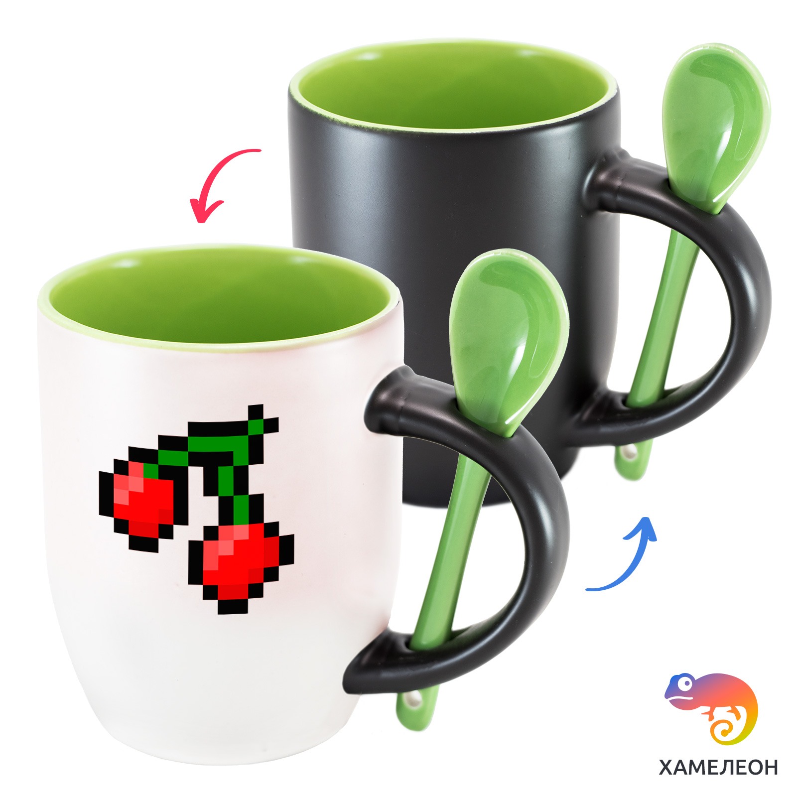 Кружка с принтом является отличным подарком коллеге, другу или самому себе ?Оригинальная кружка хамелеон Pacman Cherry с ложкой приукрасит ваши будни или станет отличным подарком. Кружка изготовлена из высококачественной керамики, а специальный термопегментный слой позволяет ей менять цвет, в зависимости от температуры. Изначально кружка имеет черную заливку, которая становится белой, когда вы наливаете кипяток. Термопегменты становятся прозрачными, начиная с 50°C. Под черным пегментным слоем скрываются необычные рисунки, которые удивят многих.