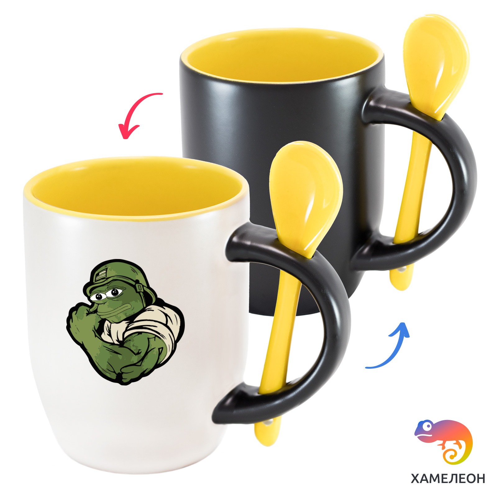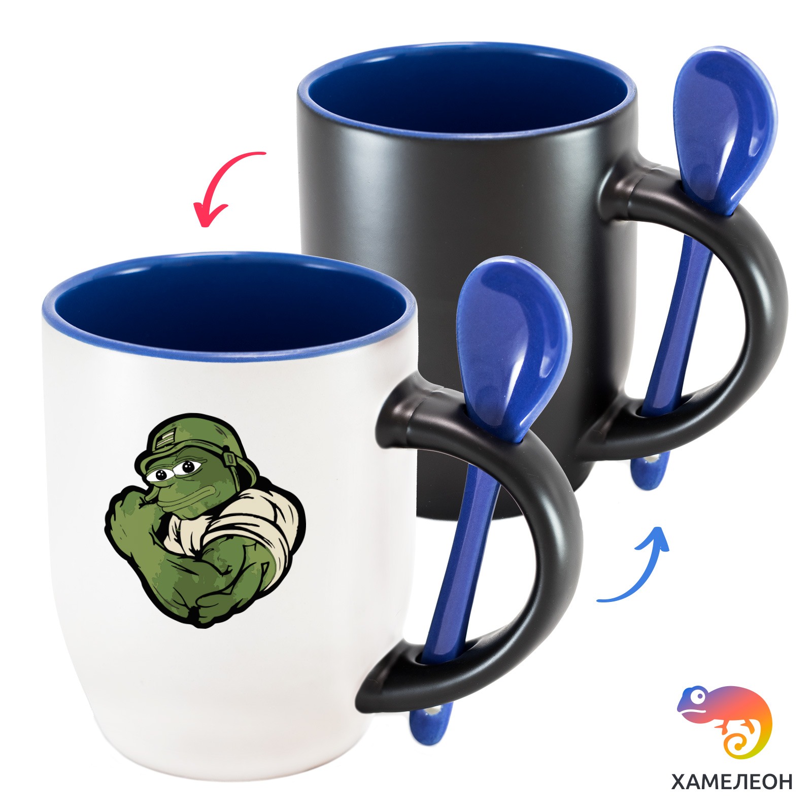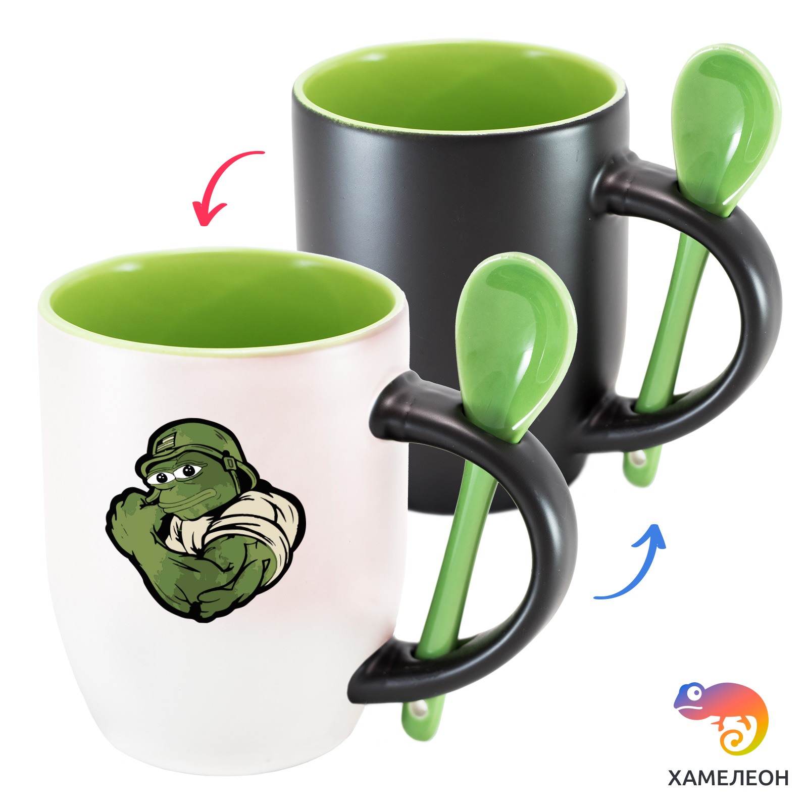 Кружка с принтом является отличным подарком коллеге, другу или самому себе ?Оригинальная кружка хамелеон Pepe Soldier с ложкой приукрасит ваши будни или станет отличным подарком. Кружка изготовлена из высококачественной керамики, а специальный термопегментный слой позволяет ей менять цвет, в зависимости от температуры. Изначально кружка имеет черную заливку, которая становится белой, когда вы наливаете кипяток. Термопегменты становятся прозрачными, начиная с 50°C. Под черным пегментным слоем скрываются необычные рисунки, которые удивят многих.