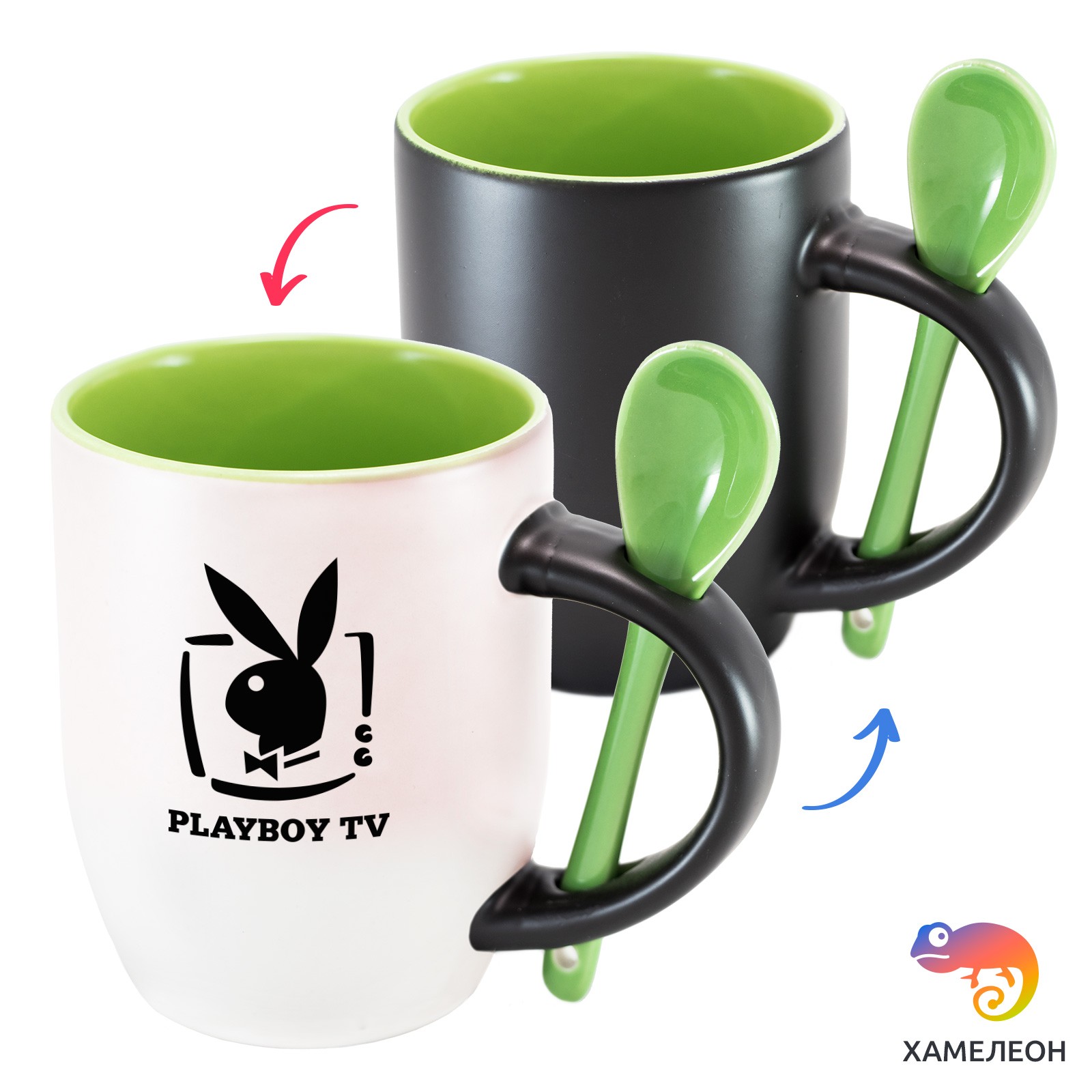 Кружка с принтом является отличным подарком коллеге, другу или самому себе ?Оригинальная кружка хамелеон Playboy TV с ложкой приукрасит ваши будни или станет отличным подарком. Кружка изготовлена из высококачественной керамики, а специальный термопегментный слой позволяет ей менять цвет, в зависимости от температуры. Изначально кружка имеет черную заливку, которая становится белой, когда вы наливаете кипяток. Термопегменты становятся прозрачными, начиная с 50°C. Под черным пегментным слоем скрываются необычные рисунки, которые удивят многих.