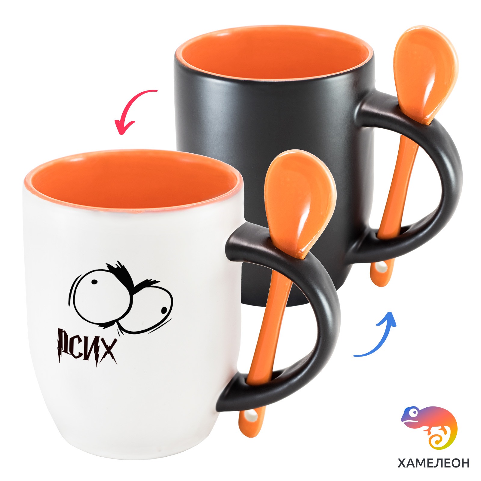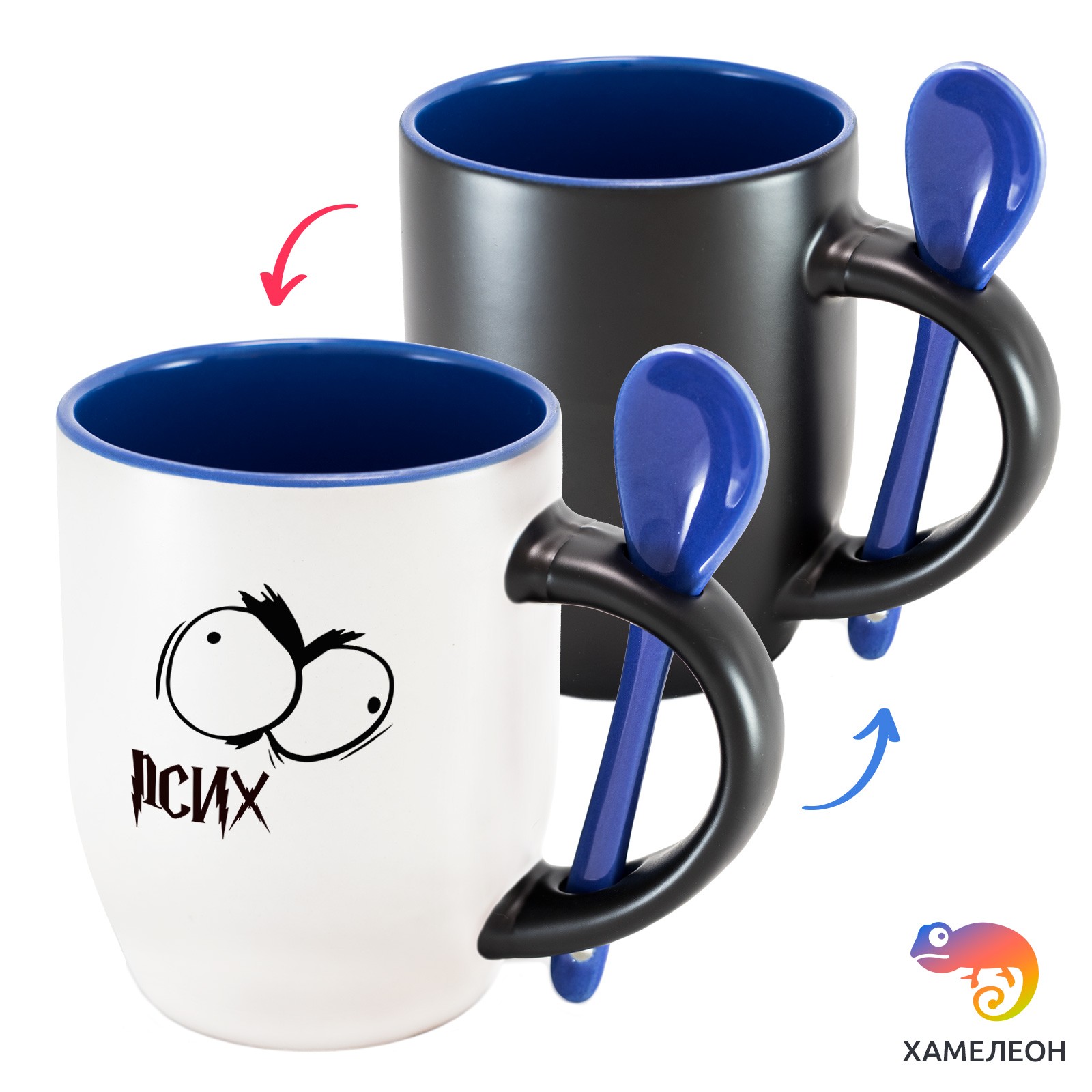 Кружка с принтом является отличным подарком коллеге, другу или самому себе ?Оригинальная кружка хамелеон «Псих» с ложкой приукрасит ваши будни или станет отличным подарком. Кружка изготовлена из высококачественной керамики, а специальный термопегментный слой позволяет ей менять цвет, в зависимости от температуры. Изначально кружка имеет черную заливку, которая становится белой, когда вы наливаете кипяток. Термопегменты становятся прозрачными, начиная с 50°C. Под черным пегментным слоем скрываются необычные рисунки, которые удивят многих.