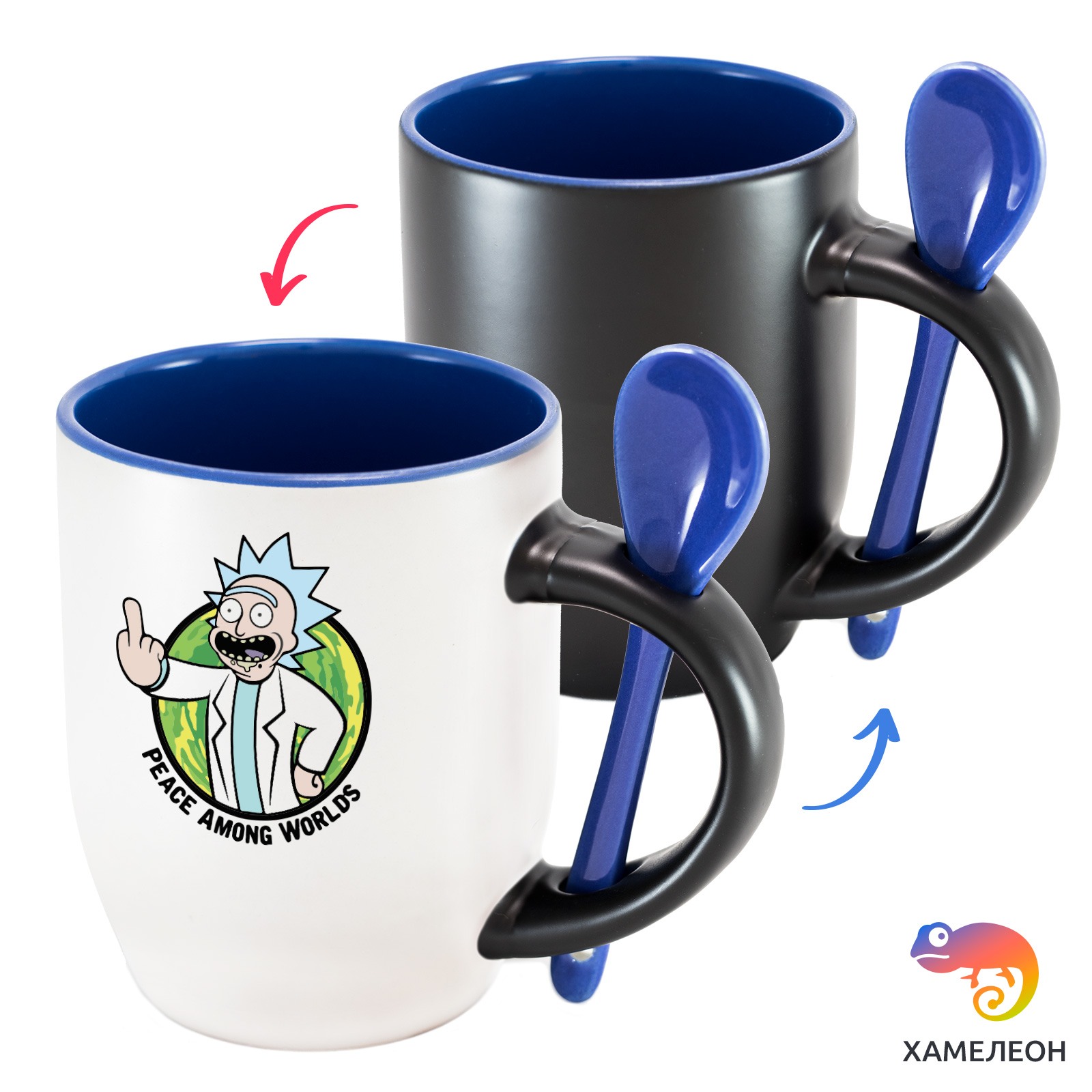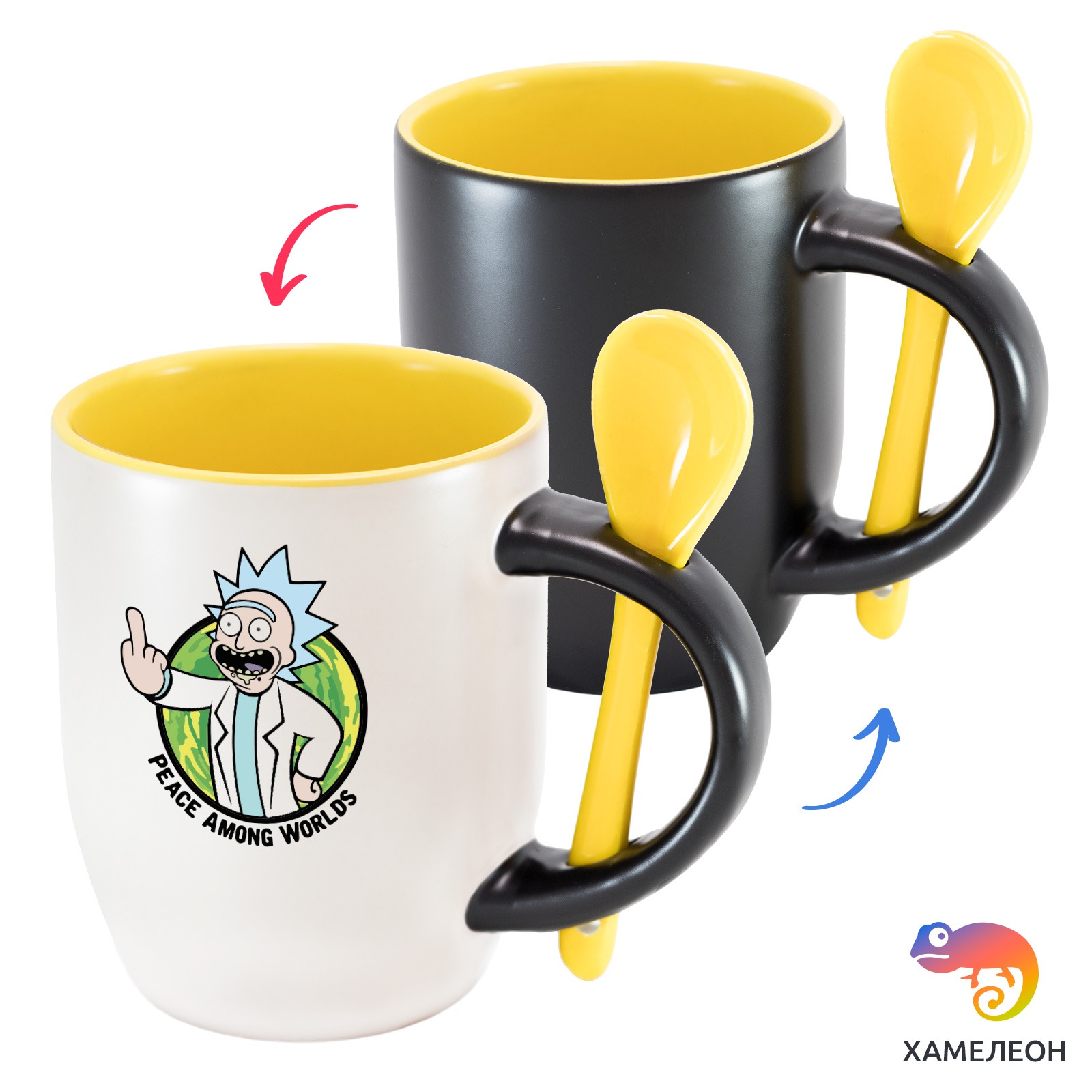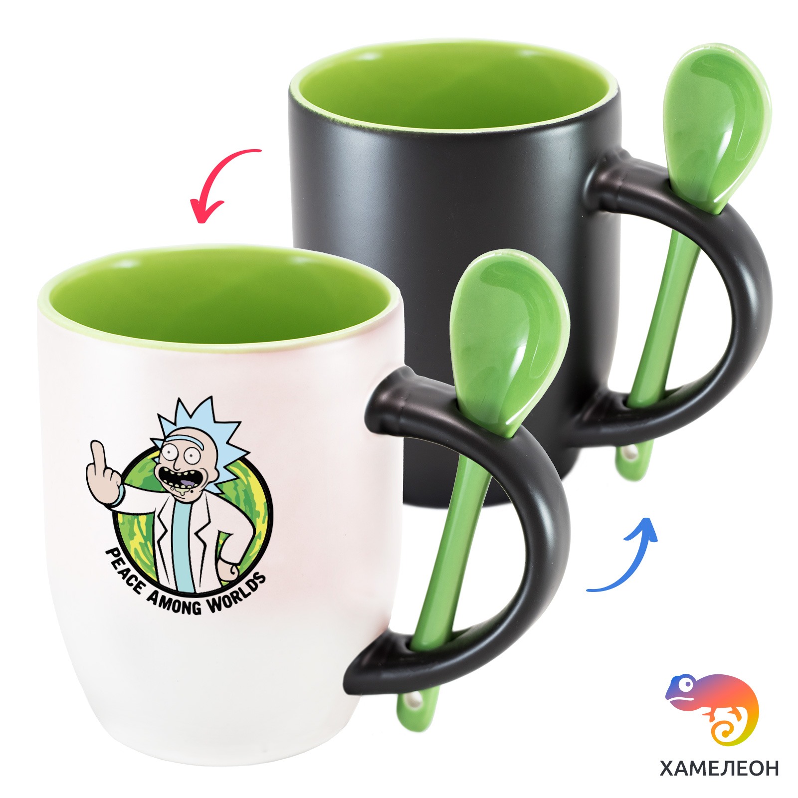 Кружка с принтом является отличным подарком коллеге, другу или самому себе ?Оригинальная кружка хамелеон Rick - Peace Among Worlds с ложкой приукрасит ваши будни или станет отличным подарком. Кружка изготовлена из высококачественной керамики, а специальный термопегментный слой позволяет ей менять цвет, в зависимости от температуры. Изначально кружка имеет черную заливку, которая становится белой, когда вы наливаете кипяток. Термопегменты становятся прозрачными, начиная с 50°C. Под черным пегментным слоем скрываются необычные рисунки, которые удивят многих.