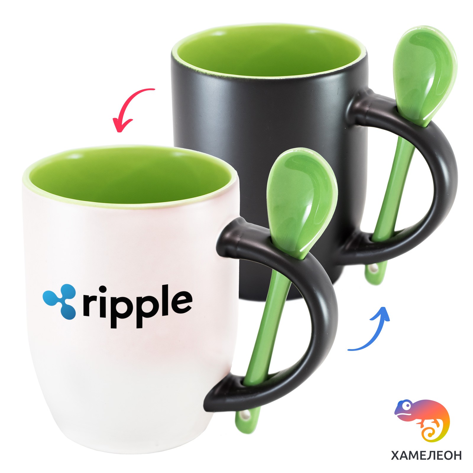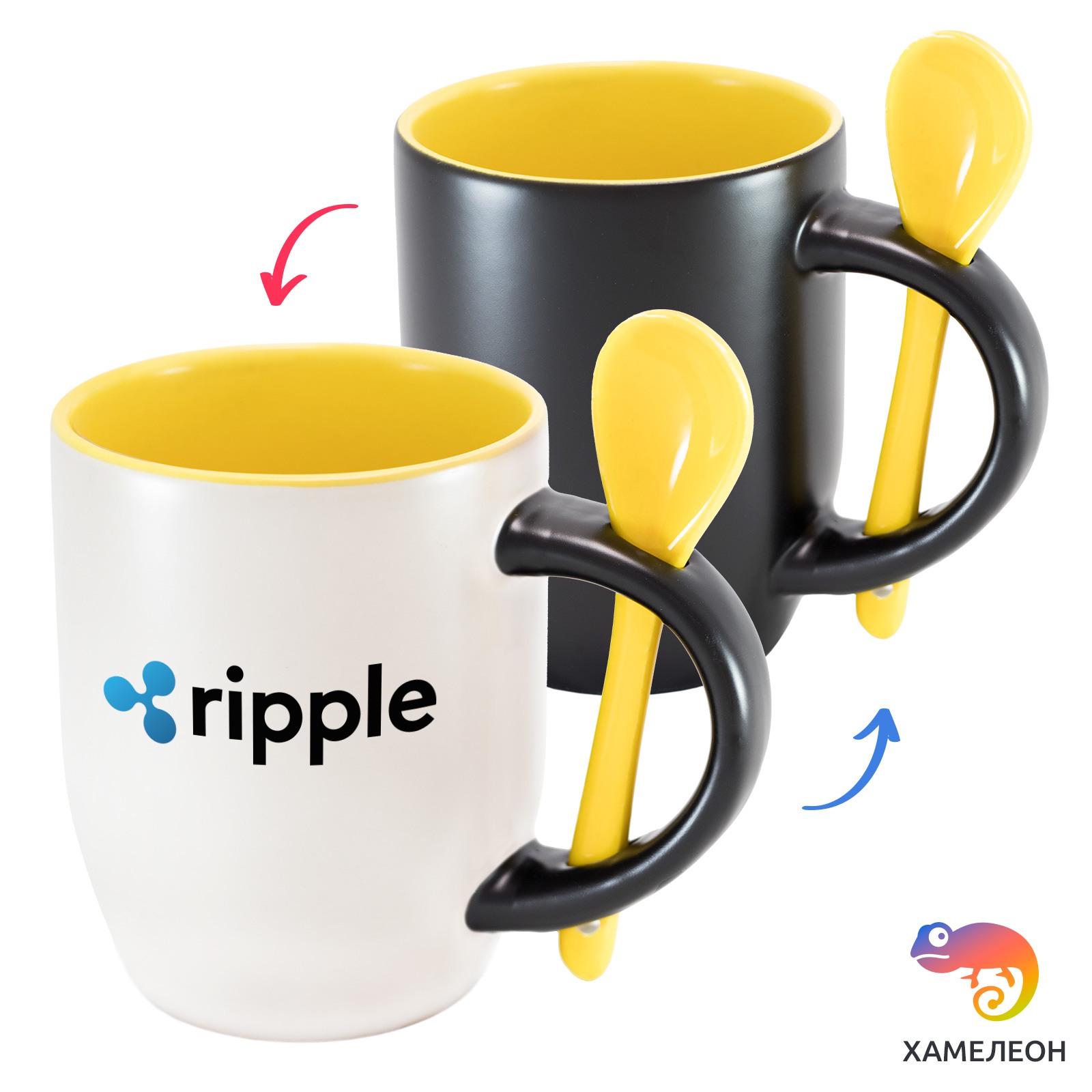 Кружка с принтом является отличным подарком коллеге, другу или самому себе ?Оригинальная кружка хамелеон Ripple (криптовалюта) с ложкой приукрасит ваши будни или станет отличным подарком. Кружка изготовлена из высококачественной керамики, а специальный термопегментный слой позволяет ей менять цвет, в зависимости от температуры. Изначально кружка имеет черную заливку, которая становится белой, когда вы наливаете кипяток. Термопегменты становятся прозрачными, начиная с 50°C. Под черным пегментным слоем скрываются необычные рисунки, которые удивят многих.