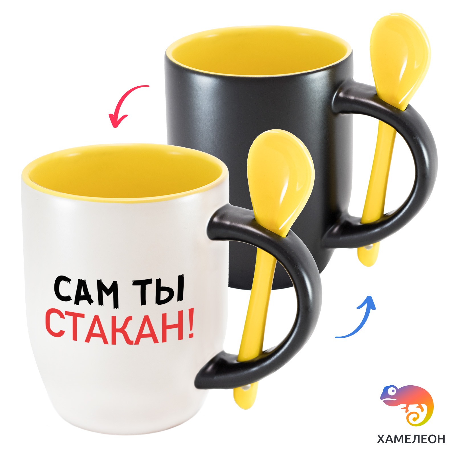 Кружка с принтом является отличным подарком коллеге, другу или самому себе ?Оригинальная кружка хамелеон «Сам ты стакан!» с ложкой приукрасит ваши будни или станет отличным подарком. Кружка изготовлена из высококачественной керамики, а специальный термопегментный слой позволяет ей менять цвет, в зависимости от температуры. Изначально кружка имеет черную заливку, которая становится белой, когда вы наливаете кипяток. Термопегменты становятся прозрачными, начиная с 50°C. Под черным пегментным слоем скрываются необычные рисунки, которые удивят многих.
