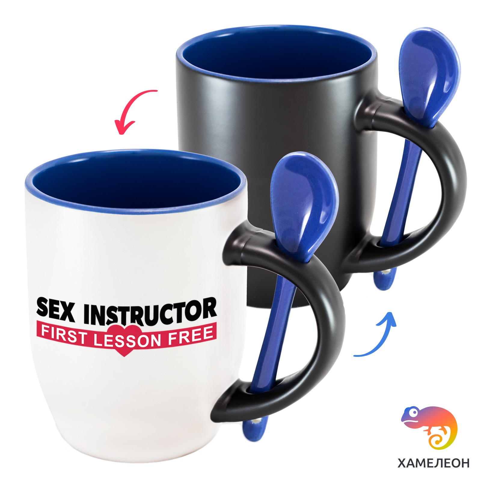 Кружка с принтом является отличным подарком коллеге, другу или самому себе ?Оригинальная кружка хамелеон Sex Instructor - first lesson is free с ложкой приукрасит ваши будни или станет отличным подарком. Кружка изготовлена из высококачественной керамики, а специальный термопегментный слой позволяет ей менять цвет, в зависимости от температуры. Изначально кружка имеет черную заливку, которая становится белой, когда вы наливаете кипяток. Термопегменты становятся прозрачными, начиная с 50°C. Под черным пегментным слоем скрываются необычные рисунки, которые удивят многих.