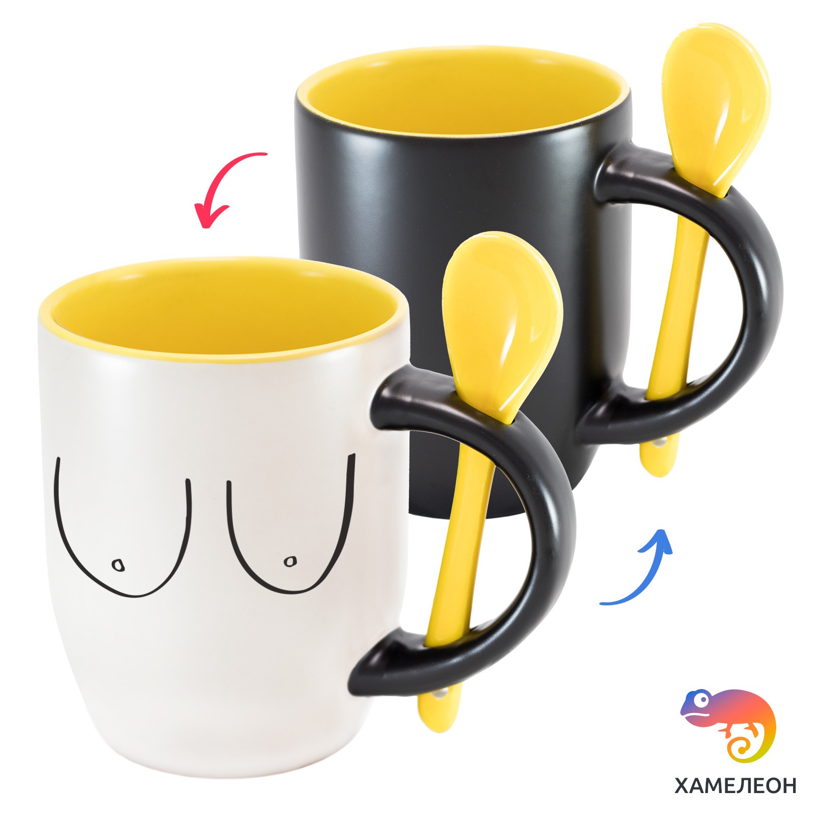 Кружка с принтом является отличным подарком коллеге, другу или самому себе ?Оригинальная кружка хамелеон «Сисюли» с ложкой приукрасит ваши будни или станет отличным подарком. Кружка изготовлена из высококачественной керамики, а специальный термопегментный слой позволяет ей менять цвет, в зависимости от температуры. Изначально кружка имеет черную заливку, которая становится белой, когда вы наливаете кипяток. Термопегменты становятся прозрачными, начиная с 50°C. Под черным пегментным слоем скрываются необычные рисунки, которые удивят многих.