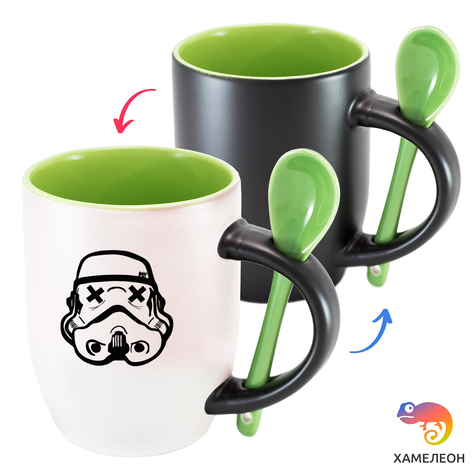 Кружка с принтом является отличным подарком коллеге, другу или самому себе ?Оригинальная кружка хамелеон Star Wars Die с ложкой приукрасит ваши будни или станет отличным подарком. Кружка изготовлена из высококачественной керамики, а специальный термопегментный слой позволяет ей менять цвет, в зависимости от температуры. Изначально кружка имеет черную заливку, которая становится белой, когда вы наливаете кипяток. Термопегменты становятся прозрачными, начиная с 50°C. Под черным пегментным слоем скрываются необычные рисунки, которые удивят многих.