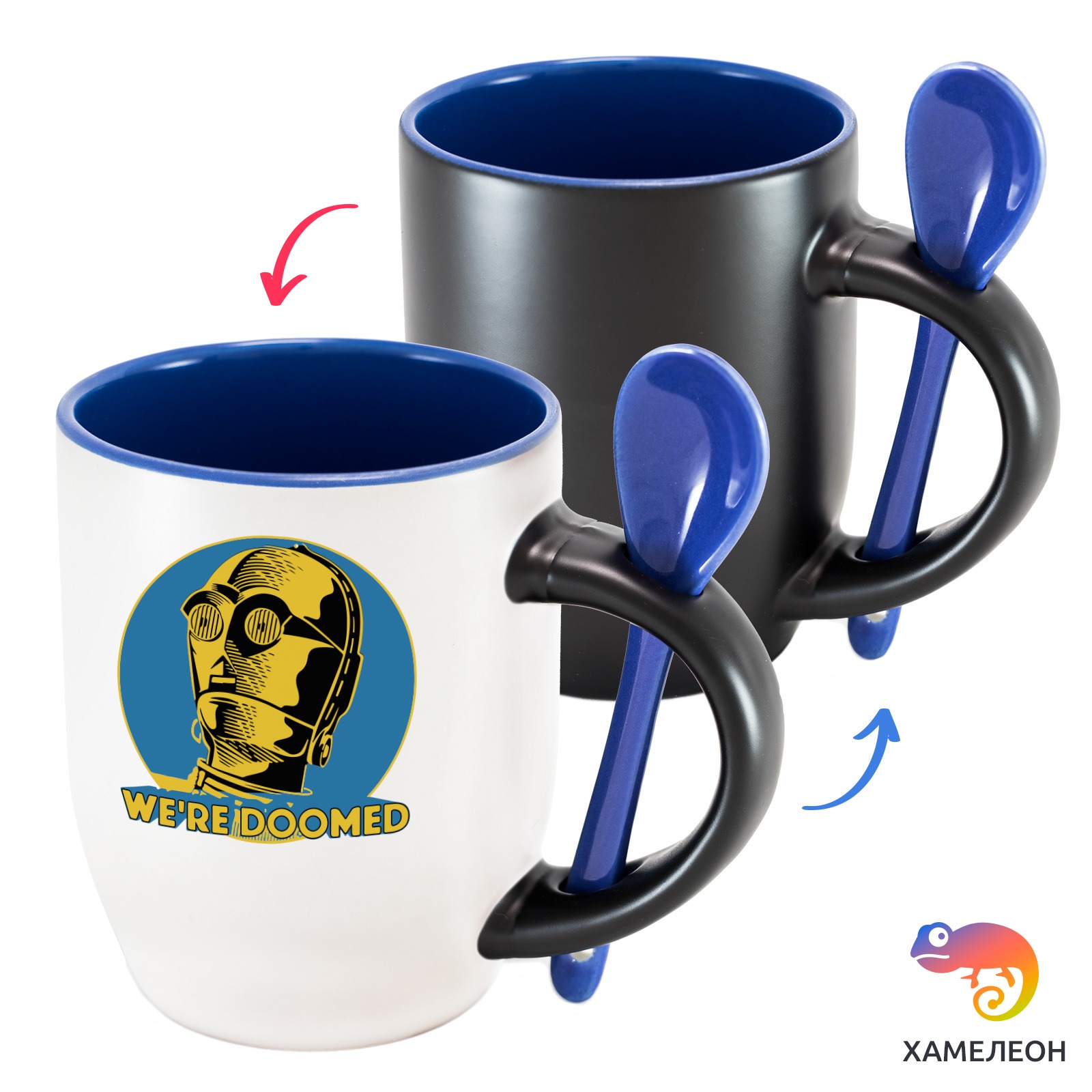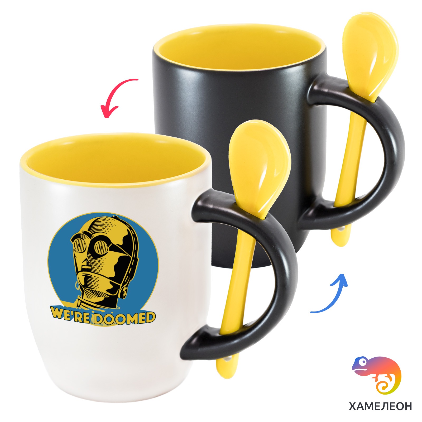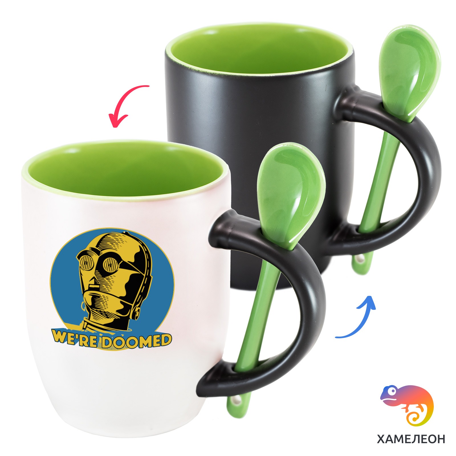 Кружка с принтом является отличным подарком коллеге, другу или самому себе ?Оригинальная кружка хамелеон Star Wars - We Are Doomed с ложкой приукрасит ваши будни или станет отличным подарком. Кружка изготовлена из высококачественной керамики, а специальный термопегментный слой позволяет ей менять цвет, в зависимости от температуры. Изначально кружка имеет черную заливку, которая становится белой, когда вы наливаете кипяток. Термопегменты становятся прозрачными, начиная с 50°C. Под черным пегментным слоем скрываются необычные рисунки, которые удивят многих.