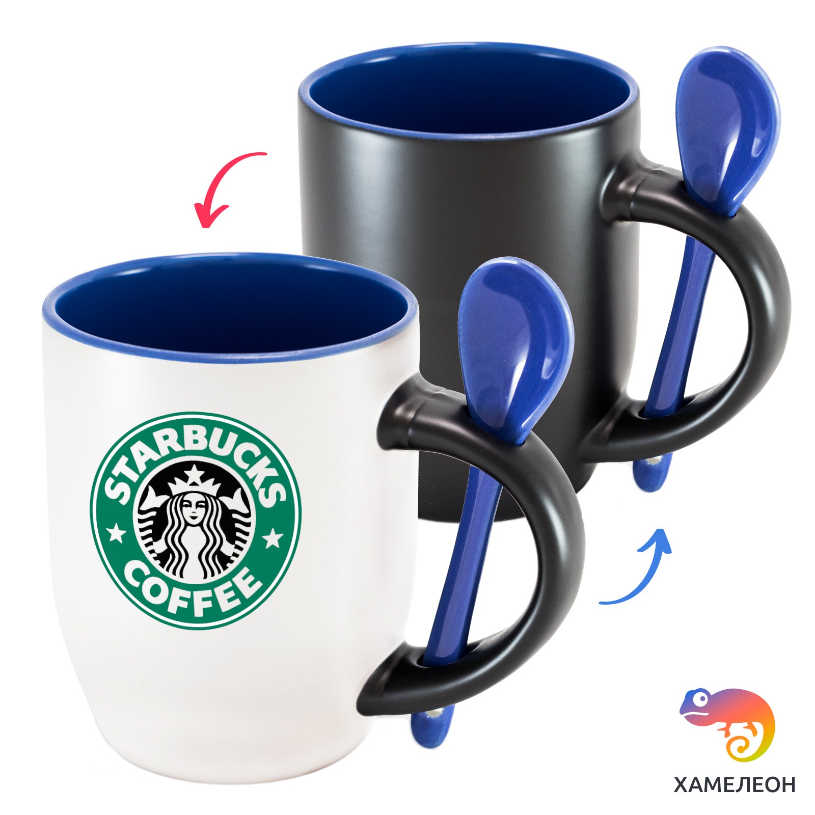 Кружка с принтом является отличным подарком коллеге, другу или самому себе ?Оригинальная кружка хамелеон Starbucks Coffee ложкой приукрасит ваши будни или станет отличным подарком. Кружка изготовлена из высококачественной керамики, а специальный термопегментный слой позволяет ей менять цвет, в зависимости от температуры. Изначально кружка имеет черную заливку, которая становится белой, когда вы наливаете кипяток. Термопегменты становятся прозрачными, начиная с 50°C. Под черным пегментным слоем скрываются необычные рисунки, которые удивят многих.